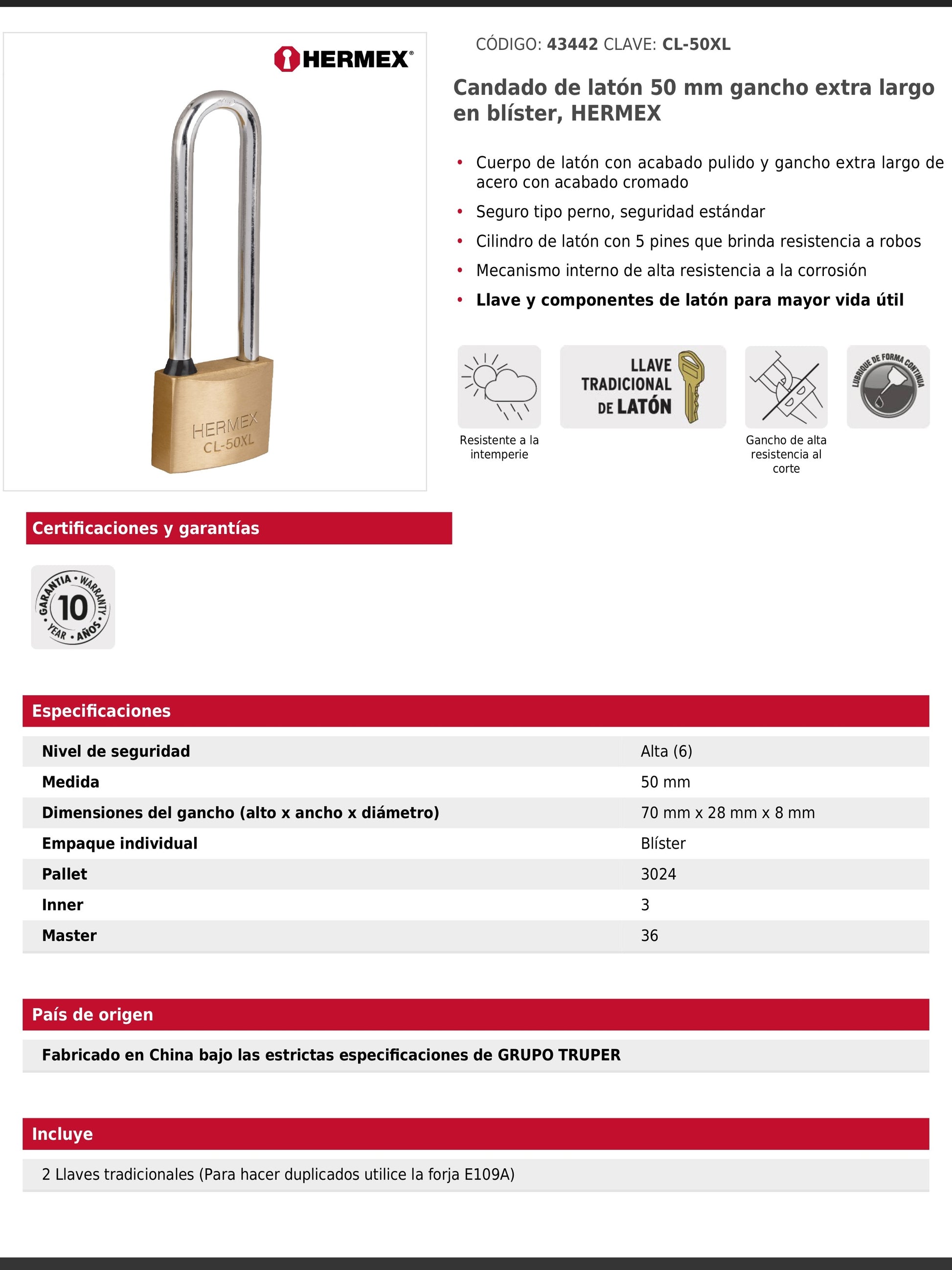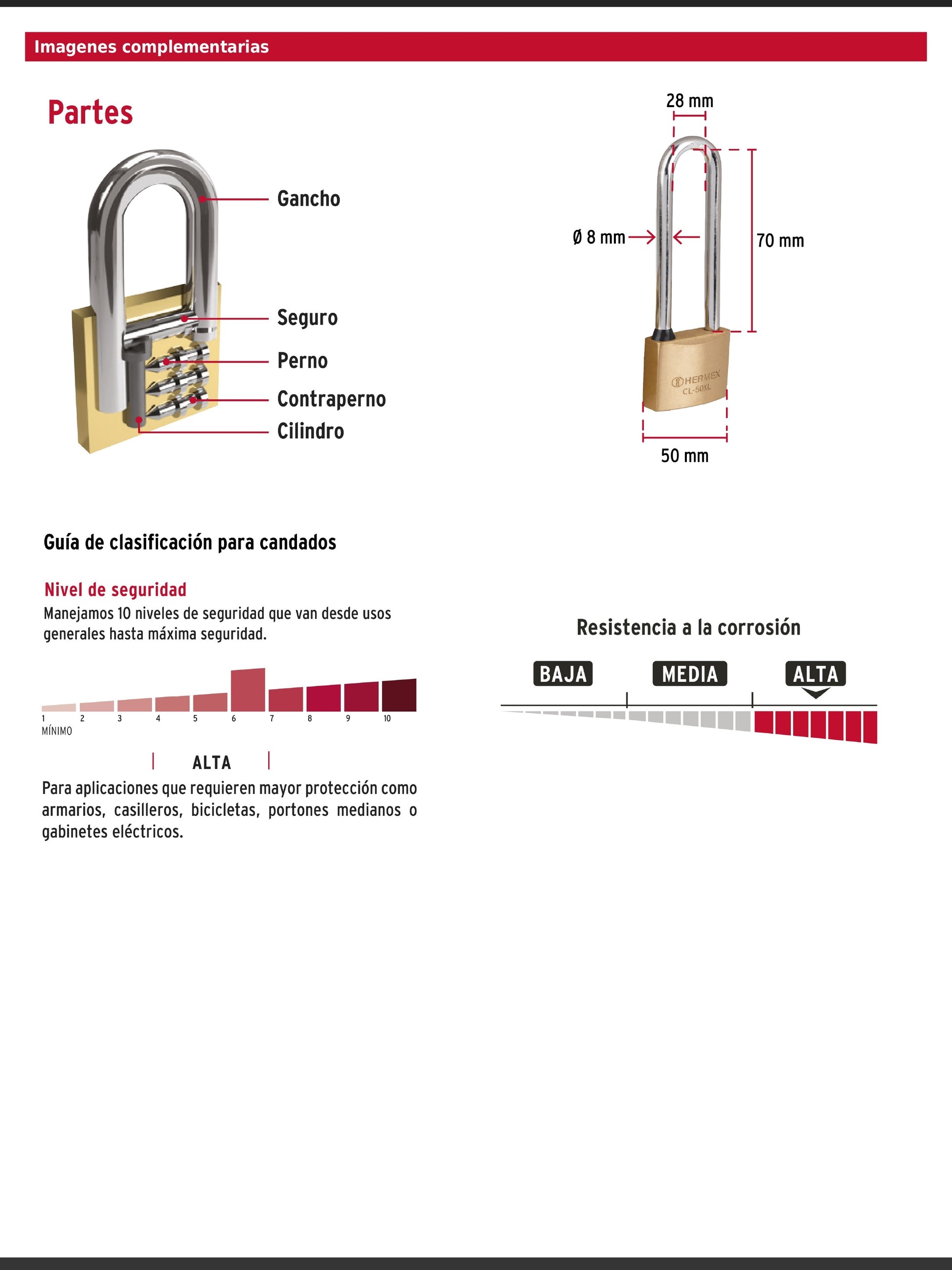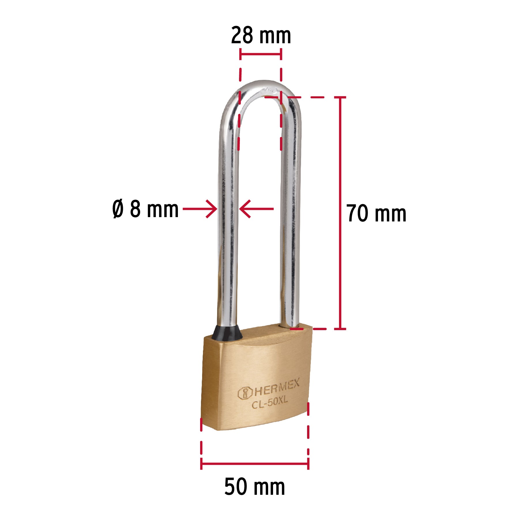 Candado de latón con acabado pulido y gancho extra largo de acero cromado. Incorpora seguro tipo perno estándar, cilindro de latón con 5 pines y mecanismo interno anticorrosión. Sus componentes de latón aseguran mayor vida útil y resistencia a la intemperie.