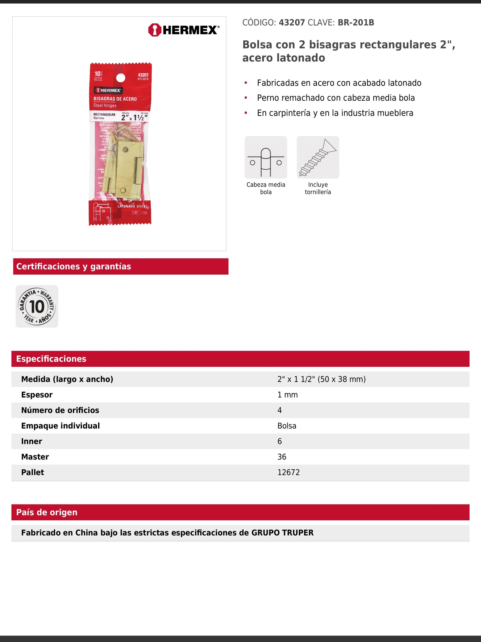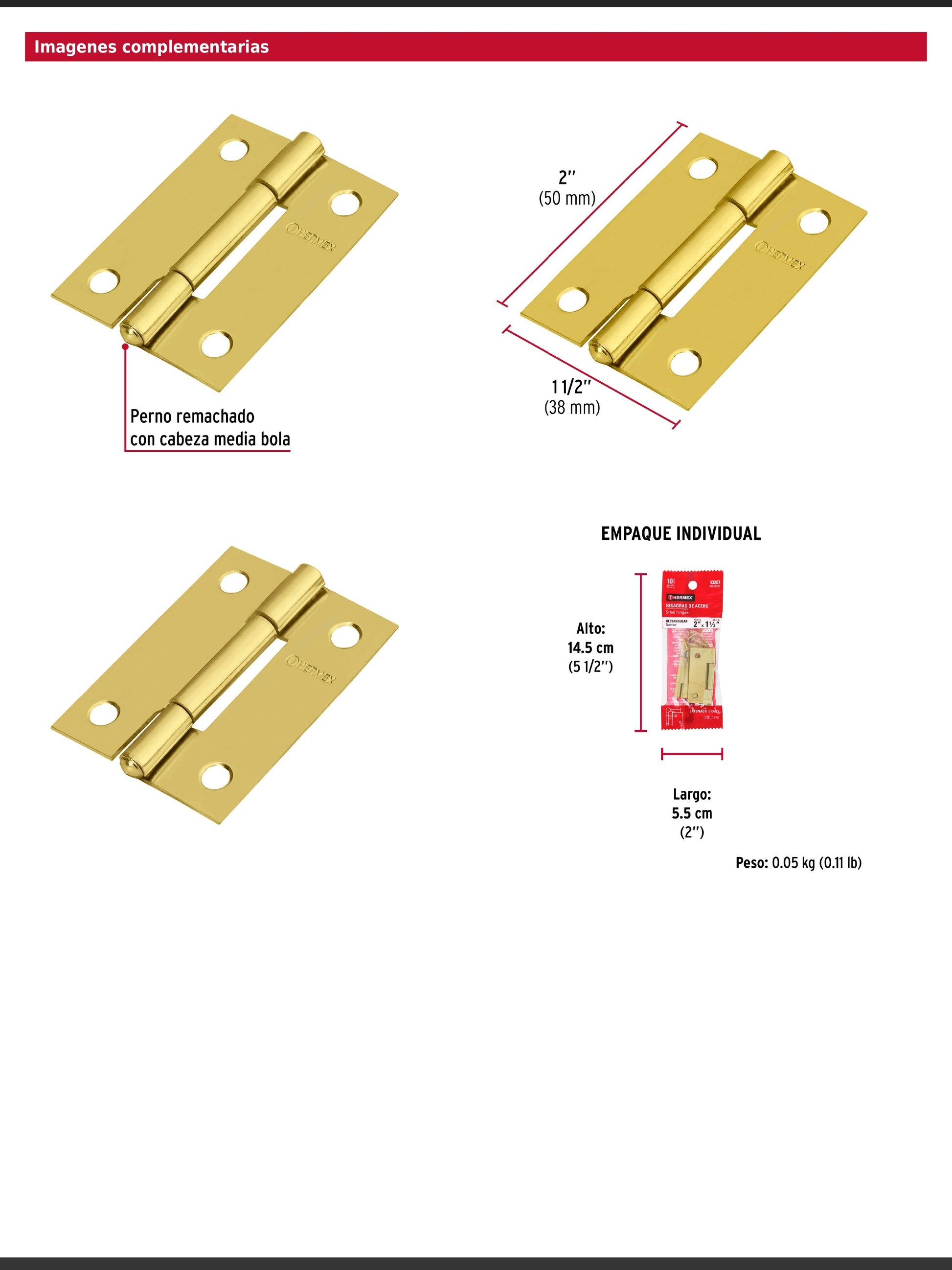 Bisagras fabricadas en acero con acabado latonado, con perno remachado y cabeza media bola. Especiales para carpintería y la industria mueblera, se presentan en bolsa con 2 piezas e incluyen tornillería para su instalación.