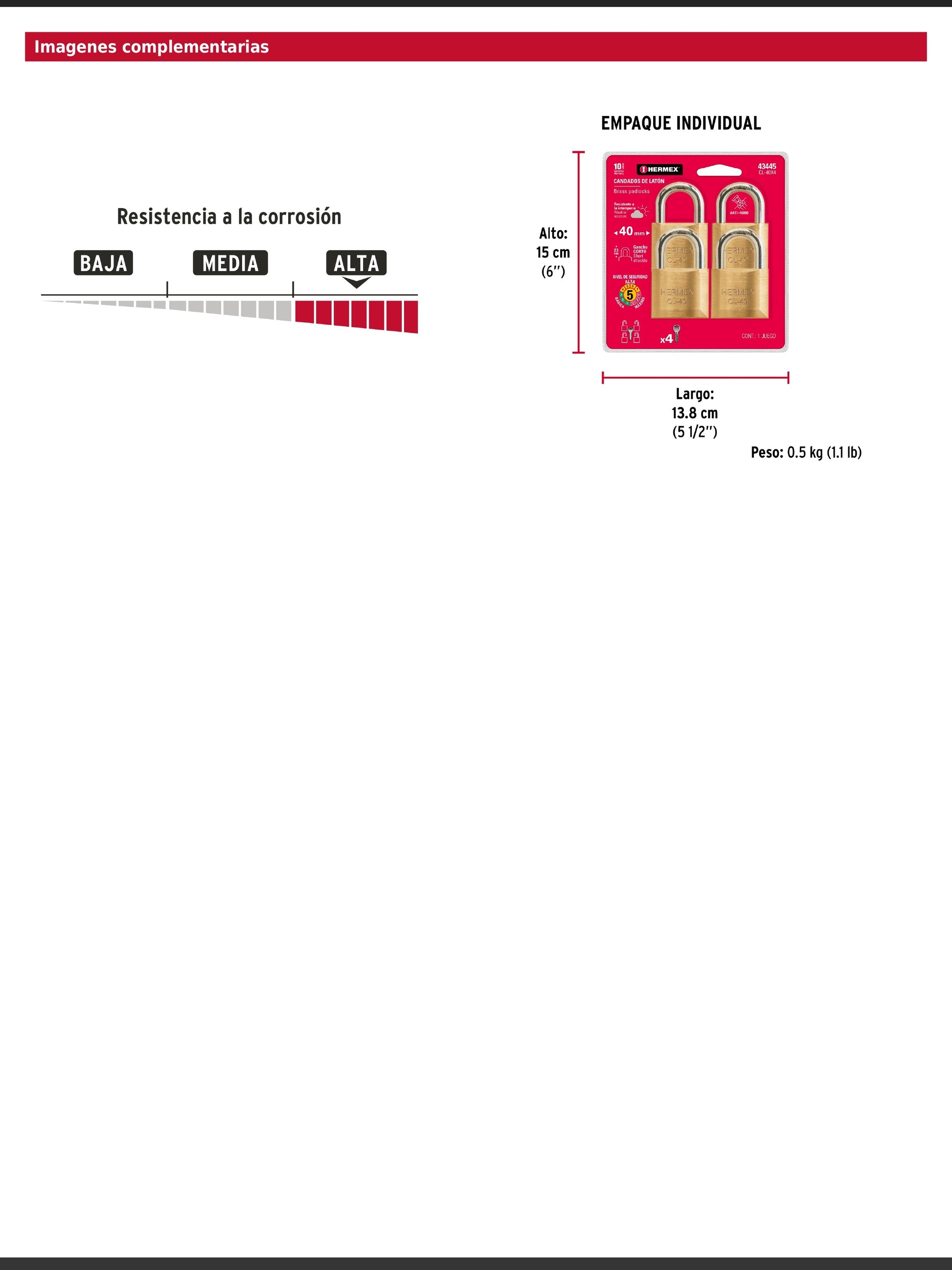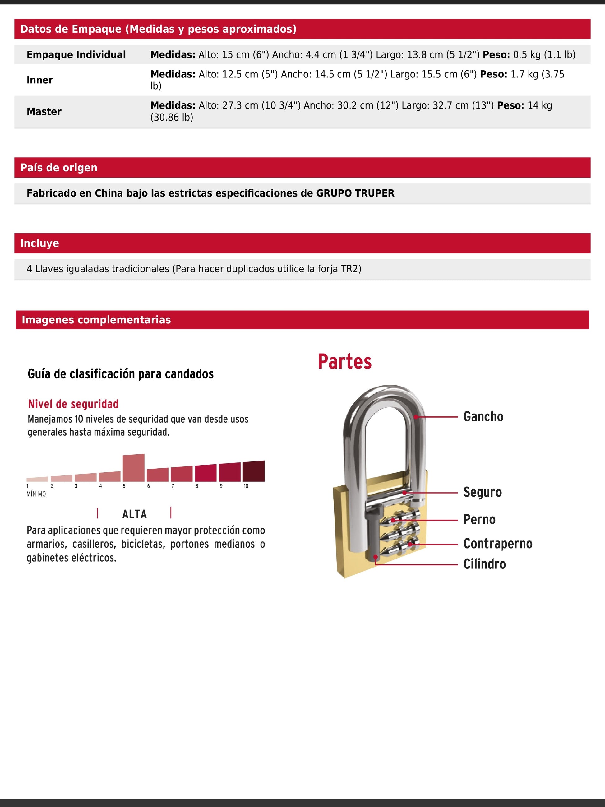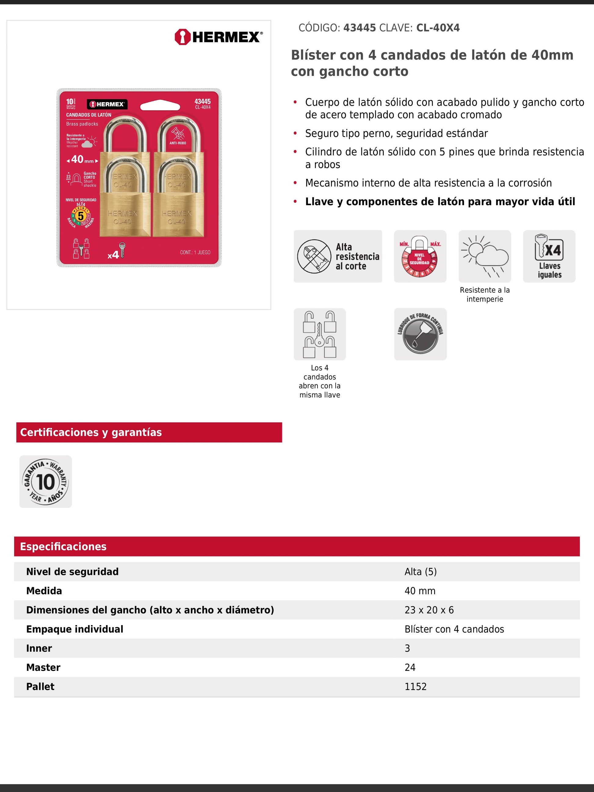 Candados con cuerpo de latón sólido acabado pulido y gancho corto de acero templado cromado. Tienen seguro tipo perno con seguridad estándar y cilindro de latón sólido con 5 pines que brinda resistencia a robos. Incorporan mecanismo interno de alta resistencia a la corrosión y componentes de latón junto con llaves tradicionales para mayor vida útil. Los 4 candados abren con la misma llave y son resistentes a la intemperie.