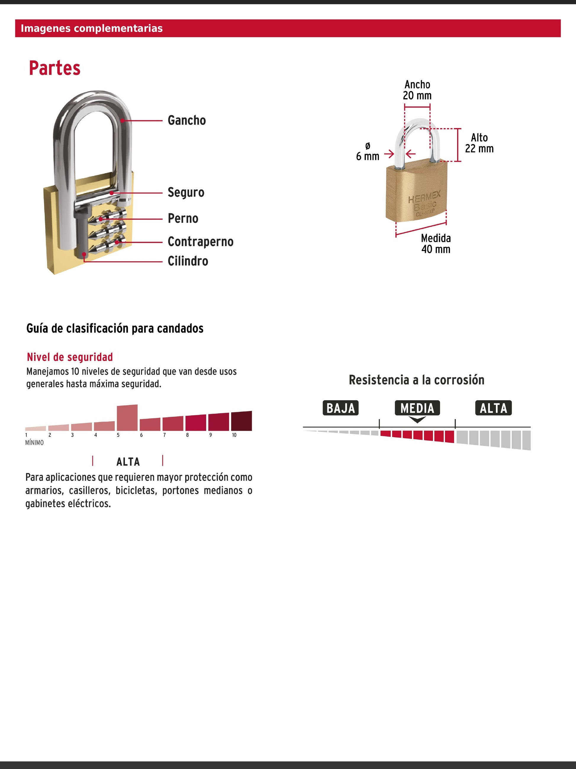 Candado de latón con acabado pulido y gancho corto de acero cromado. Cuenta con seguro tipo perno estándar, cilindro de latón con 12 pines y mecanismo interno anticorrosión. Ofrece alta resistencia a robos y durabilidad, además de ser resistente a la intemperie.