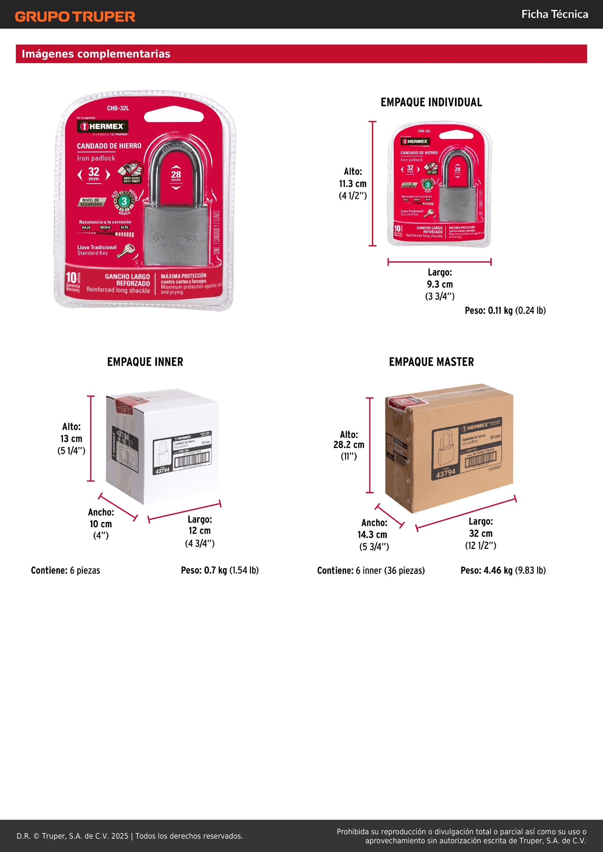 Candado de hierro en una sola pieza con acabado resistente y gancho largo reforzado de acero cromado. Dispone de un cilindro de latón sólido con 5 pines y seguro tipo perno estándar que brindan mayor resistencia a robos. Su mecanismo interno es resistente a la corrosión e incluye 2 llaves tradicionales. Se presenta en empaque individual tipo blíster.