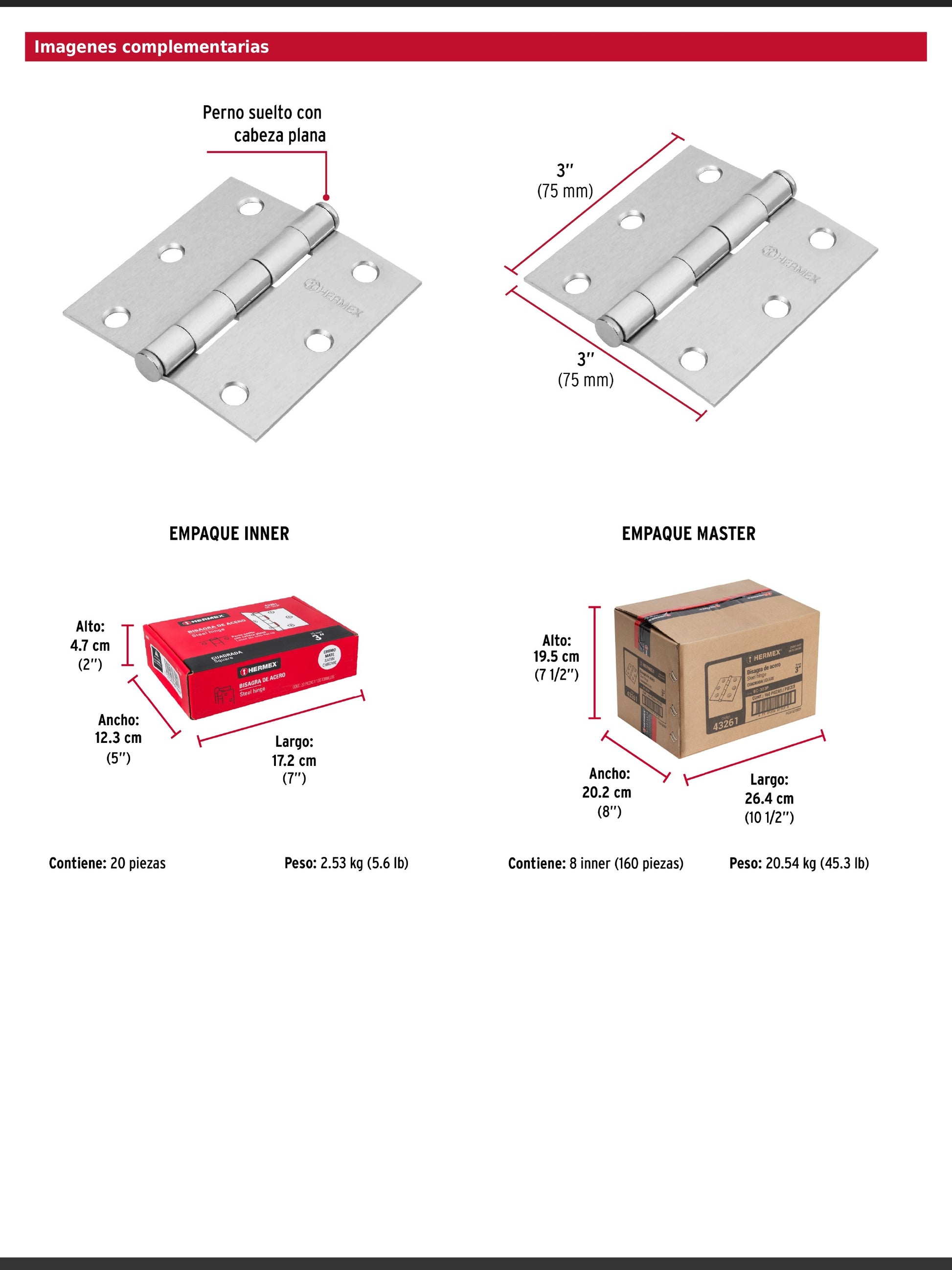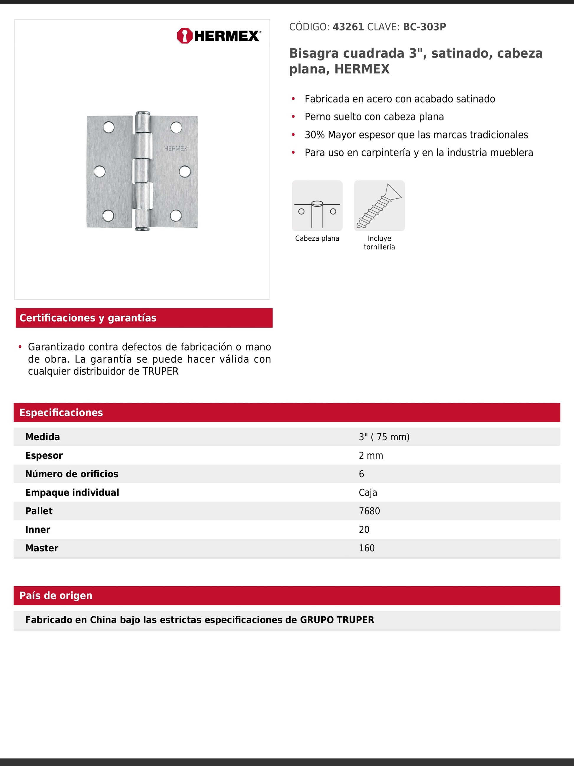 Fabricada en acero con acabado satinado, cuenta con perno suelto con cabeza plana y 30% mayor espesor que las marcas tradicionales. Recomendada para aplicaciones en carpintería y en la industria mueblera. Incluye tornillería y garantía contra defectos de fabricación o mano de obra.