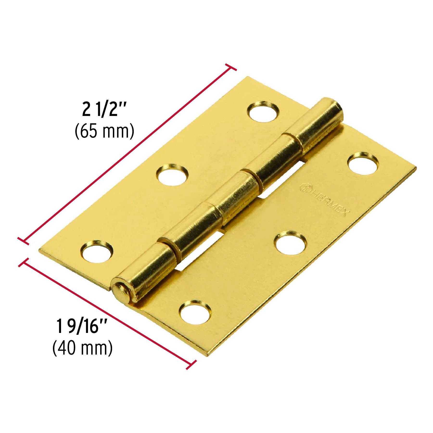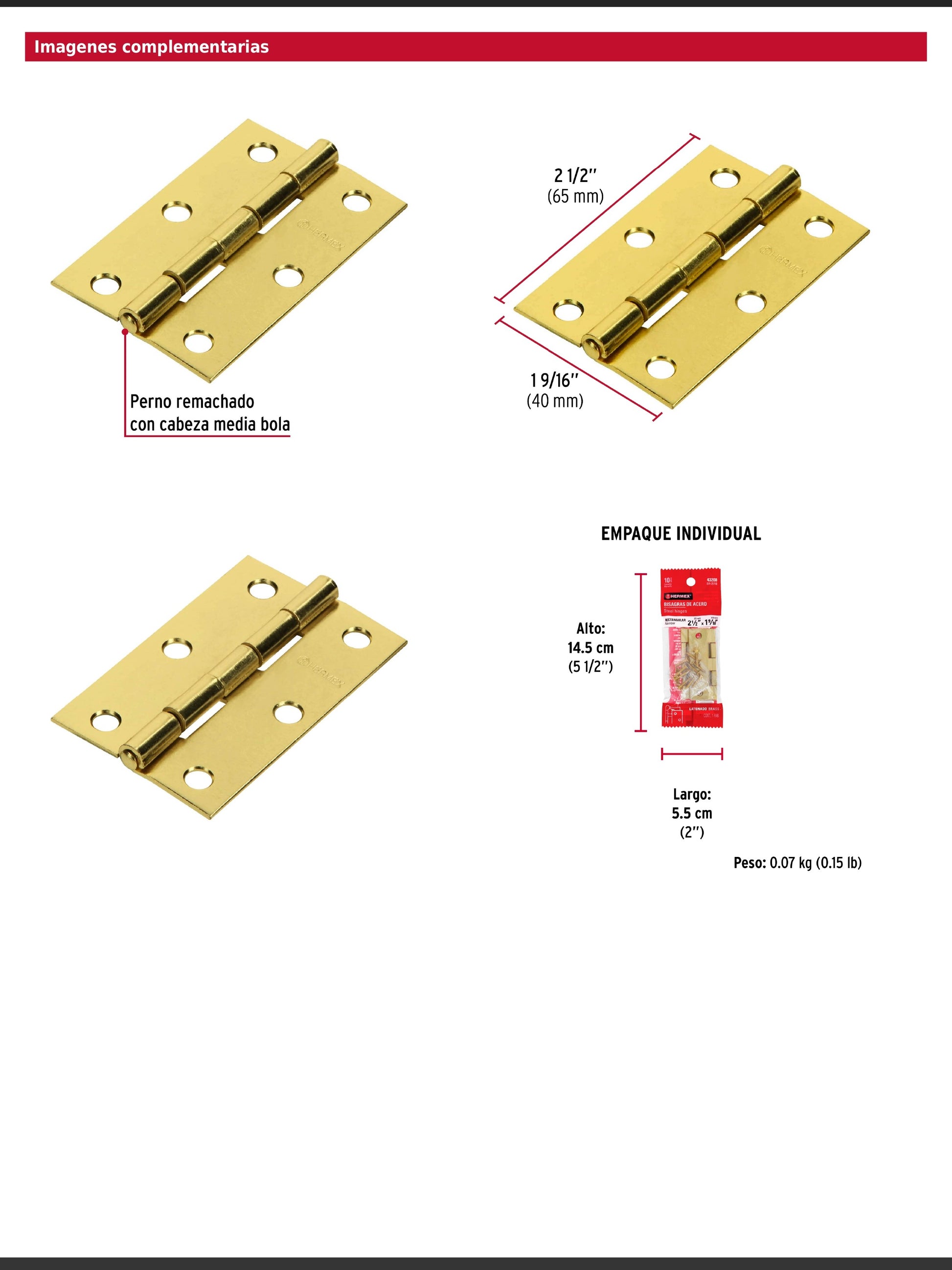 Bisagras fabricadas en acero con acabado latonado, con perno remachado y cabeza media bola. Ideales para carpintería y la industria mueblera, se presentan en bolsa con 2 piezas e incluyen tornillería para su instalación.