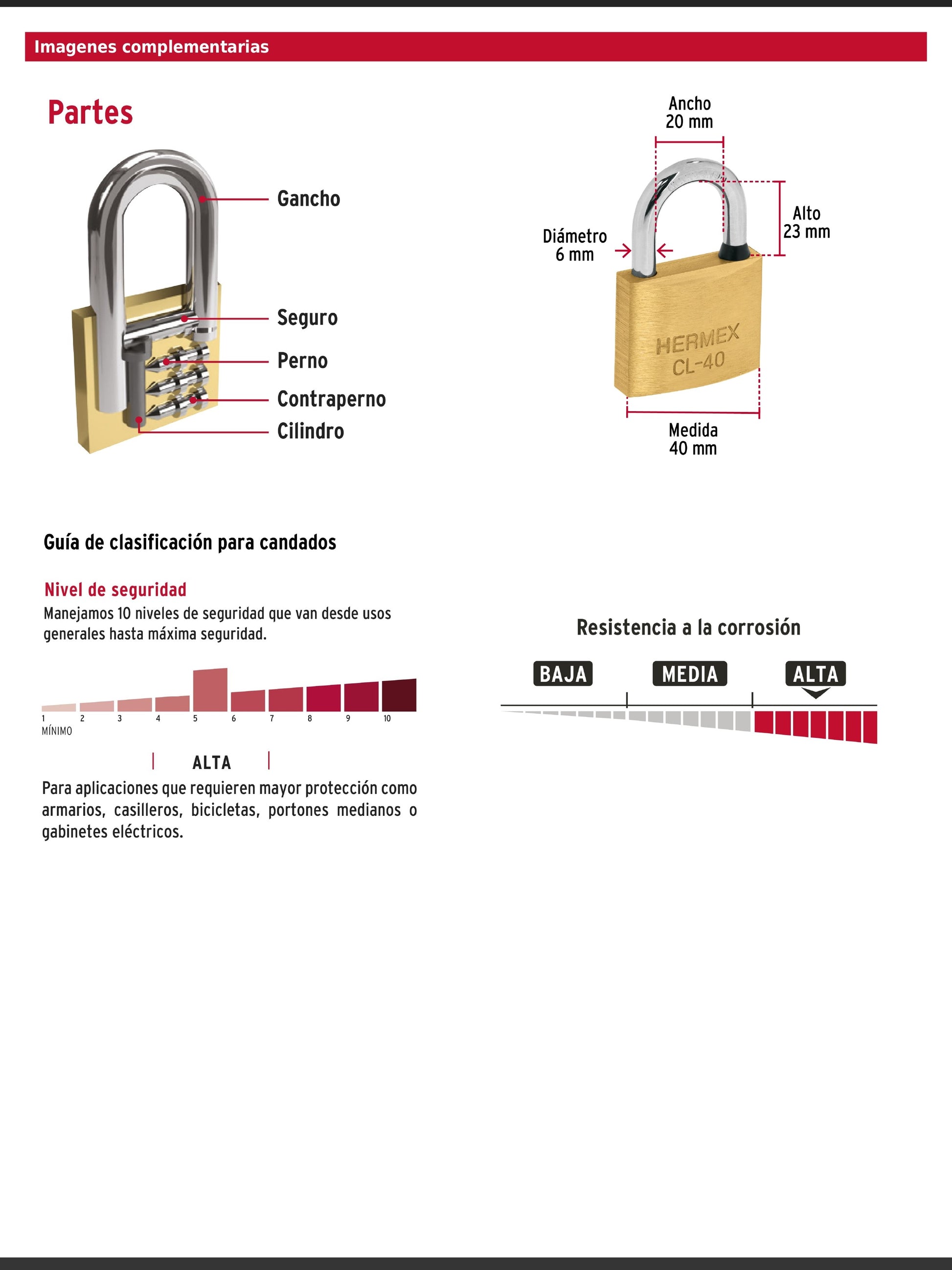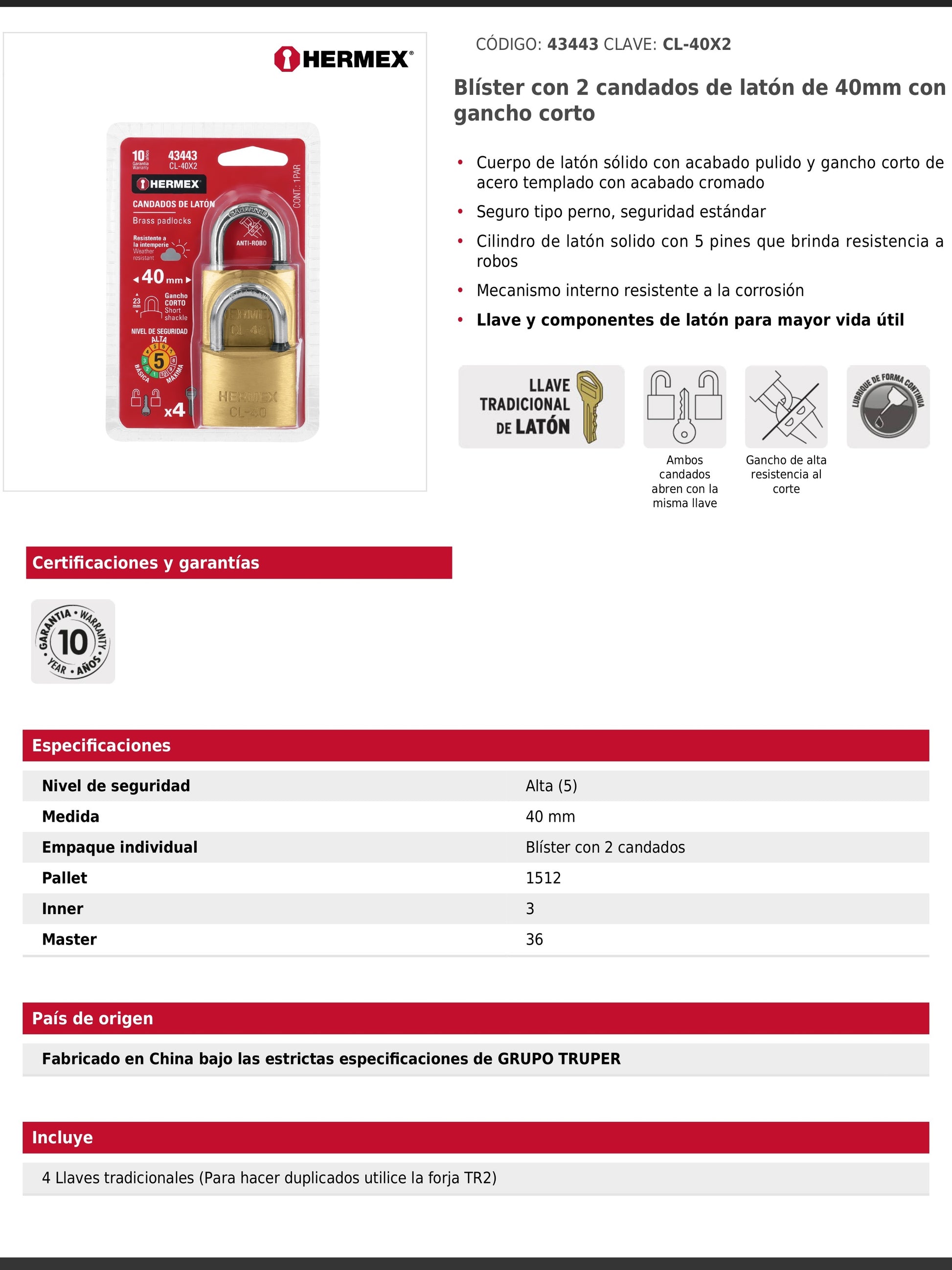 Candados con cuerpo de latón sólido acabado pulido y gancho corto de acero templado cromado. Tienen seguro tipo perno con seguridad estándar y cilindro de latón sólido con 5 pines que brinda resistencia a robos. Cuentan con mecanismo interno resistente a la corrosión y componentes de latón junto con llaves tradicionales para mayor vida útil. Ambos candados abren con la misma llave y poseen gancho de alta resistencia al corte.
