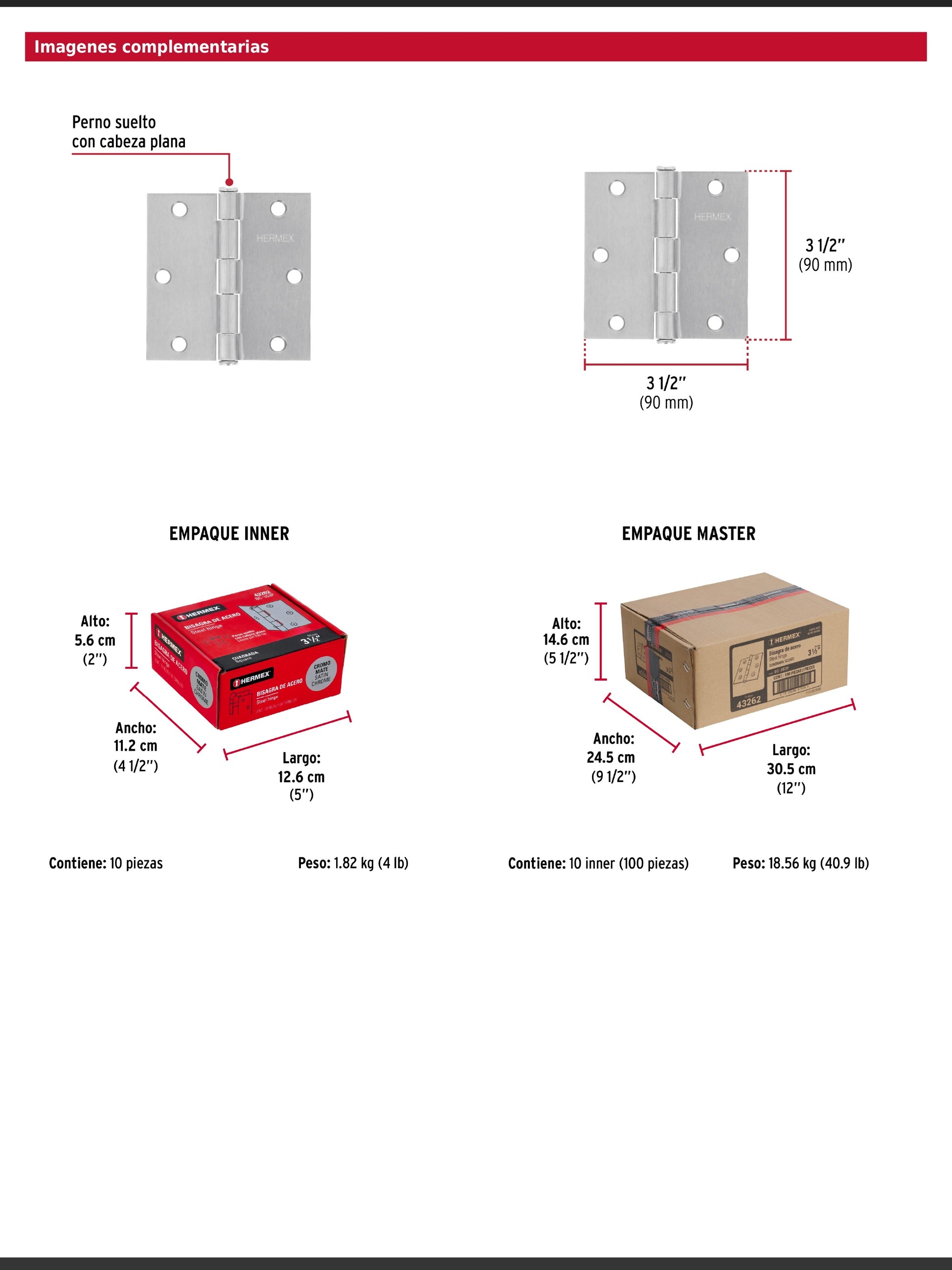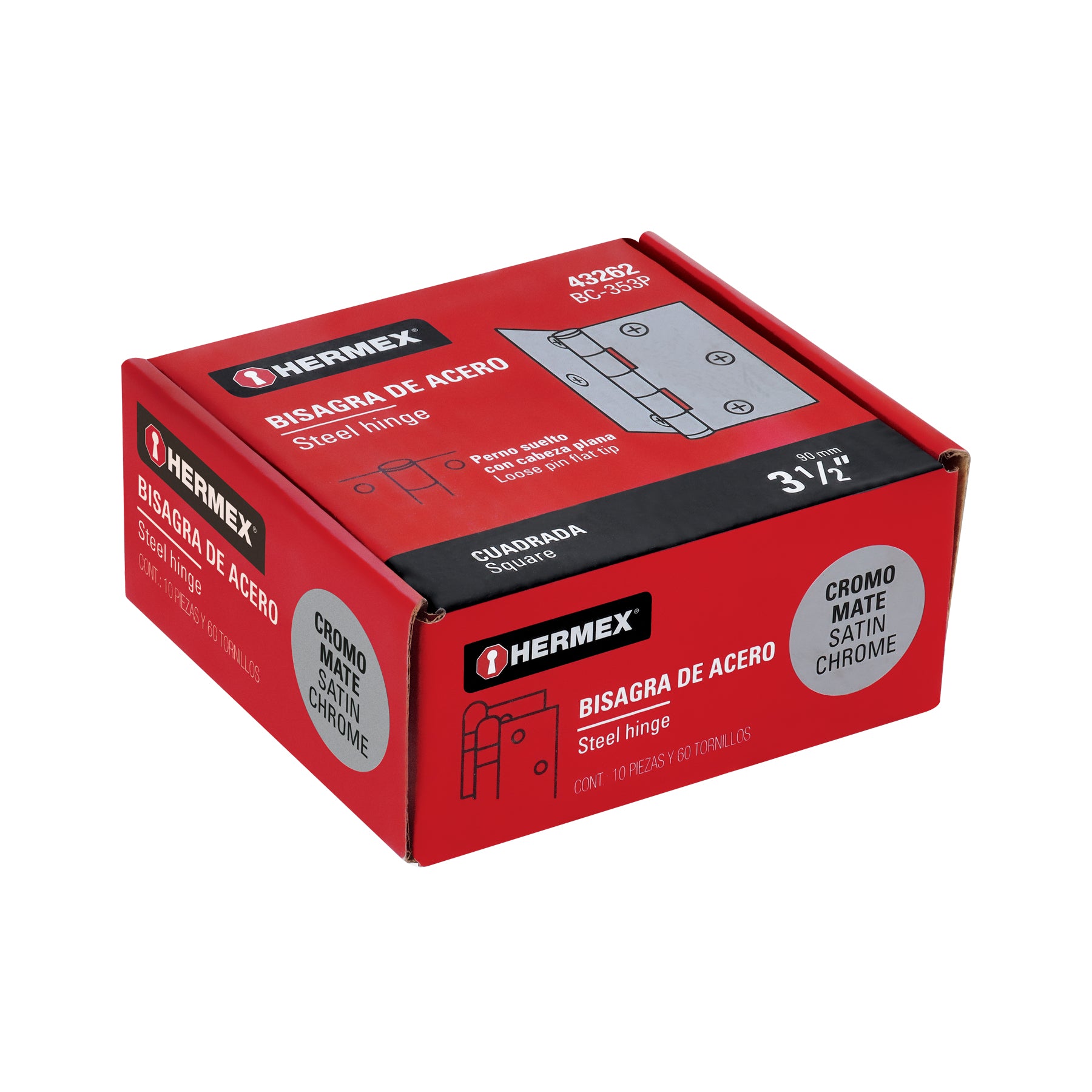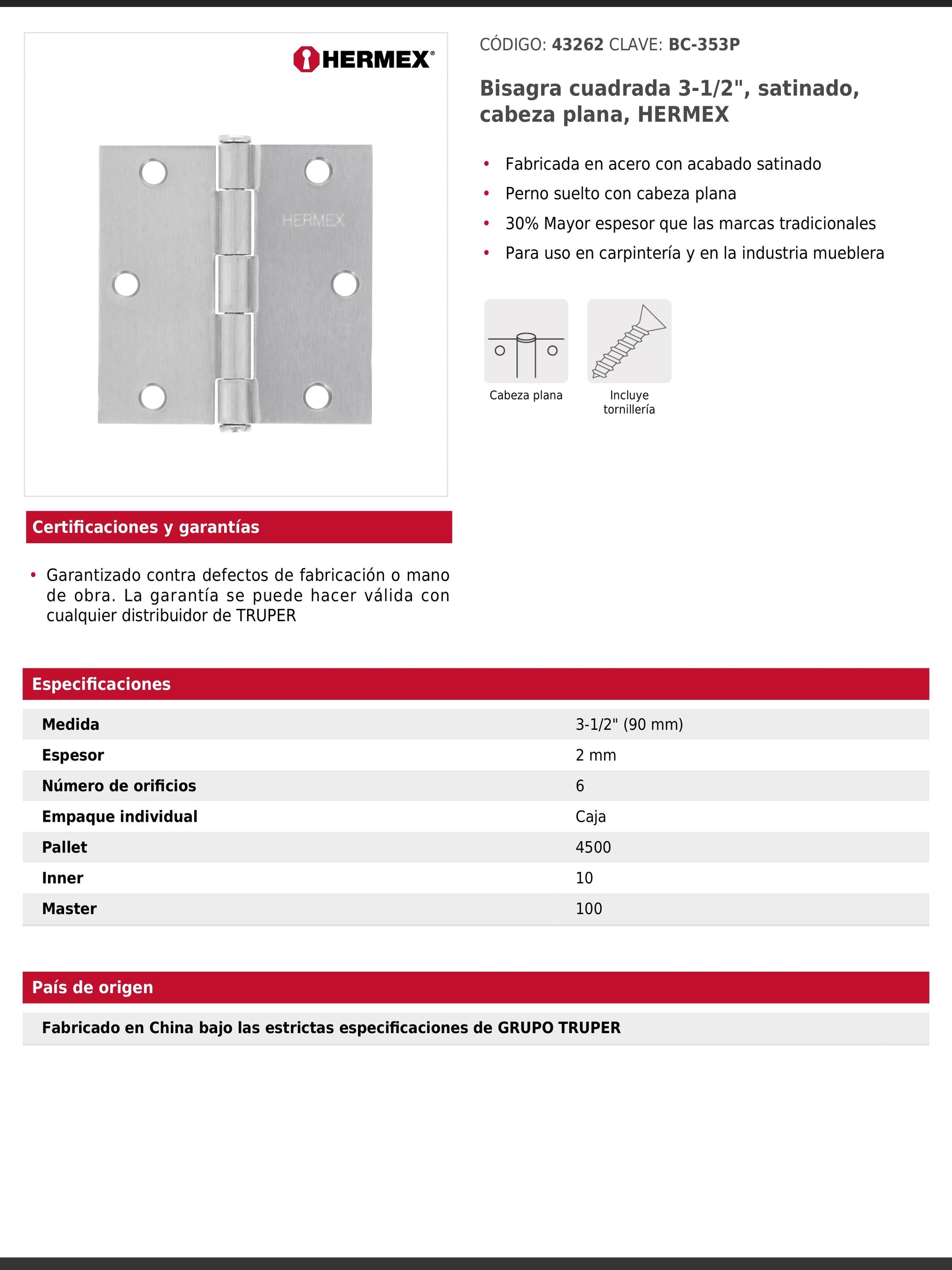 Fabricada en acero con acabado satinado, equipada con perno suelto con cabeza plana y 30% mayor espesor que las marcas tradicionales. Diseñada para trabajos de carpintería y la industria mueblera. Incluye tornillería y garantía contra defectos de fabricación o mano de obra.