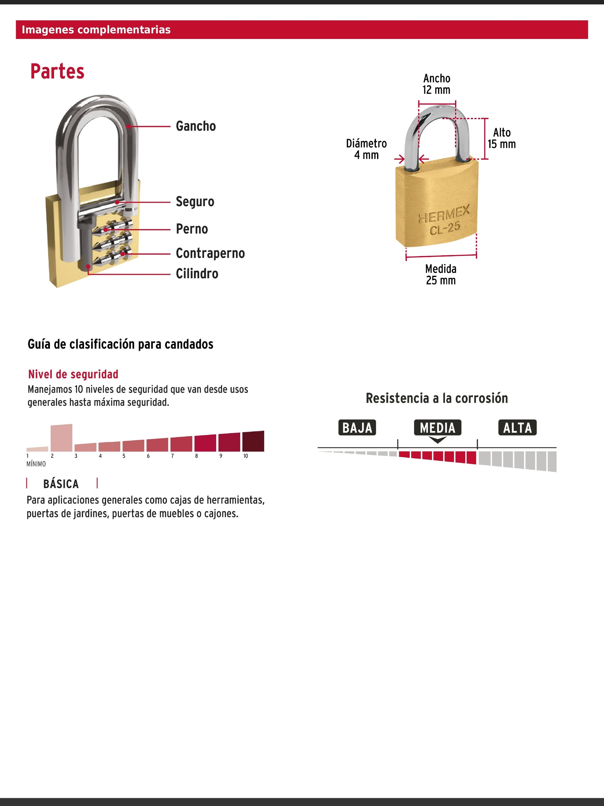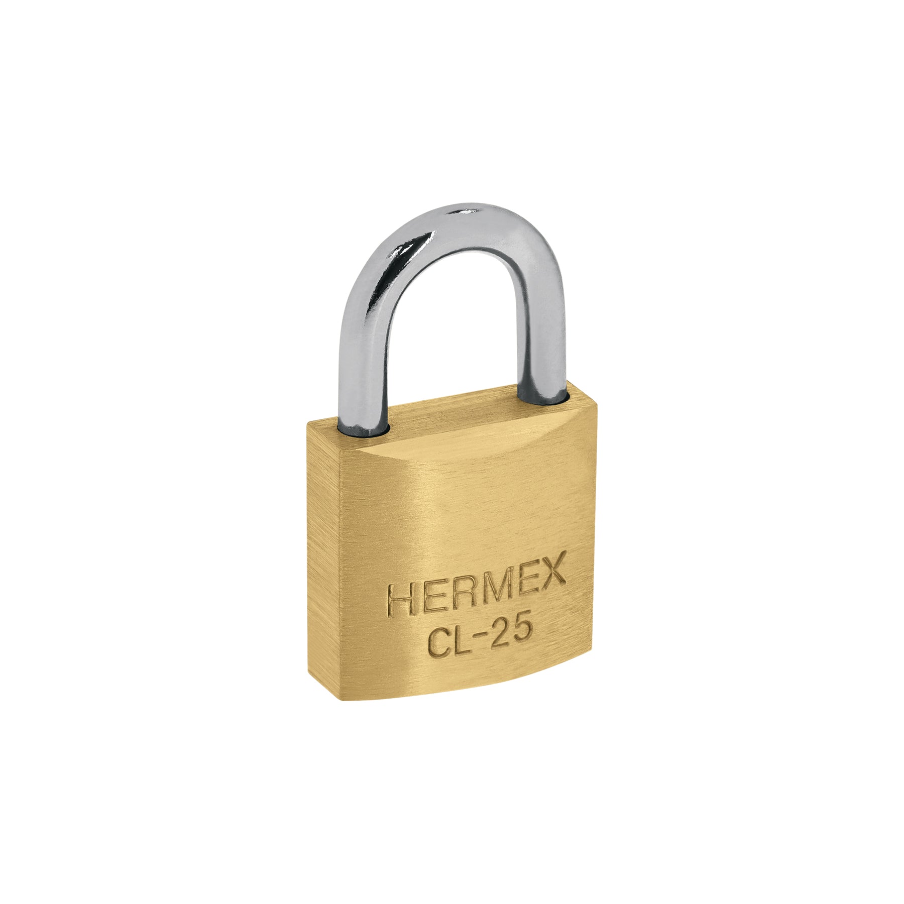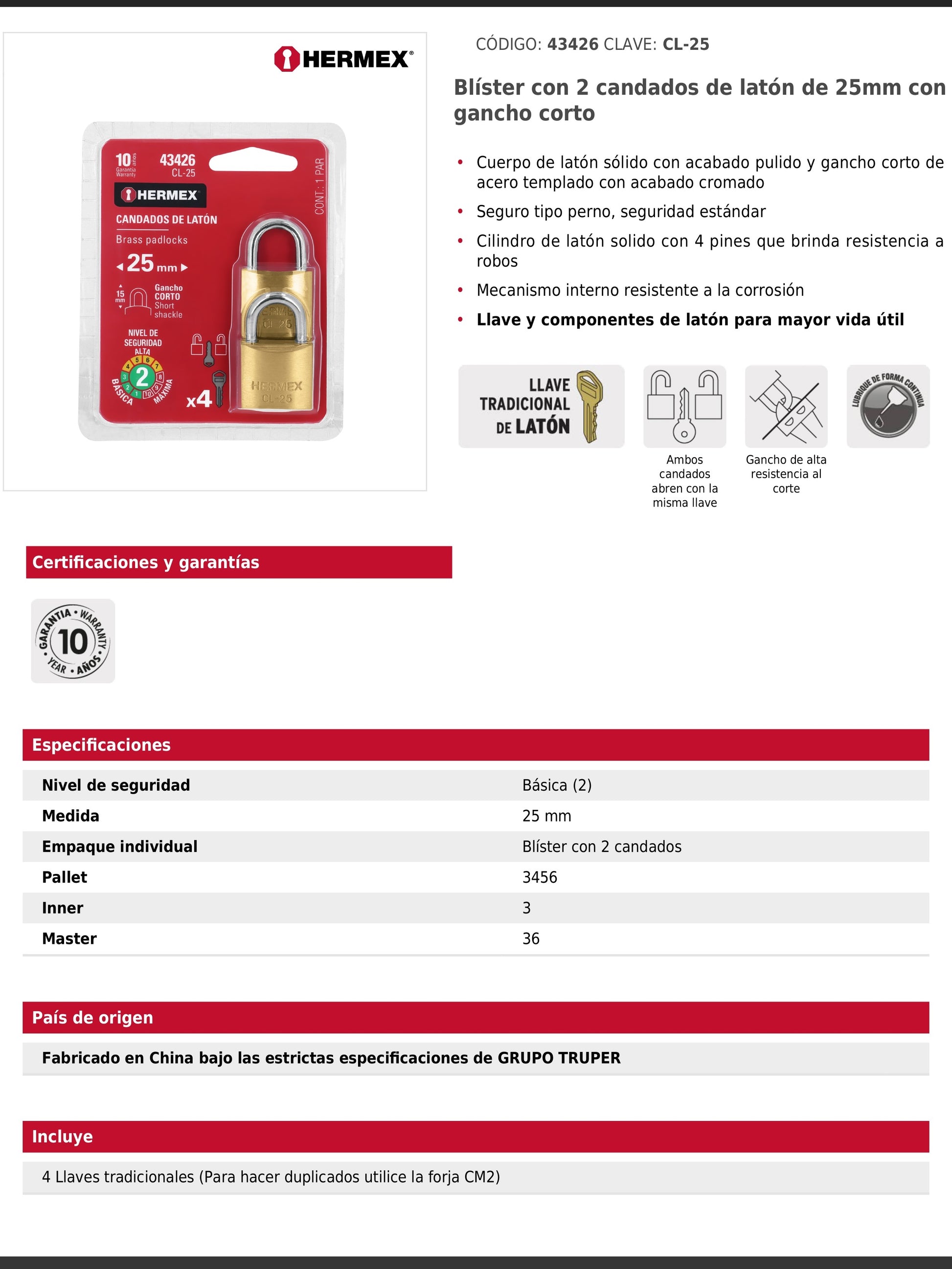 Candados con cuerpo de latón sólido acabado pulido y gancho corto de acero templado cromado. Tienen seguro tipo perno con seguridad estándar y cilindro de latón sólido con 4 pines que brinda resistencia a robos. Incorporan mecanismo interno resistente a la corrosión y componentes de latón junto con llaves tradicionales para mayor vida útil. Ambos candados abren con la misma llave y cuentan con gancho de alta resistencia al corte.