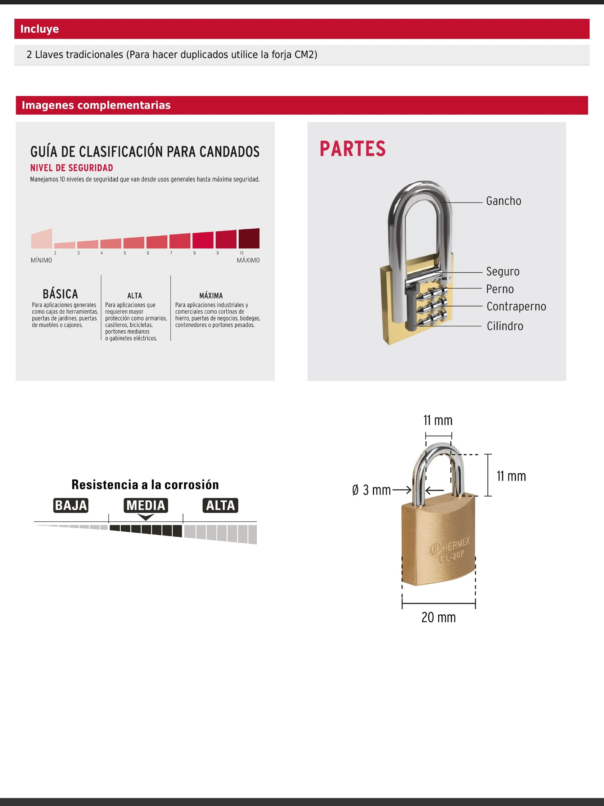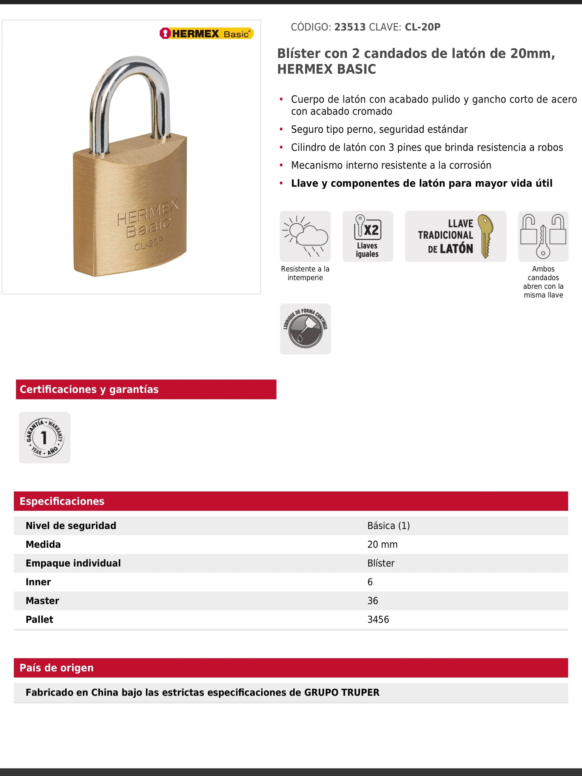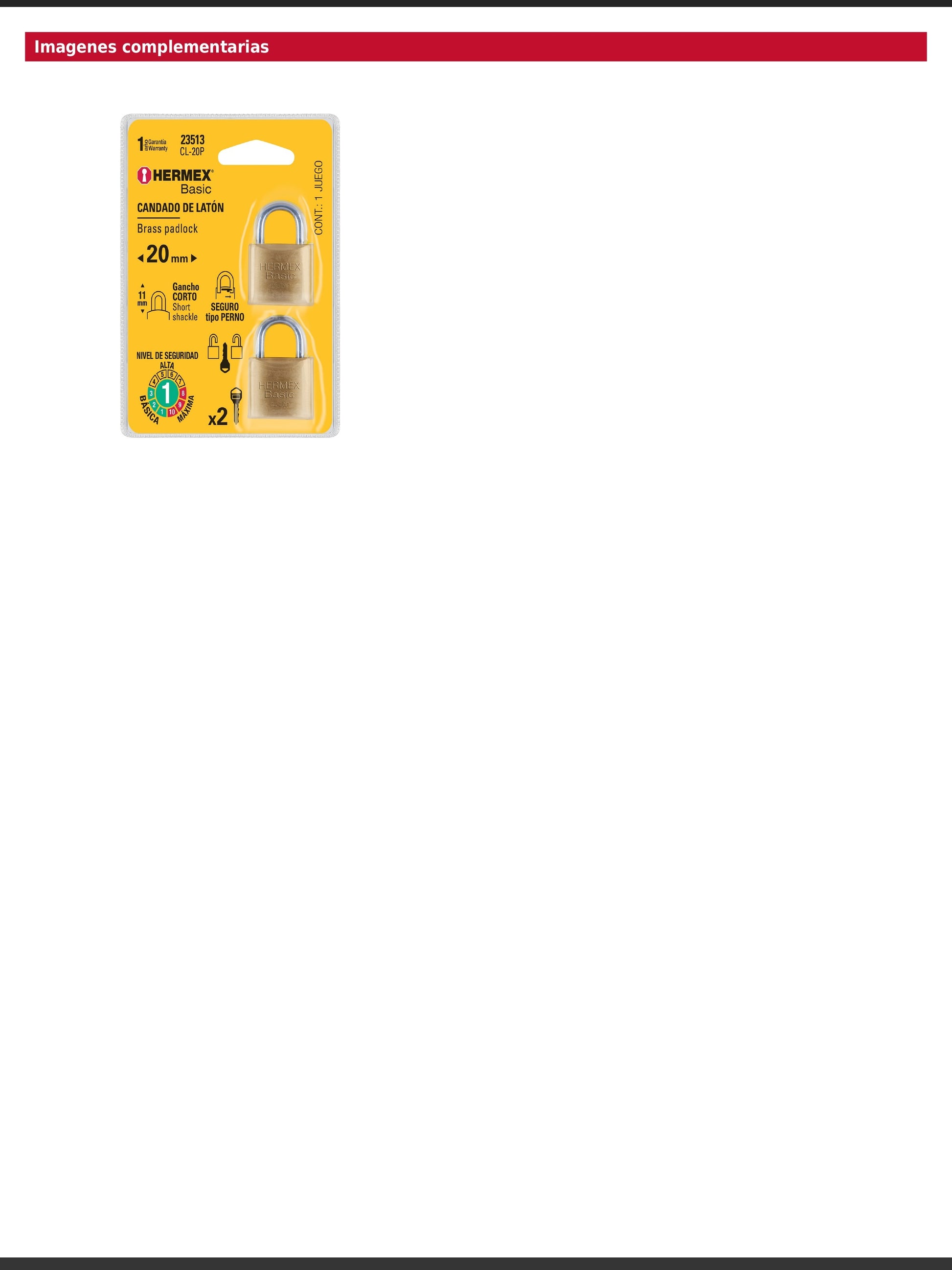 Blíster con 2 candados de latón con acabado pulido y gancho corto de acero cromado. Incorporan seguro tipo perno estándar, cilindro de latón con 3 pines y mecanismo interno anticorrosión. Sus componentes de latón proporcionan mayor vida útil y resistencia a la intemperie. Ambos candados abren con la misma llave.