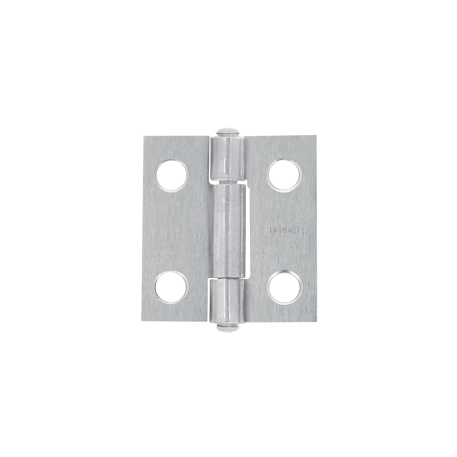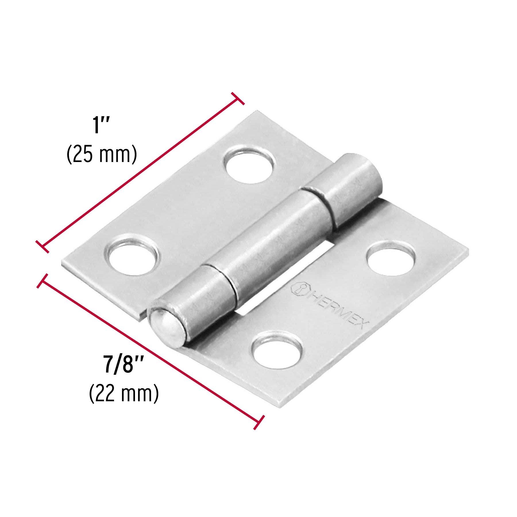 Bisagra fabricada en acero inoxidable con acabado pulido, con perno remachado y cabeza media bola. Diseñada para carpintería y la industria mueblera, incluye tornillería para su instalación.