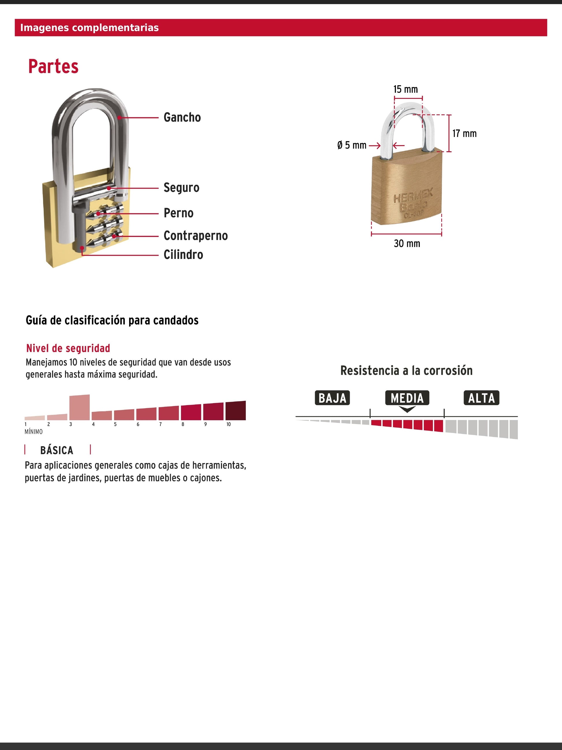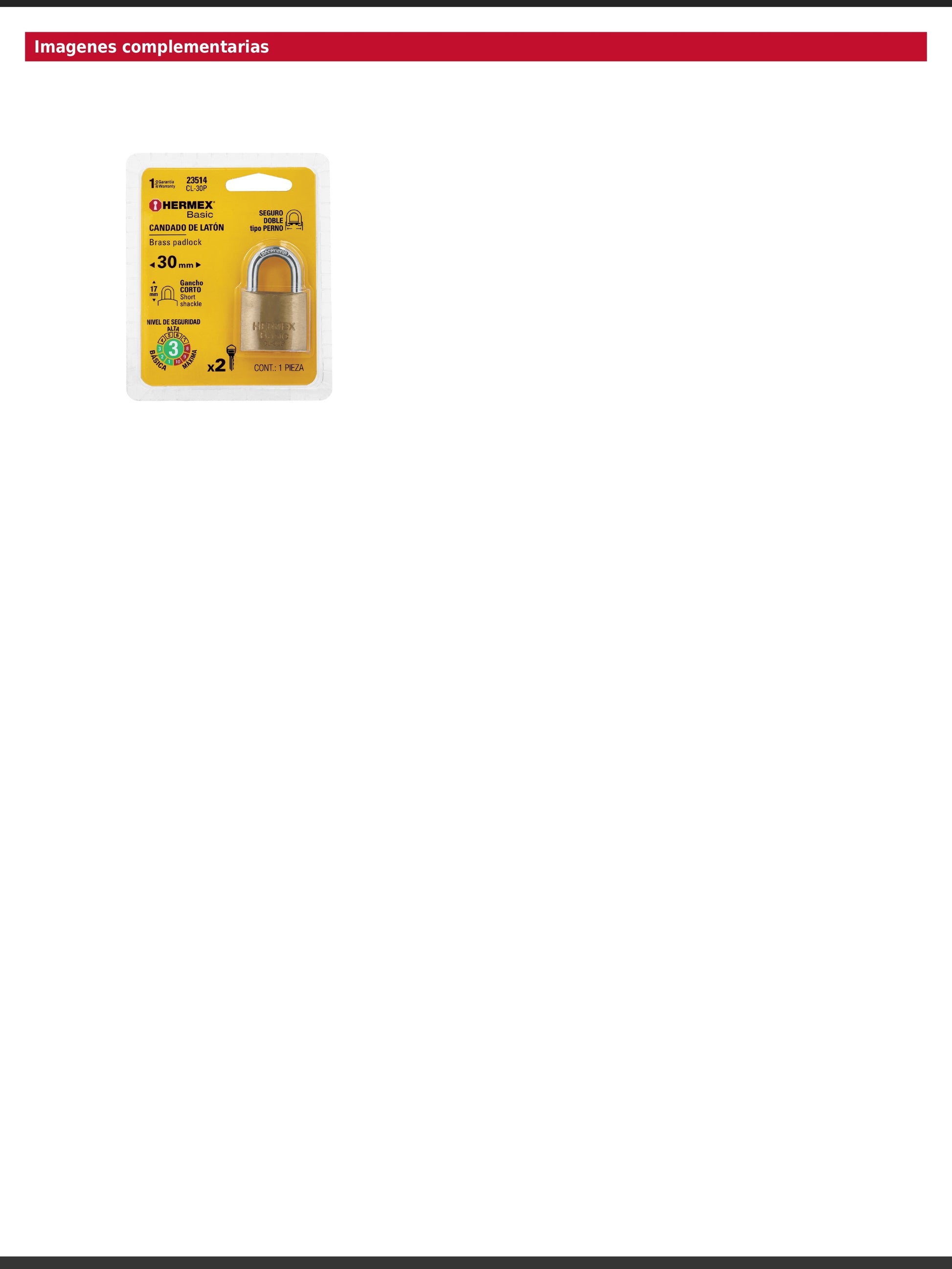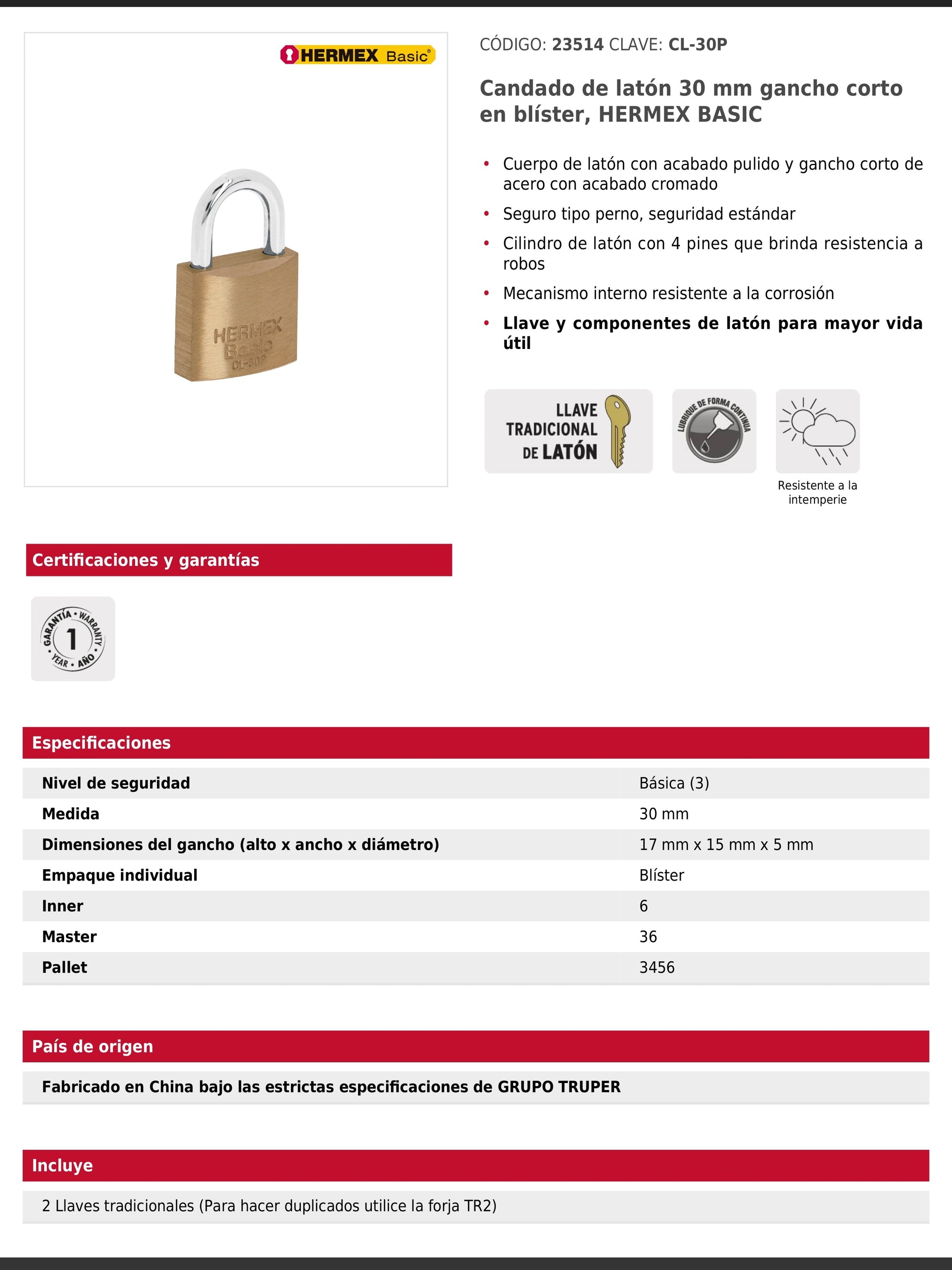 Candado de latón con acabado pulido y gancho corto de acero cromado. Cuenta con seguro tipo perno estándar, cilindro de latón con 4 pines y mecanismo interno anticorrosión. Sus componentes de latón ofrecen mayor vida útil y resistencia a la intemperie.