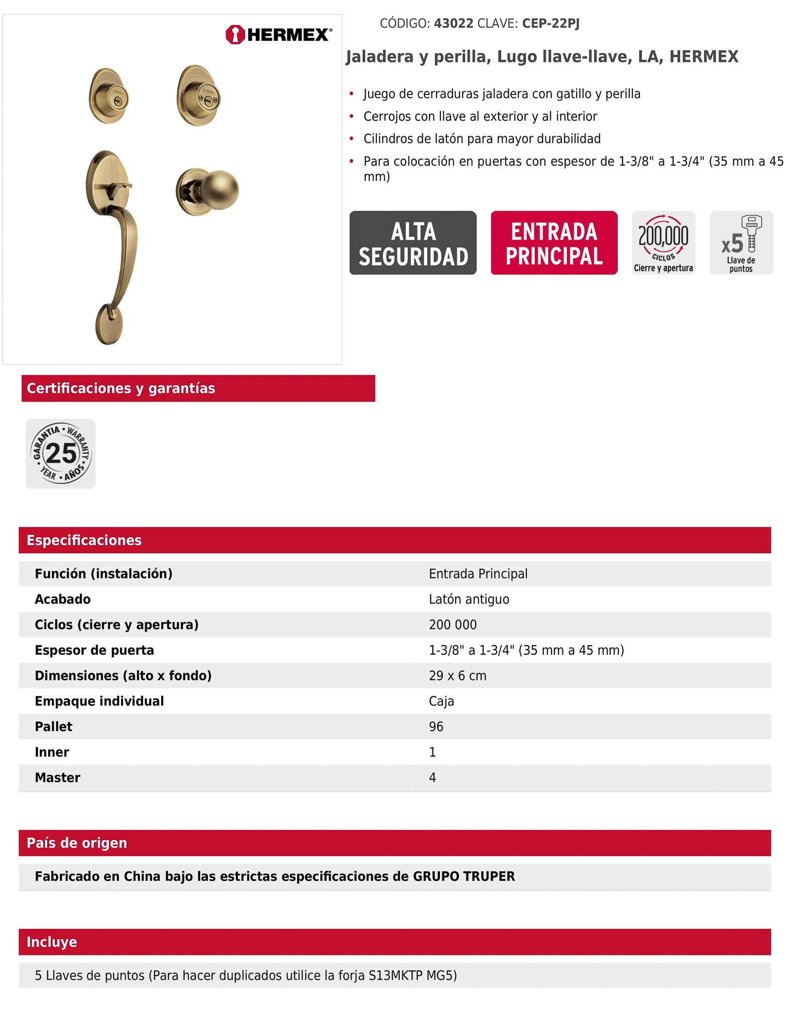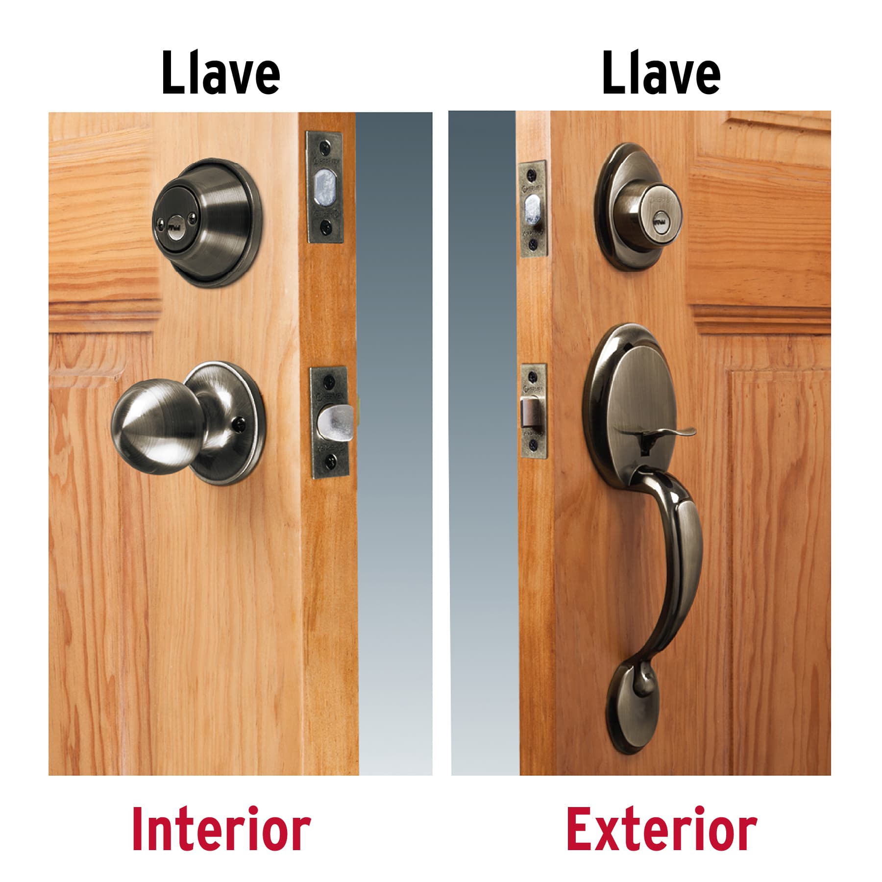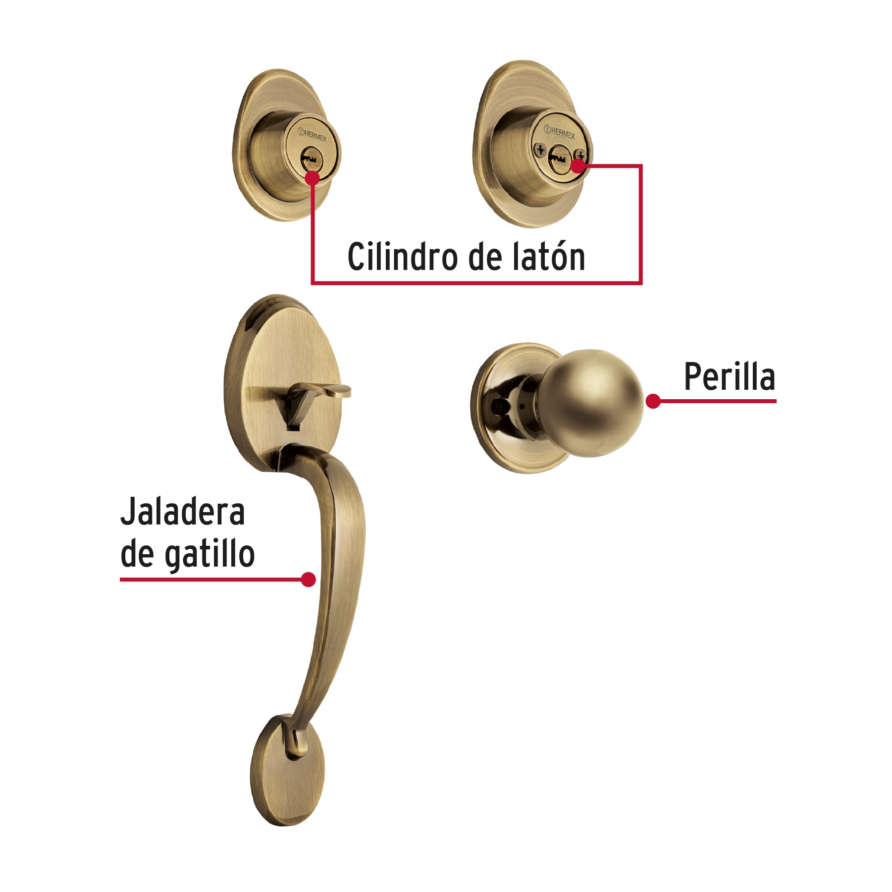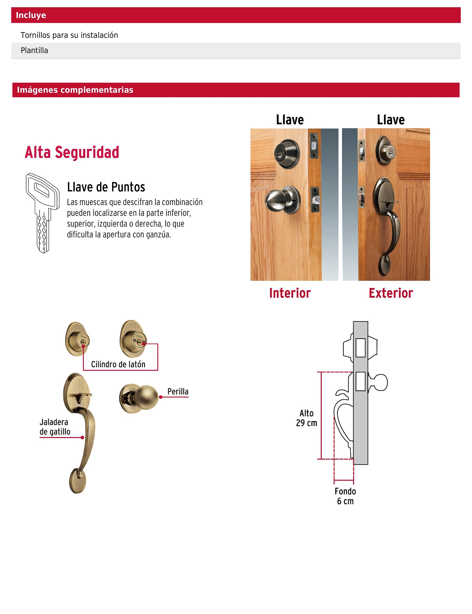 Juego de cerraduras tipo jaladera con gatillo y perilla para entrada principal, con cerrojos llave–llave al exterior e interior y cilindros de latón para mayor durabilidad. Compatible con puertas de 35 a 45 mm de espesor, diseñado para 200,000 ciclos de apertura y cierre; incluye 5 llaves de puntos, tornillos y plantilla de instalación.