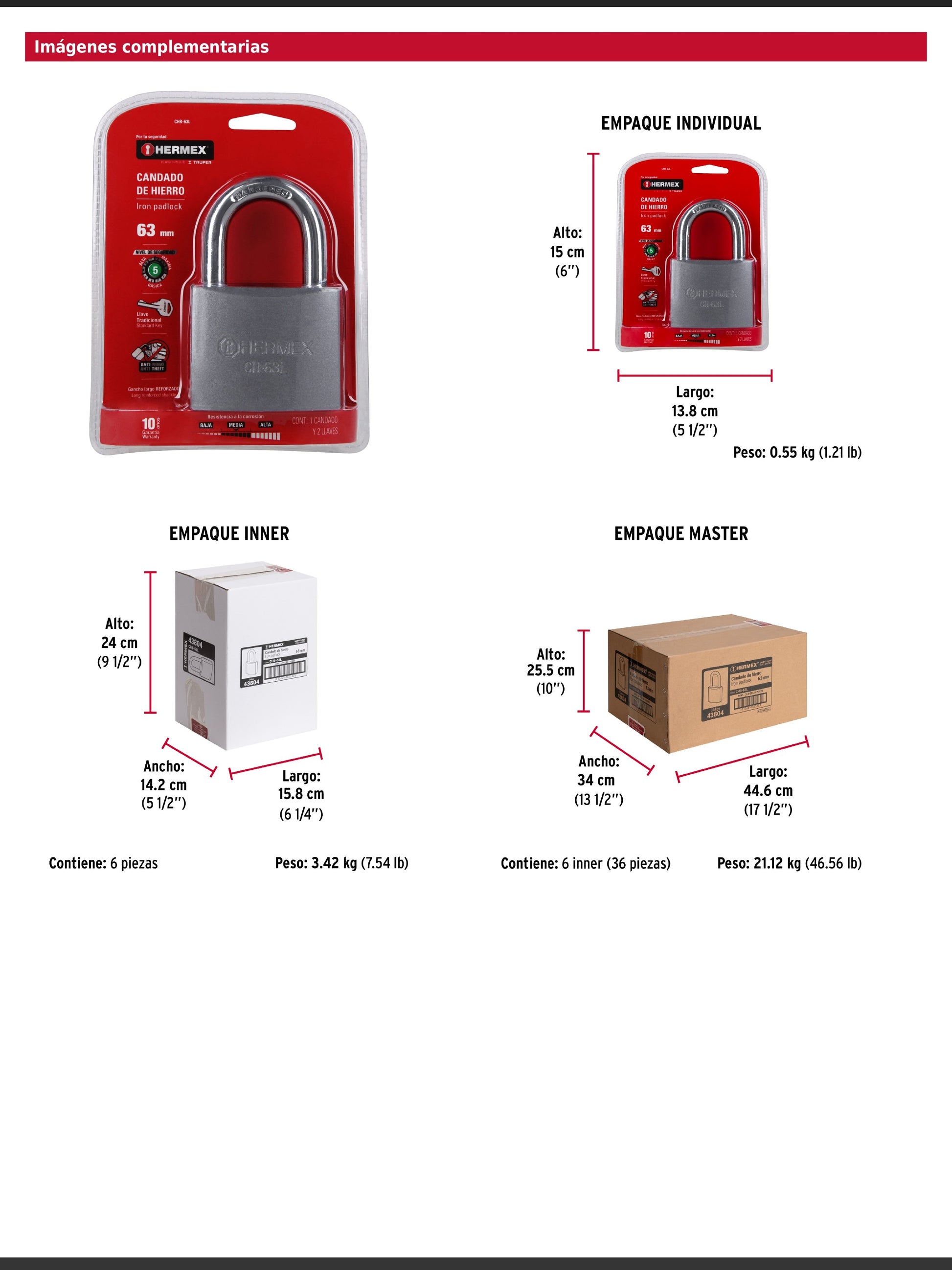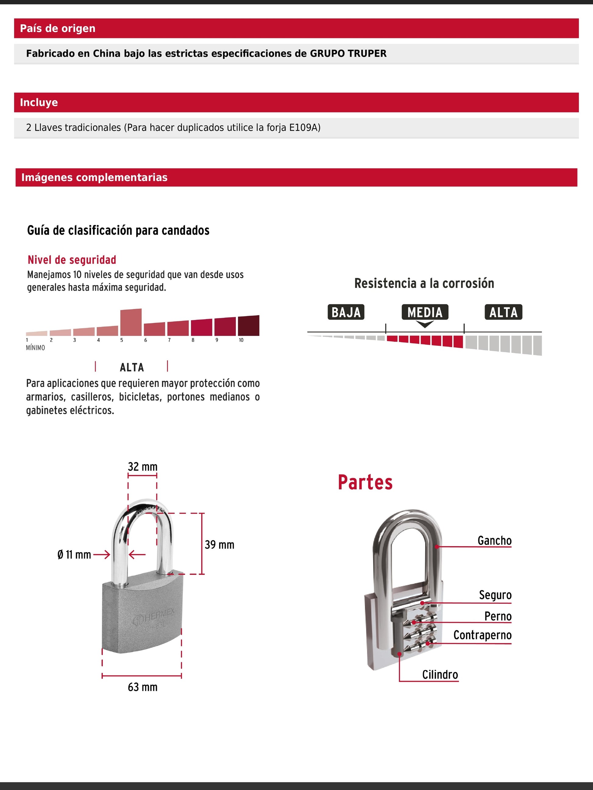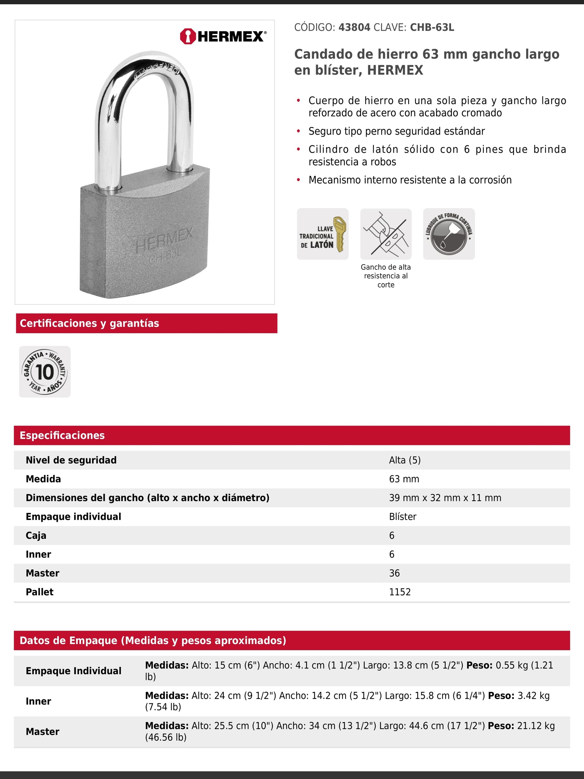 Candado fabricado en una sola pieza de hierro con acabado resistente y gancho largo reforzado de acero cromado. Incorpora un cilindro de latón sólido con 6 pines y seguro tipo perno estándar que brindan alta resistencia a robos. Su mecanismo interno es resistente a la corrosión e incluye 2 llaves tradicionales. Se presenta en empaque individual tipo blíster.