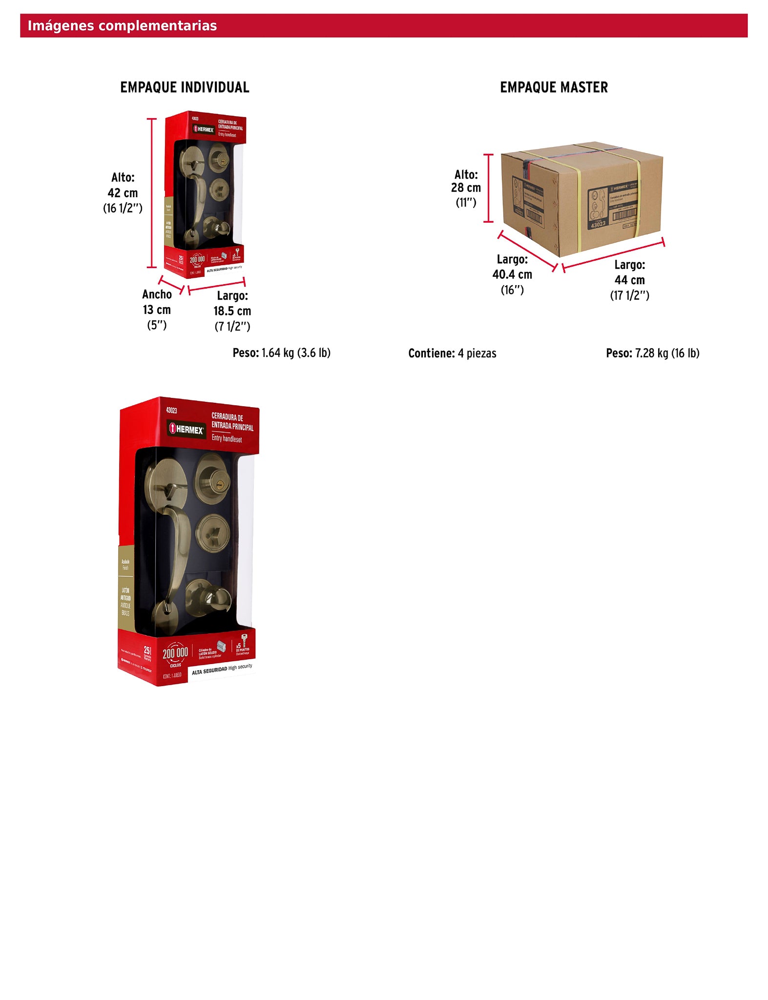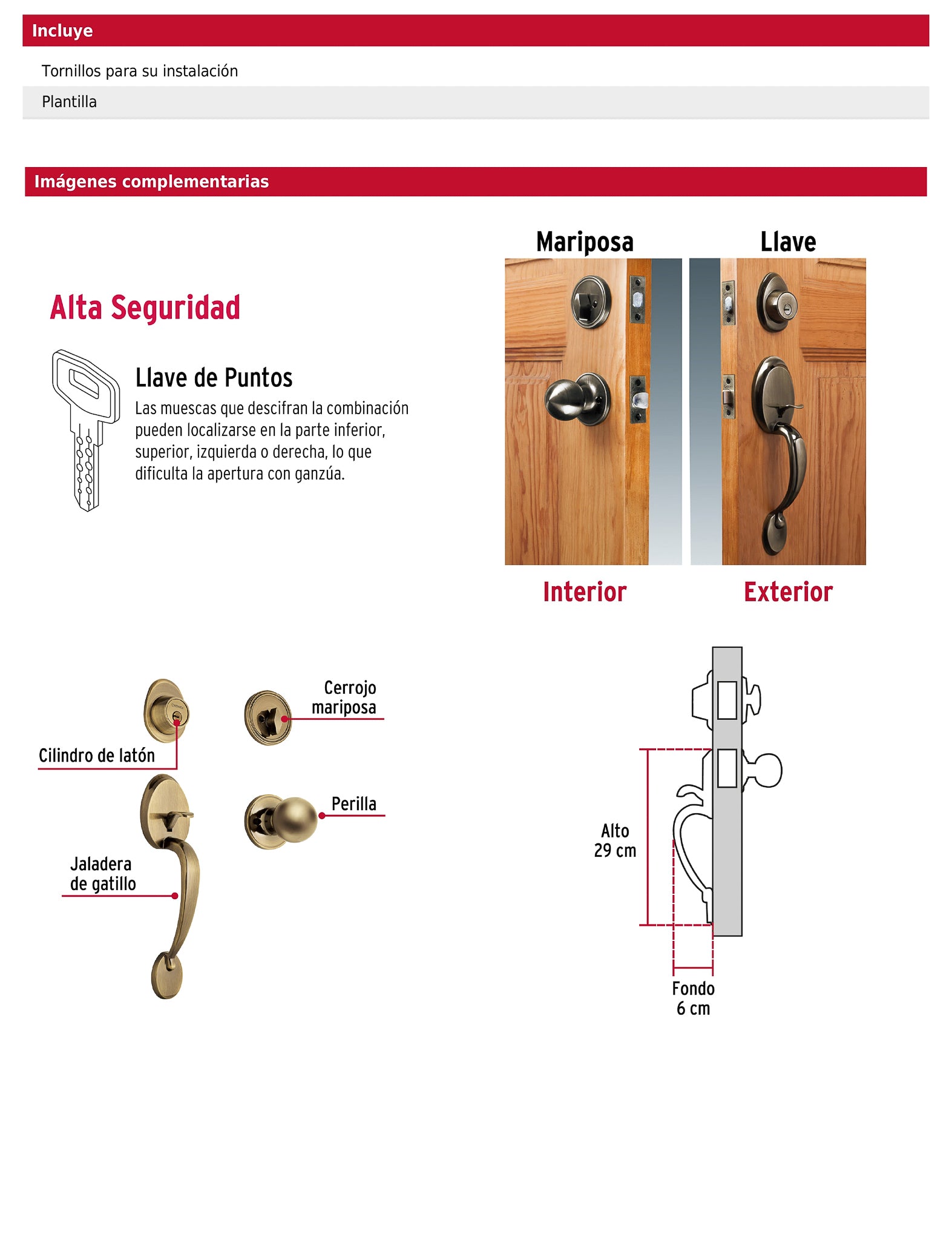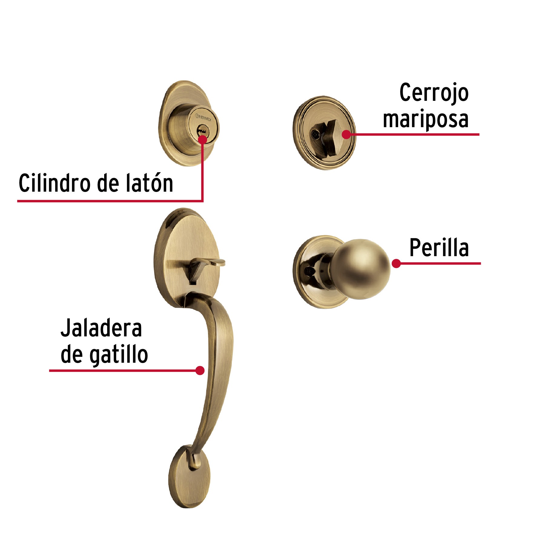 Juego de cerraduras doble jaladera con gatillo para entrada principal con cerrojos de llave al exterior y mariposa al interior y cilindros de latón para mayor durabilidad. Compatible con puertas de 35 a 45 mm de espesor ofrece 200,000 ciclos de apertura y cierre e incluye 5 llaves de puntos tornillos y plantilla con dimensiones 29 × 6 cm (alto × fondo).