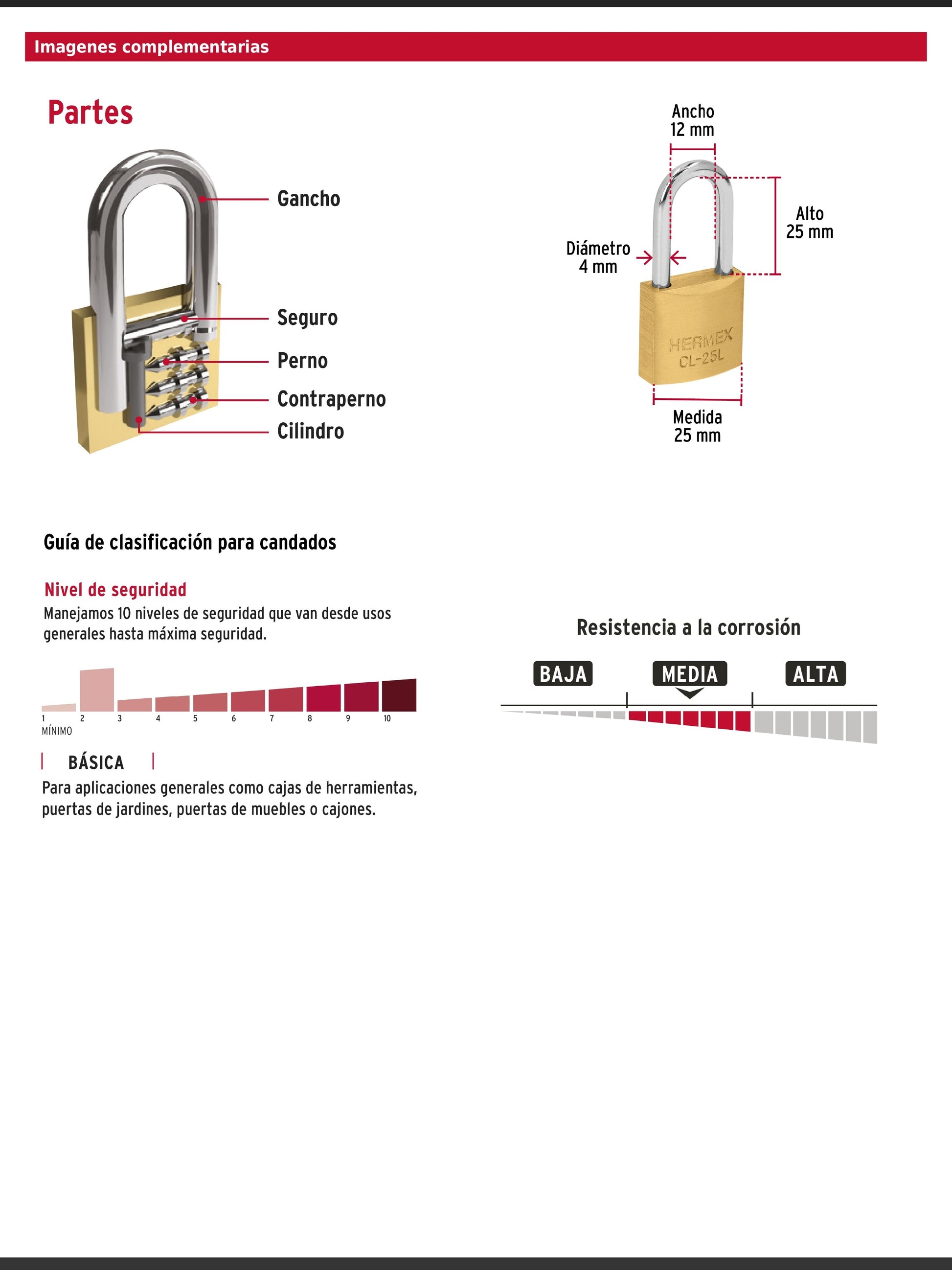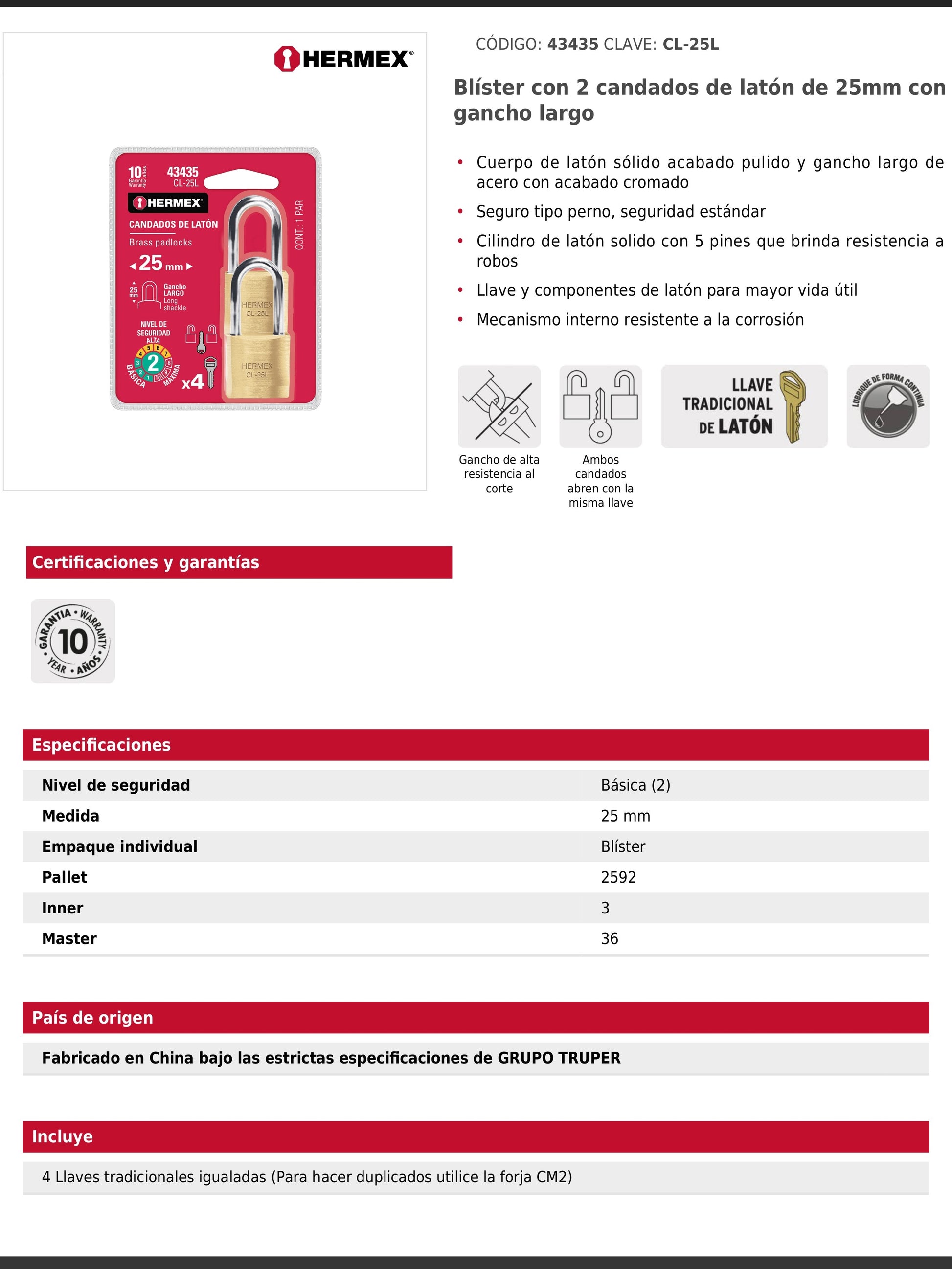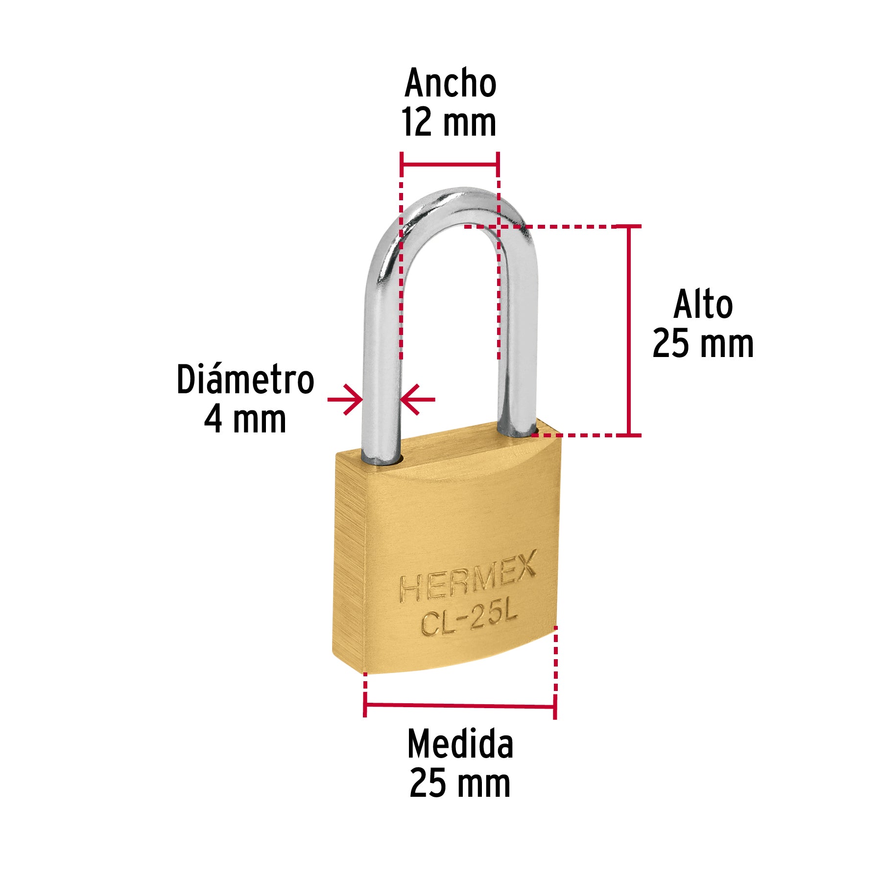 Candados con cuerpo de latón sólido acabado pulido y gancho largo de acero cromado. Incorporan seguro tipo perno con seguridad estándar y cilindro de latón sólido con 5 pines que brinda resistencia a robos. Sus llaves y componentes de latón ofrecen mayor vida útil y cuentan con mecanismo interno resistente a la corrosión. Ambos candados abren con la misma llave y poseen gancho de alta resistencia al corte.