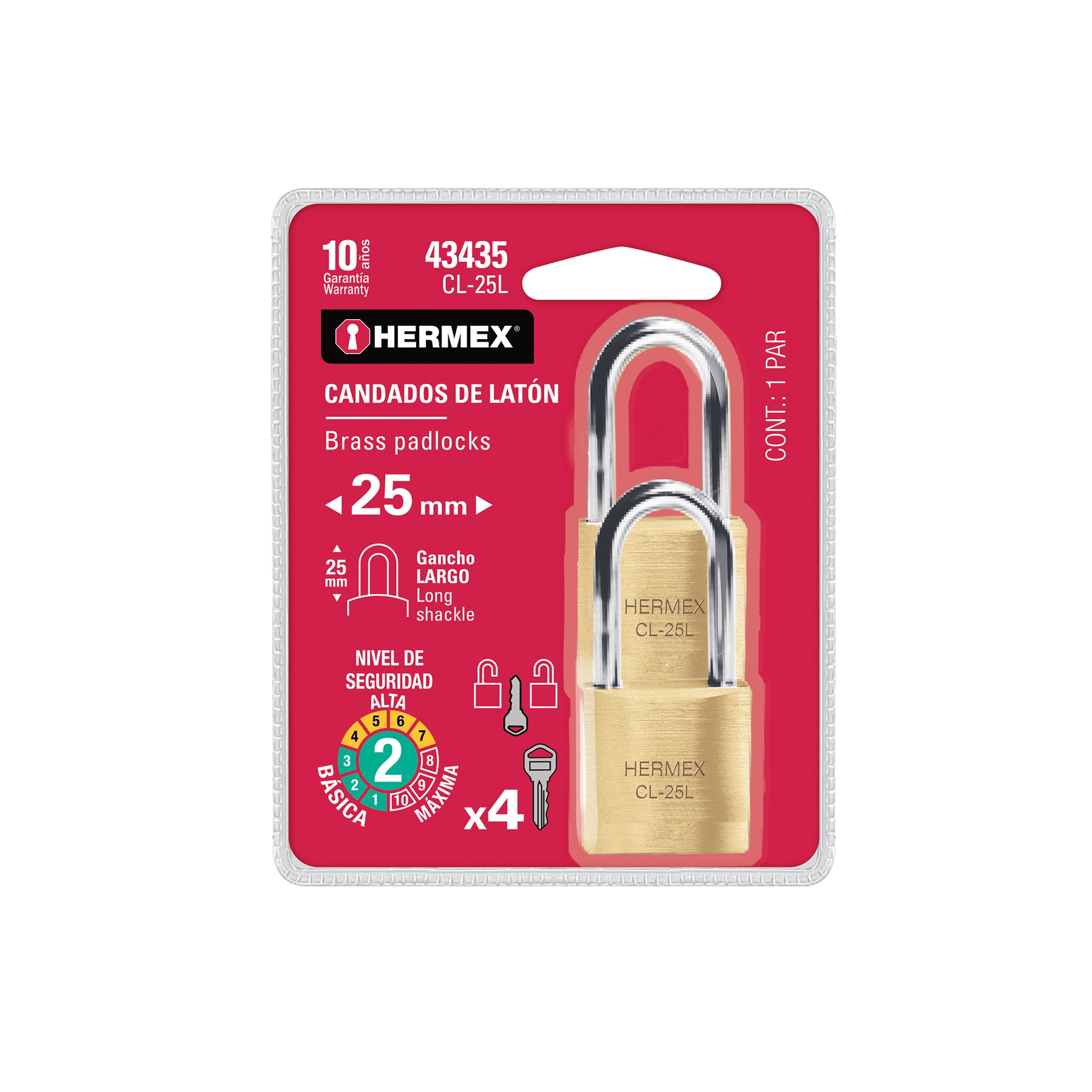 Blíster con 2 candados de latón de 25 mm con gancho largo
