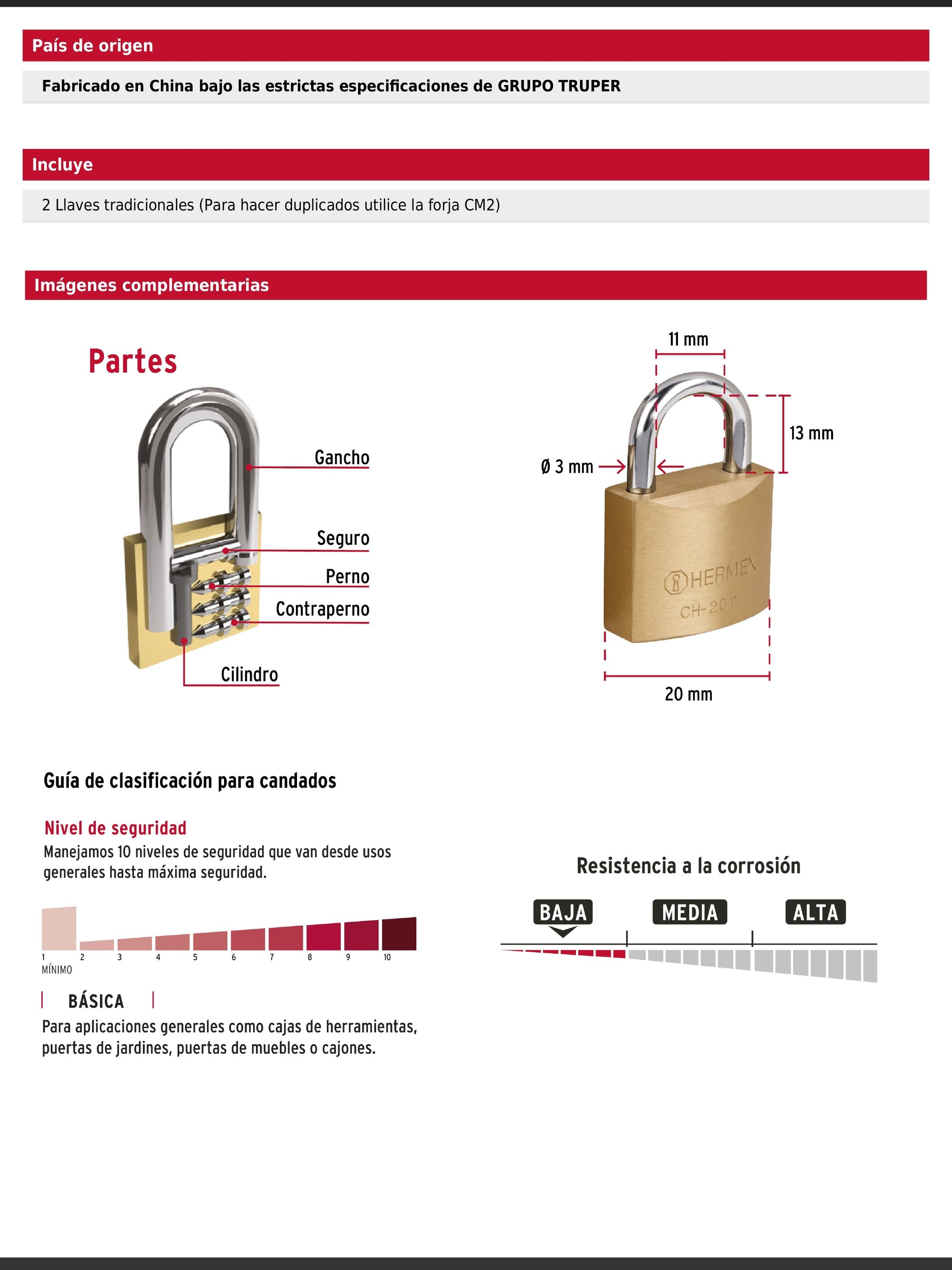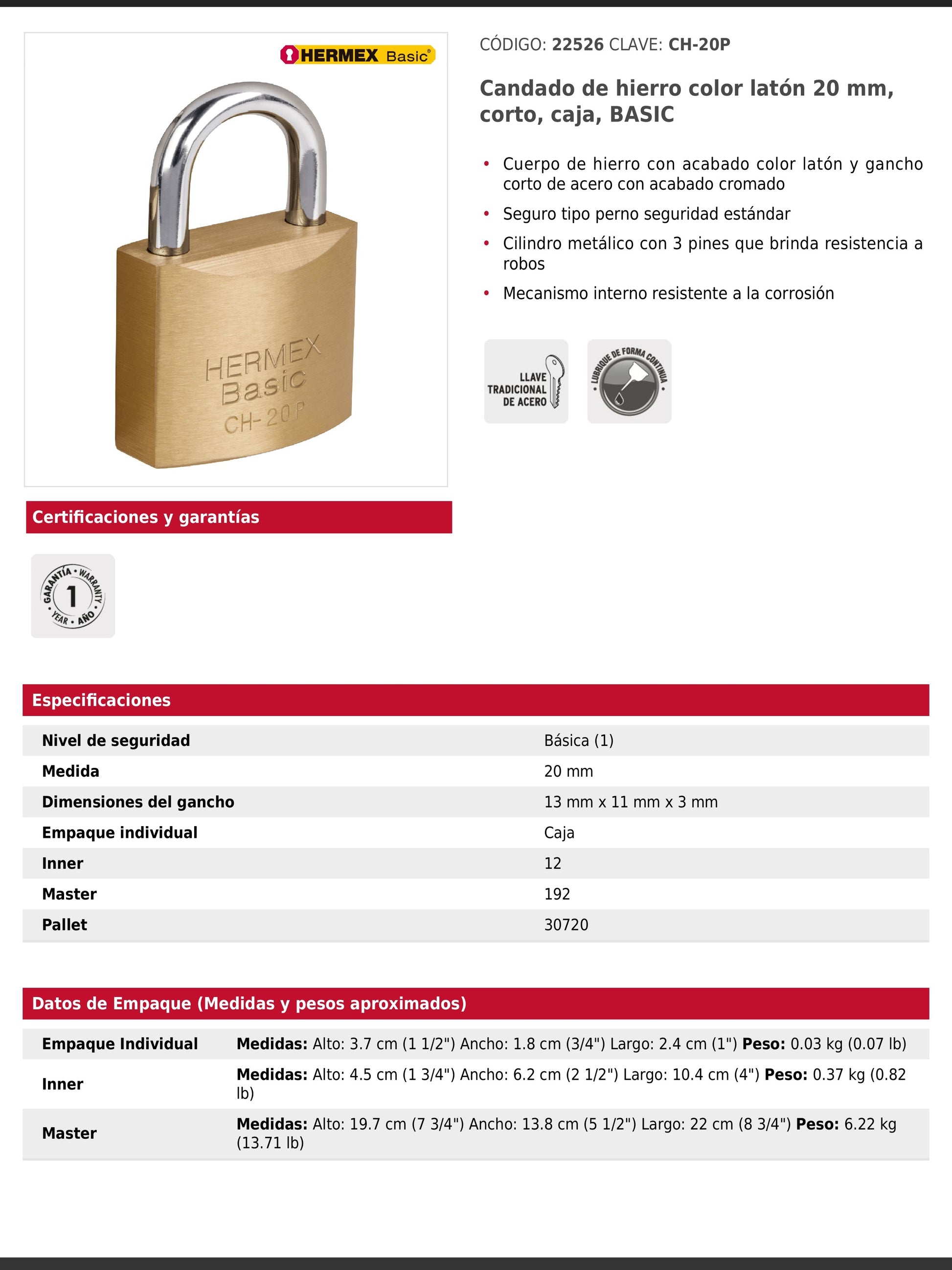 Candado de hierro con acabado latón y gancho corto de acero cromado, diseñado para un nivel de seguridad básica. Cuenta con un cilindro metálico de 3 pines y seguro tipo perno estándar que brindan resistencia básica a robos. Su mecanismo interno es resistente a la corrosión e incluye 2 llaves tradicionales. Se presenta en empaque individual tipo caja.