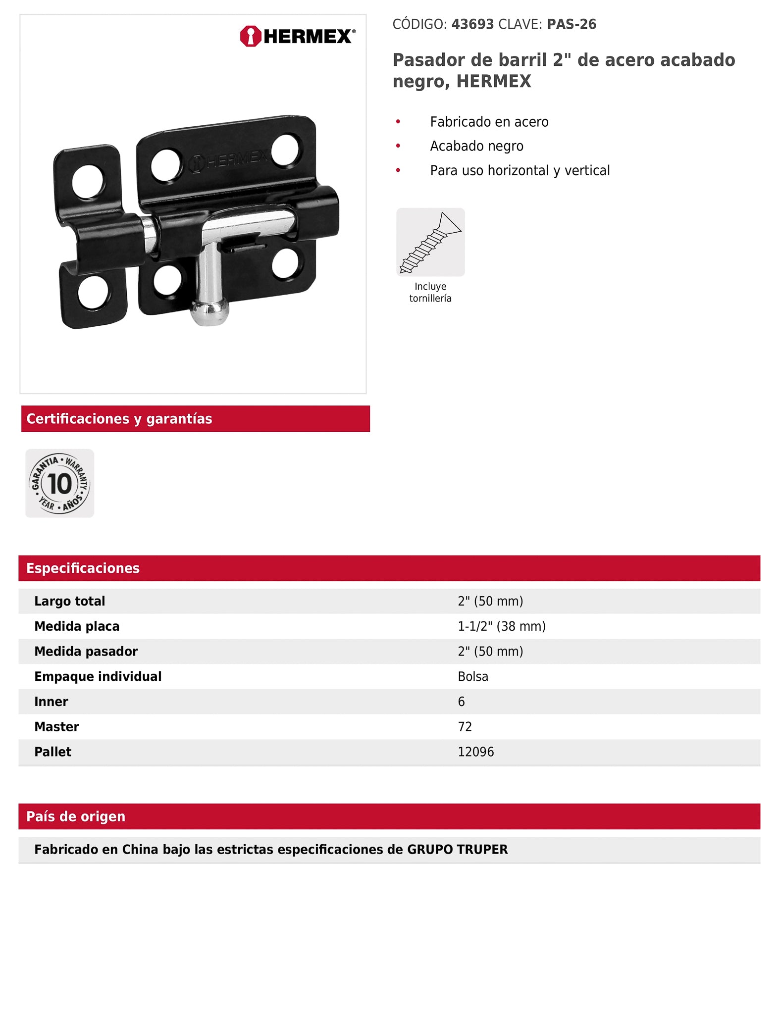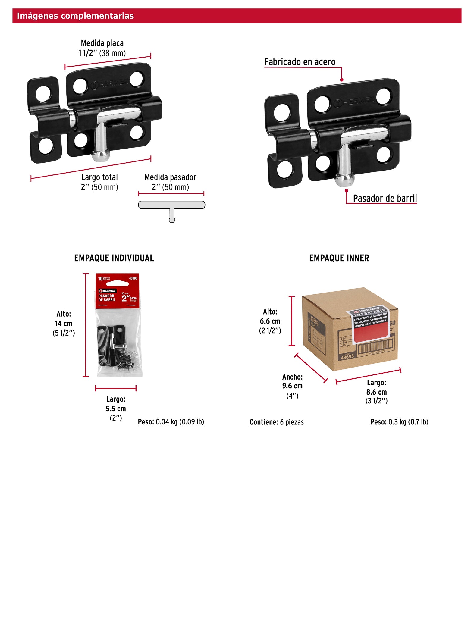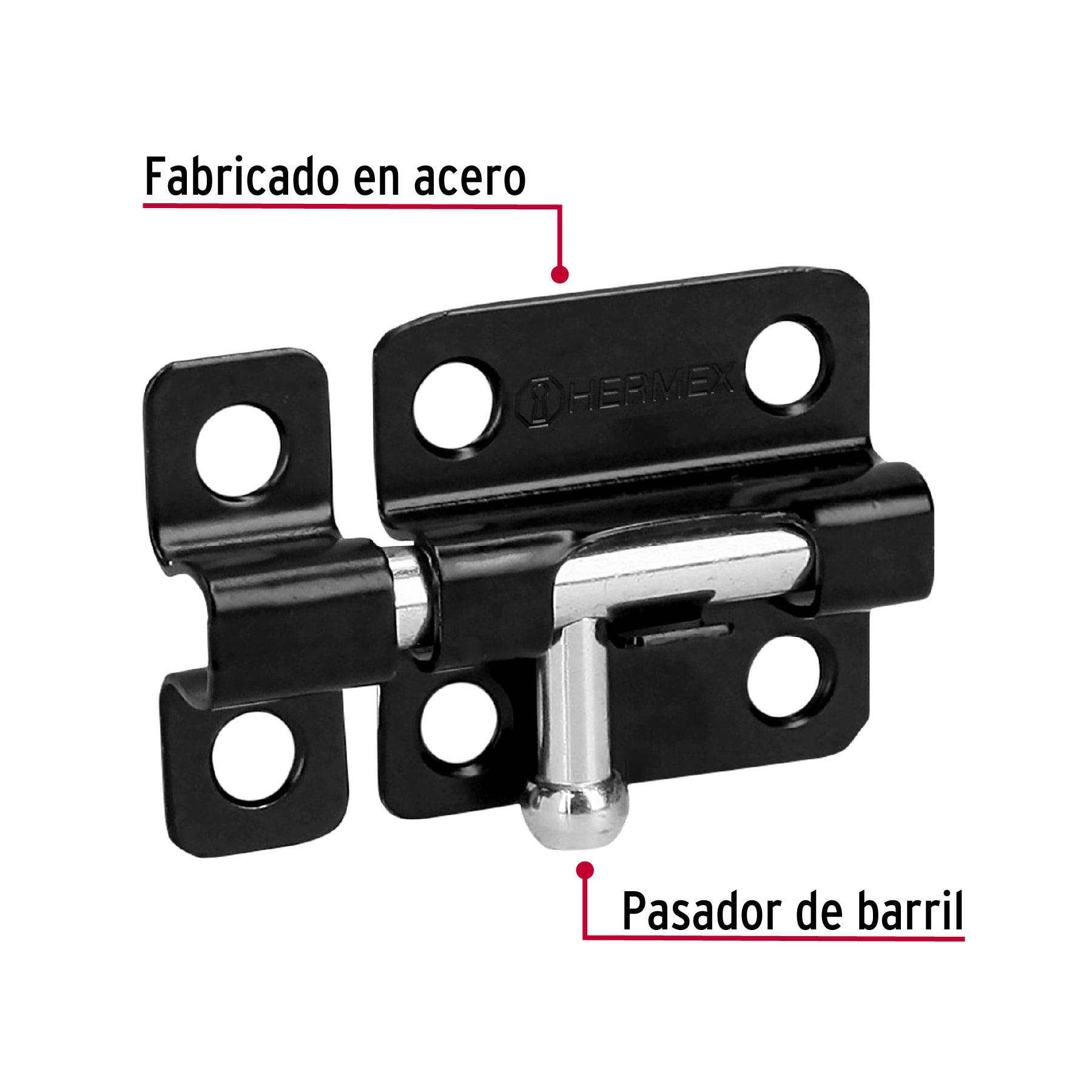 Pasador de barril de 2 pulgadas fabricado en acero resistente con acabado negro. Diseñado para instalación horizontal o vertical, incluye tornillería para su colocación. Ideal para reforzar la seguridad en puertas, portones o ventanas, ofreciendo durabilidad, resistencia a la corrosión y fácil manejo.