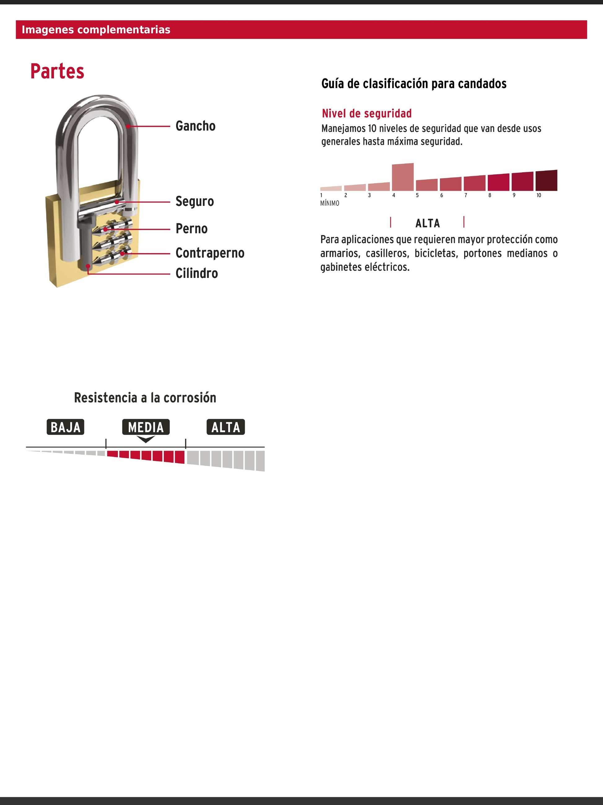Candados con cuerpo de hierro en una sola pieza y gancho corto de acero cromado. Tienen seguro tipo perno de seguridad estándar y cilindro de latón sólido con 6 pines que brinda resistencia a robos. Su mecanismo interno es resistente a la corrosión y ambos candados abren con la misma llave. Disponen de gancho de alta resistencia al corte.