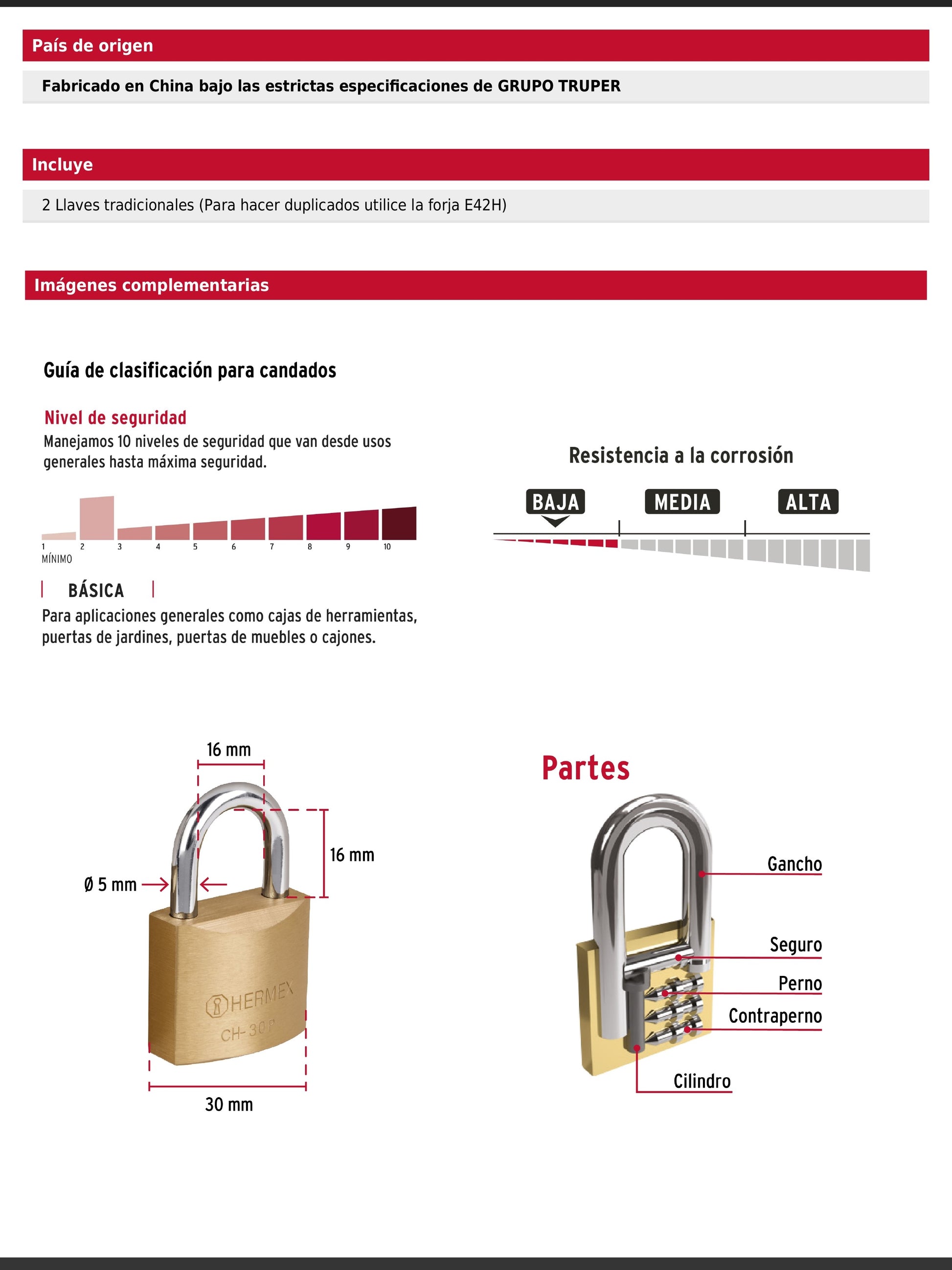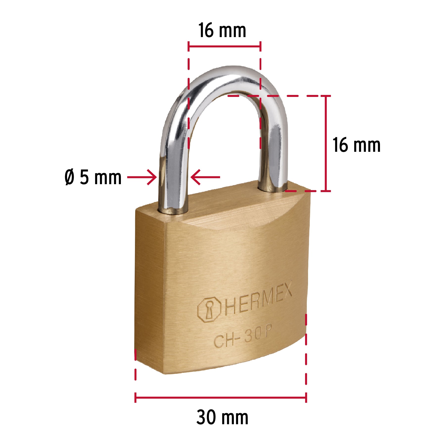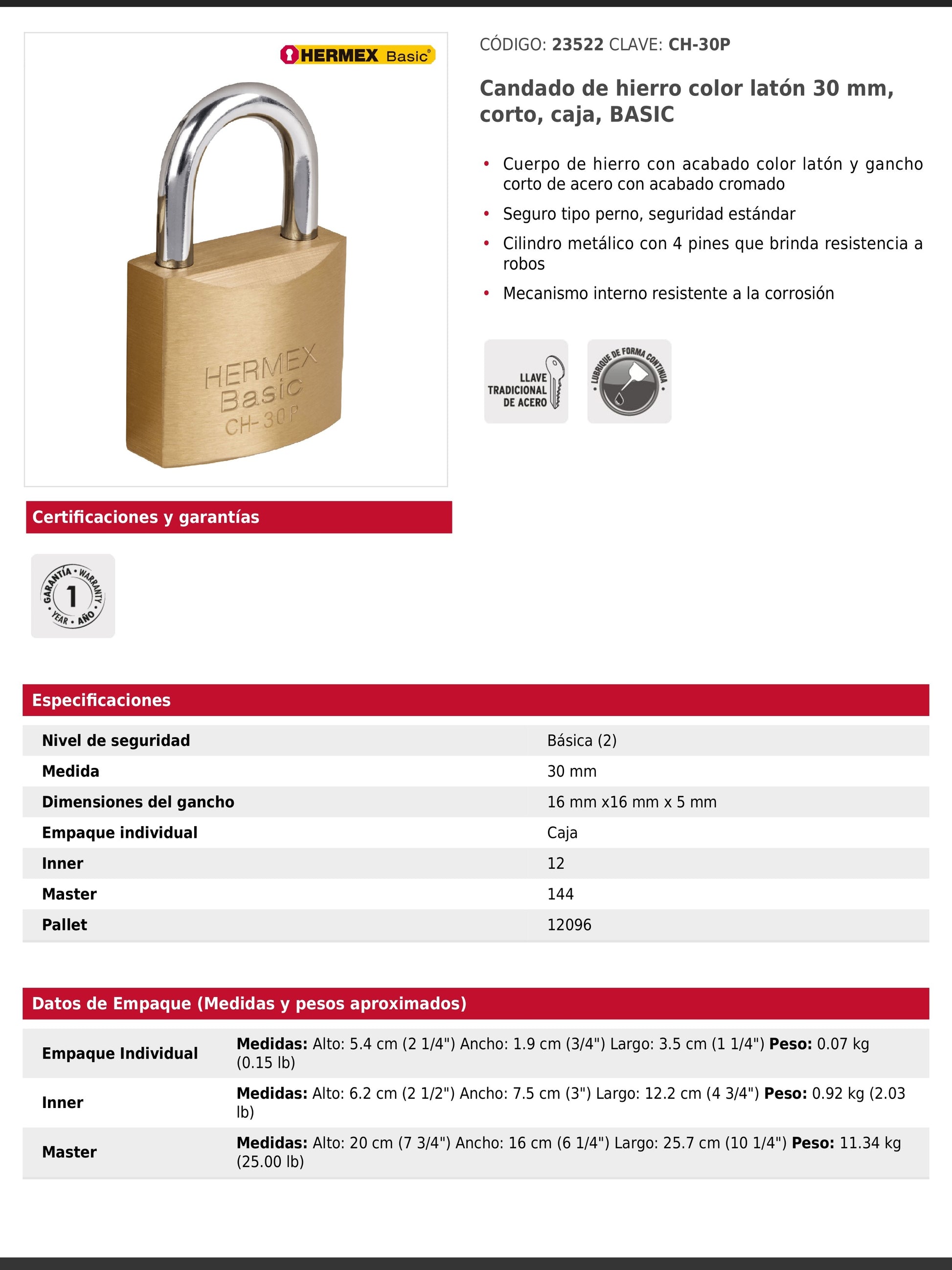 Candado de hierro con acabado latón y gancho corto de acero cromado, diseñado para un nivel de seguridad básica. Incorpora un cilindro metálico con 4 pines y seguro tipo perno estándar que ofrecen resistencia a robos. Su mecanismo interno es resistente a la corrosión e incluye 2 llaves tradicionales. Se presenta en empaque individual tipo caja.