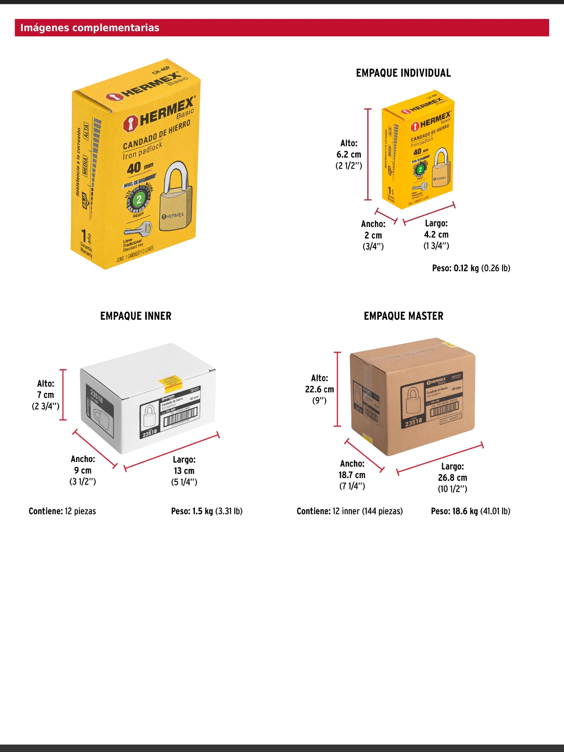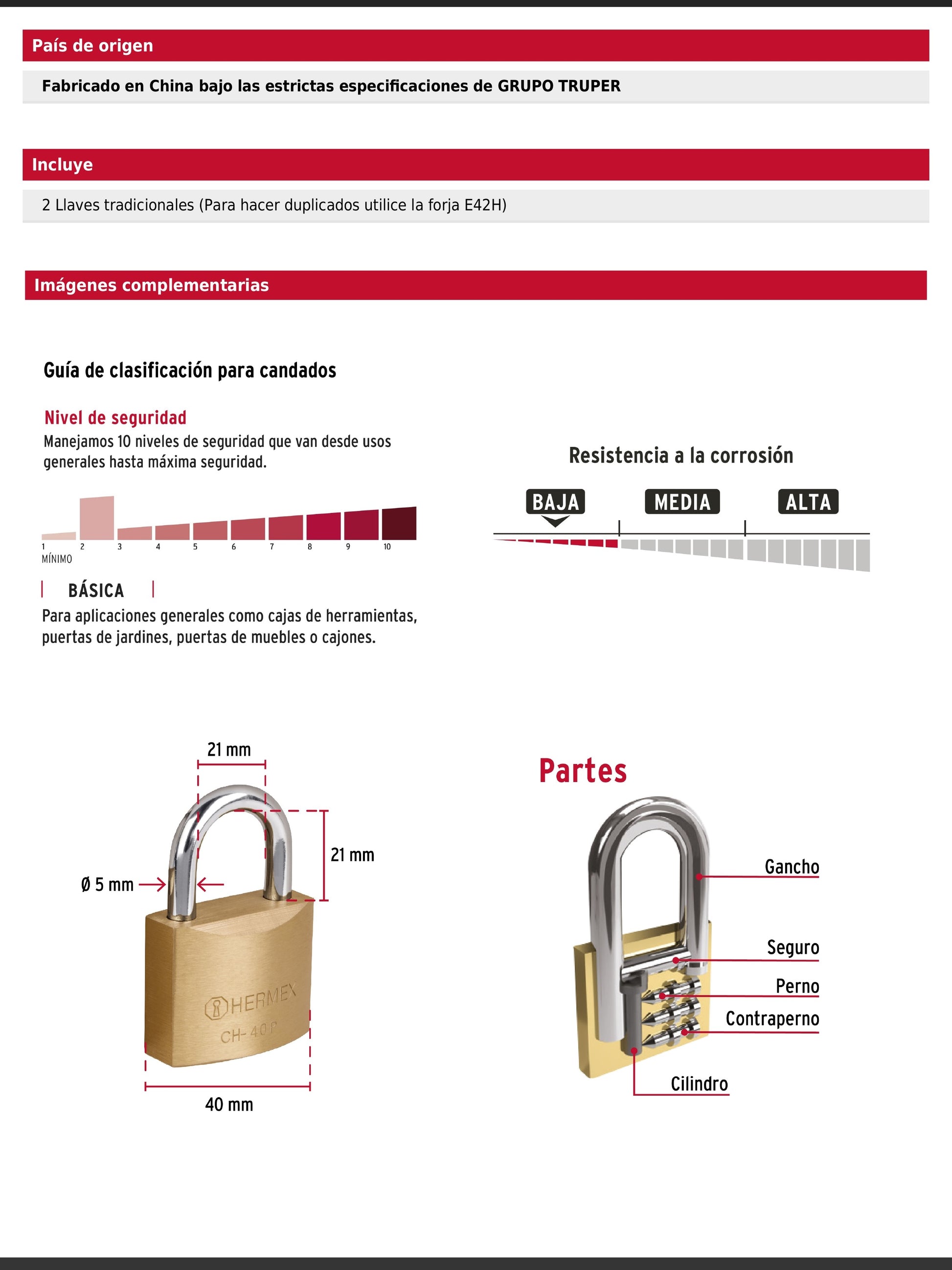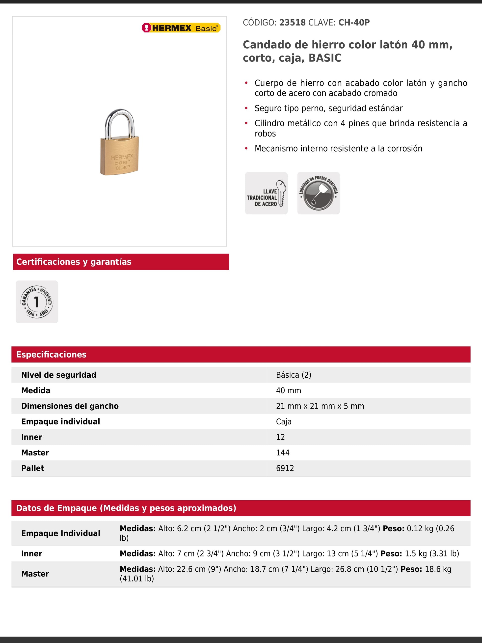 Candado de hierro con acabado latón y gancho corto de acero cromado, diseñado para un nivel de seguridad básica. Incorpora un cilindro metálico con 4 pines y seguro tipo perno estándar que brindan resistencia a robos. Su mecanismo interno es resistente a la corrosión e incluye 2 llaves tradicionales. Se presenta en empaque individual tipo caja.