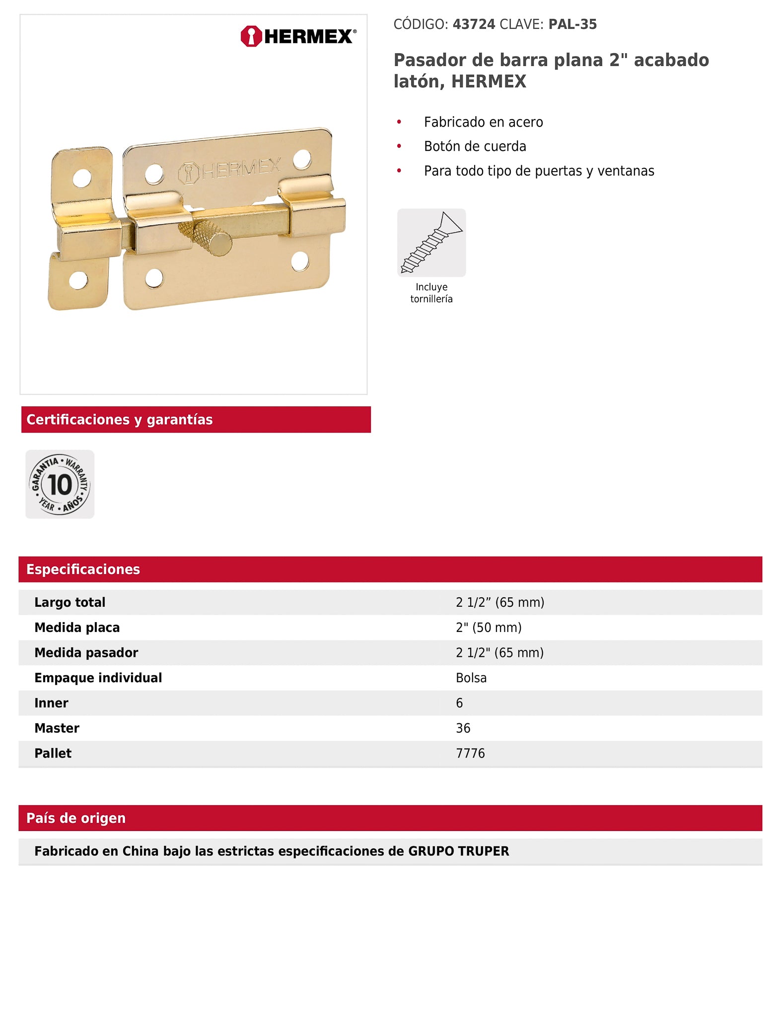 Pasador de barra plana de 2 pulgadas fabricado en acero resistente con acabado latón brillante. Incluye botón de cuerda y tornillería para su instalación. Ideal para puertas y ventanas de diversos materiales, garantizando seguridad, durabilidad y una apariencia decorativa de alta calidad.