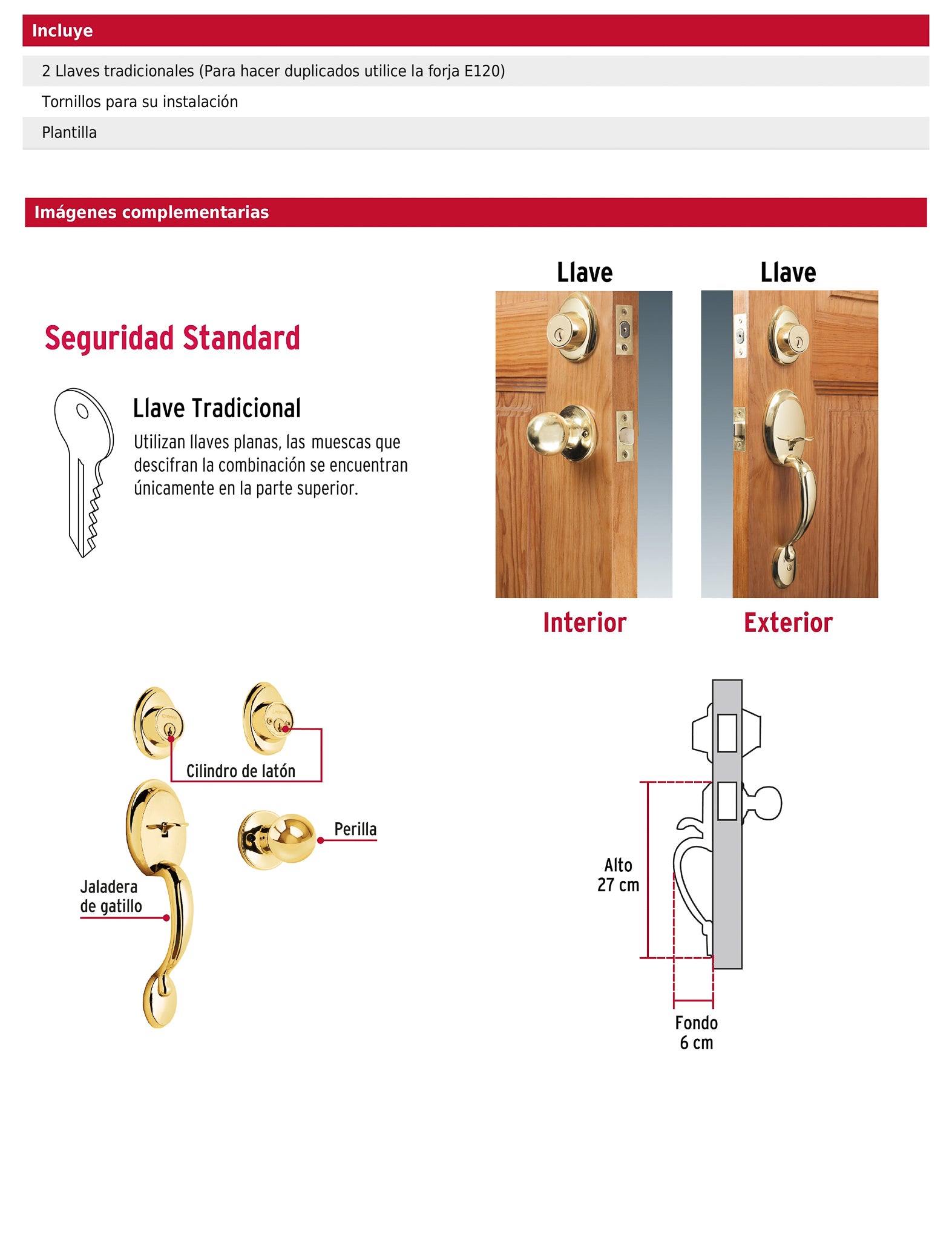 - Incluye 2 llaves tradicionales, tornillos y plantilla.
