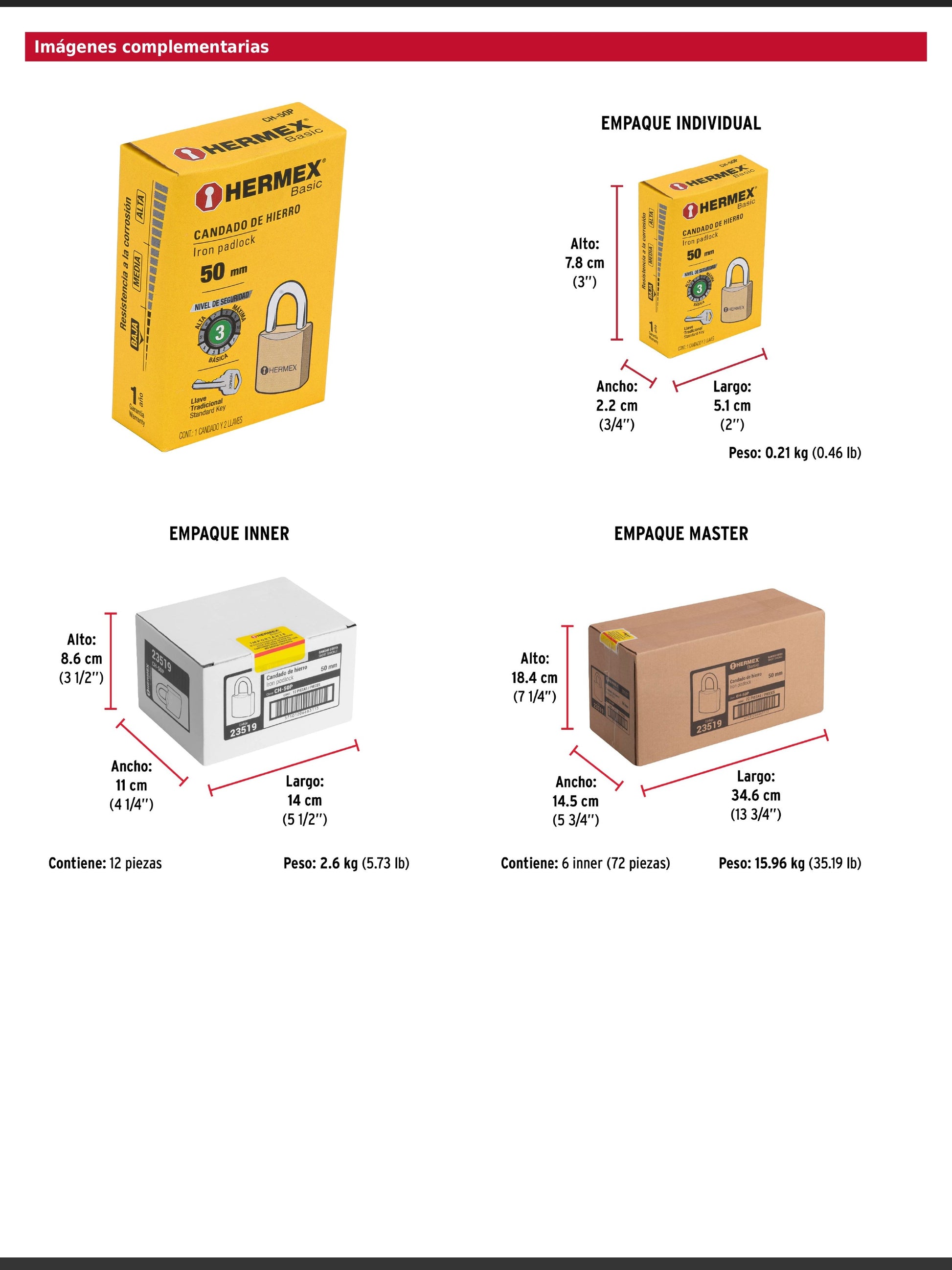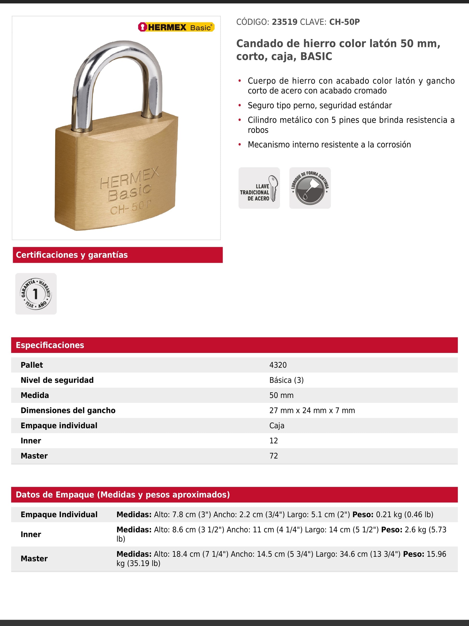 Candado de hierro con acabado latón y gancho corto de acero cromado, diseñado para un nivel de seguridad básica. Dispone de un cilindro metálico con 5 pines y seguro tipo perno estándar que brindan mayor resistencia a robos. Su mecanismo interno es resistente a la corrosión e incluye 2 llaves tradicionales. Se presenta en empaque individual tipo caja.
