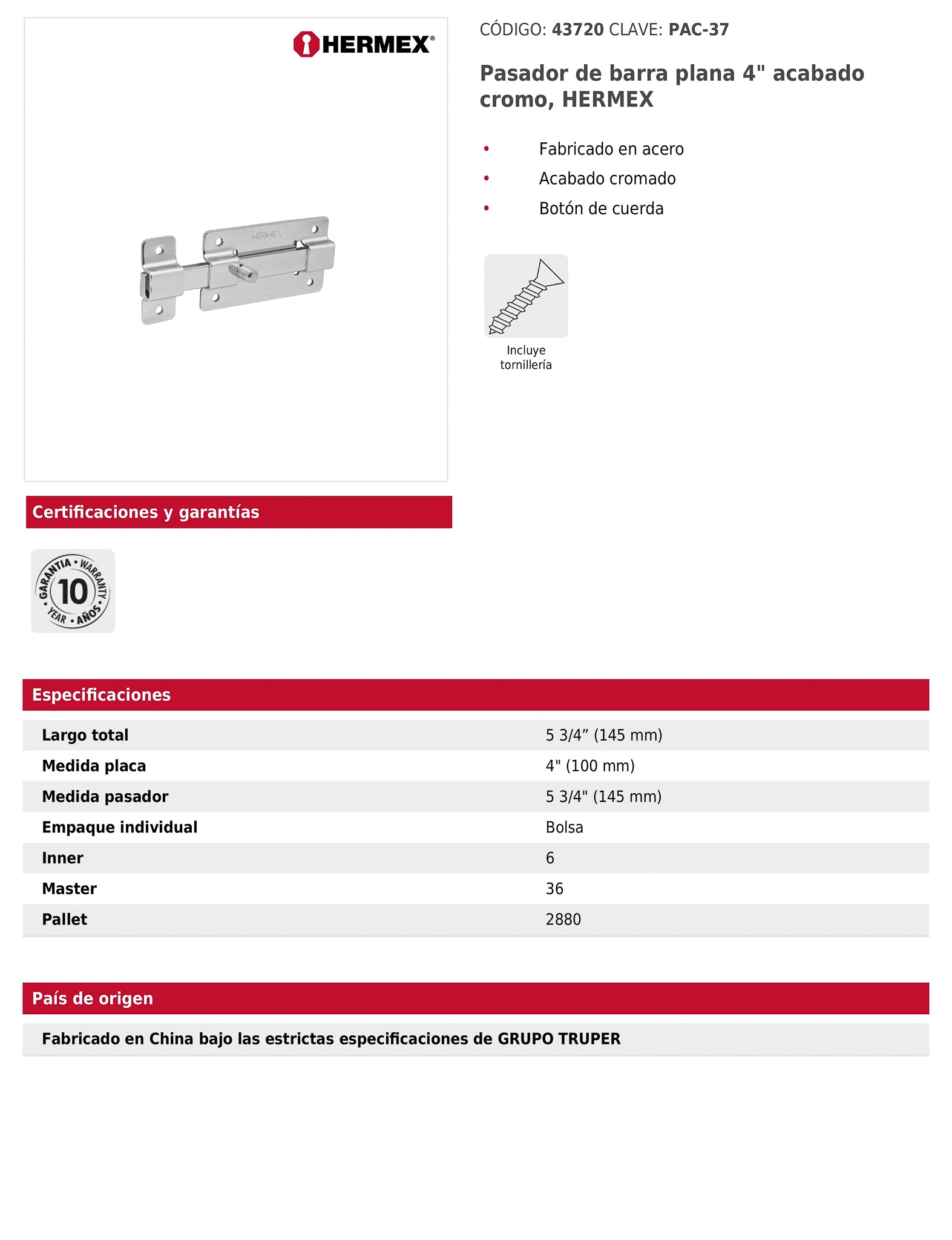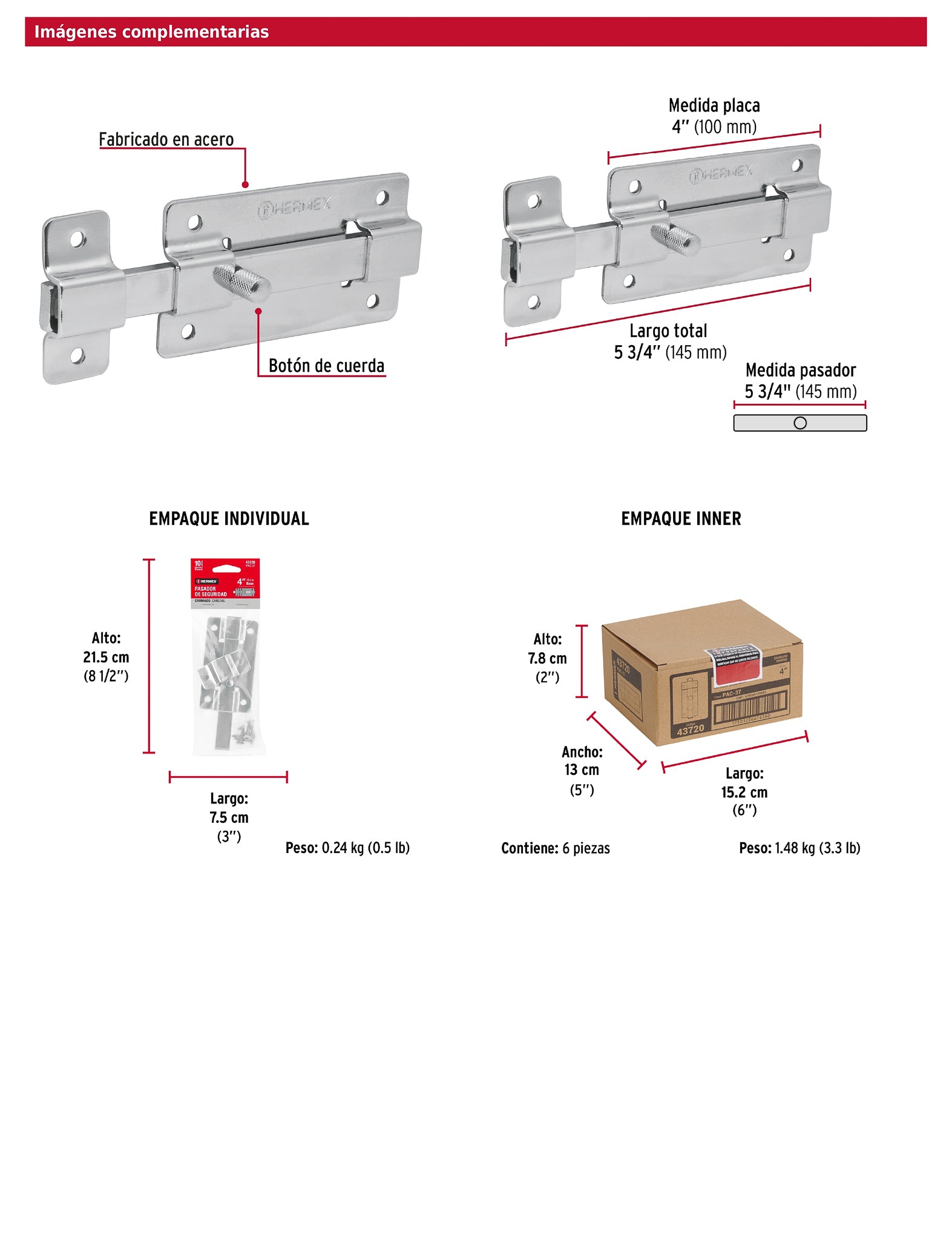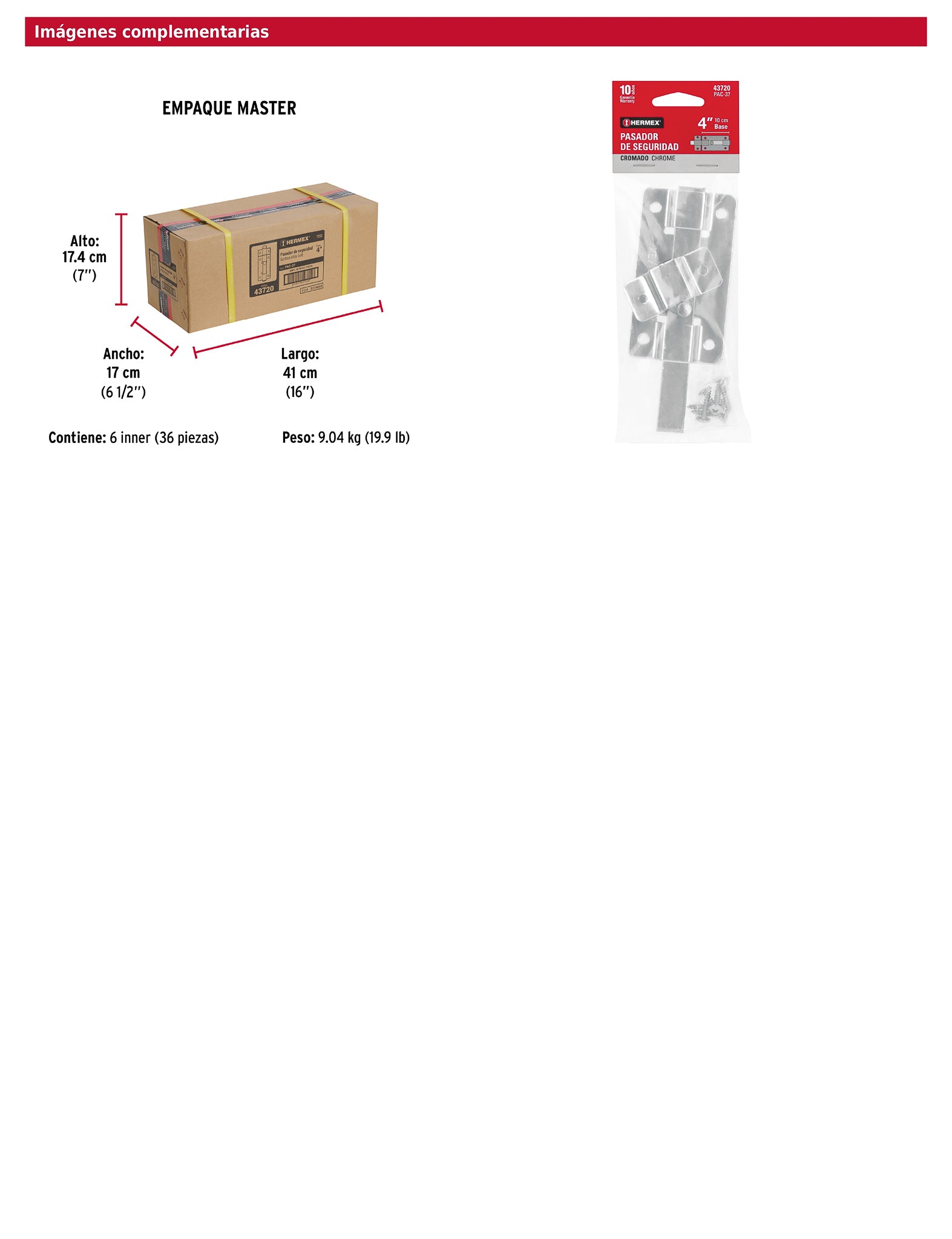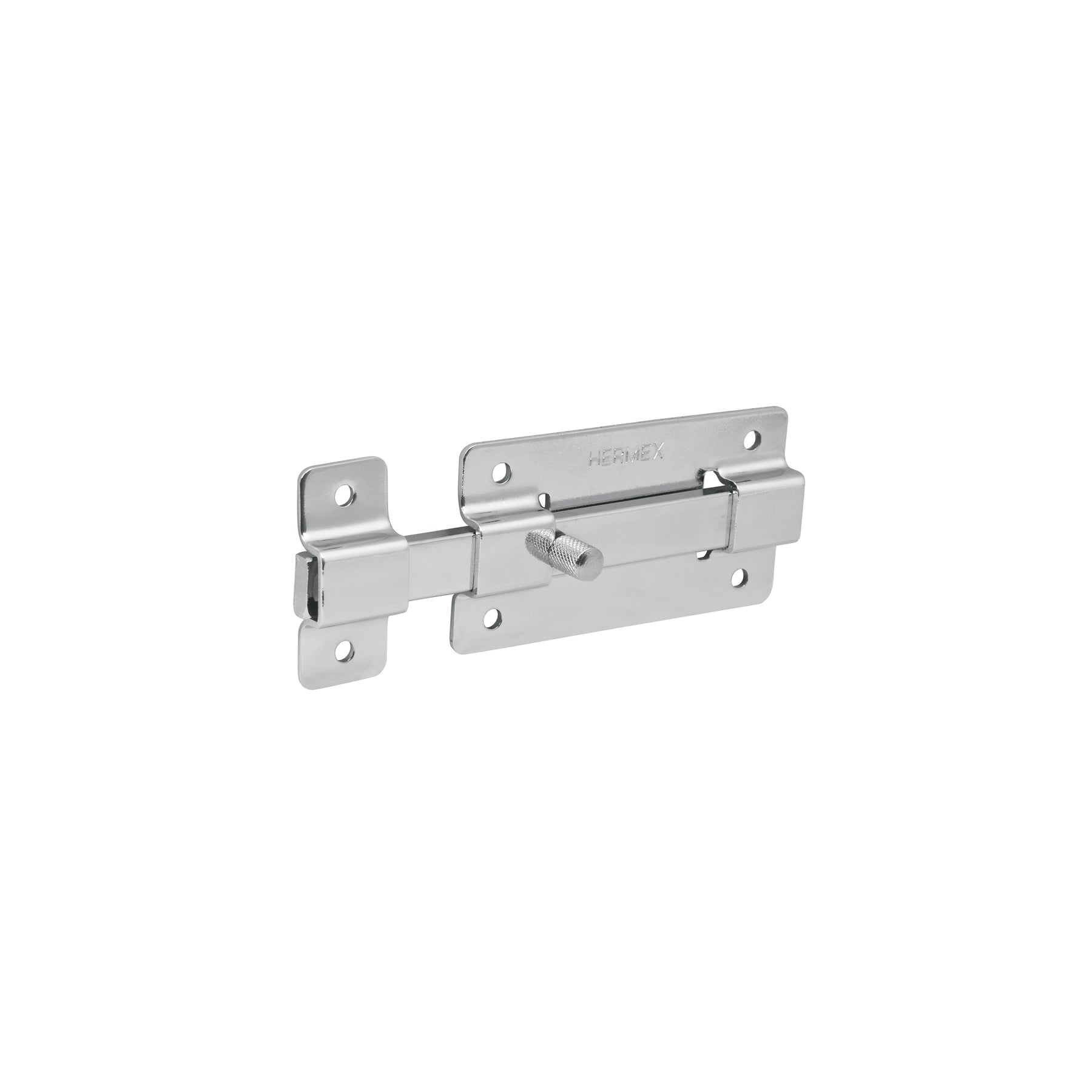 Pasador de barra plana de 4 pulgadas fabricado en acero de alta calidad con acabado cromado. Su diseño con botón de cuerda permite un cierre firme y fácil manejo. Incluye tornillería para instalación y está pensado para reforzar la seguridad en puertas metálicas o de madera, ofreciendo resistencia y un acabado brillante de larga duración.