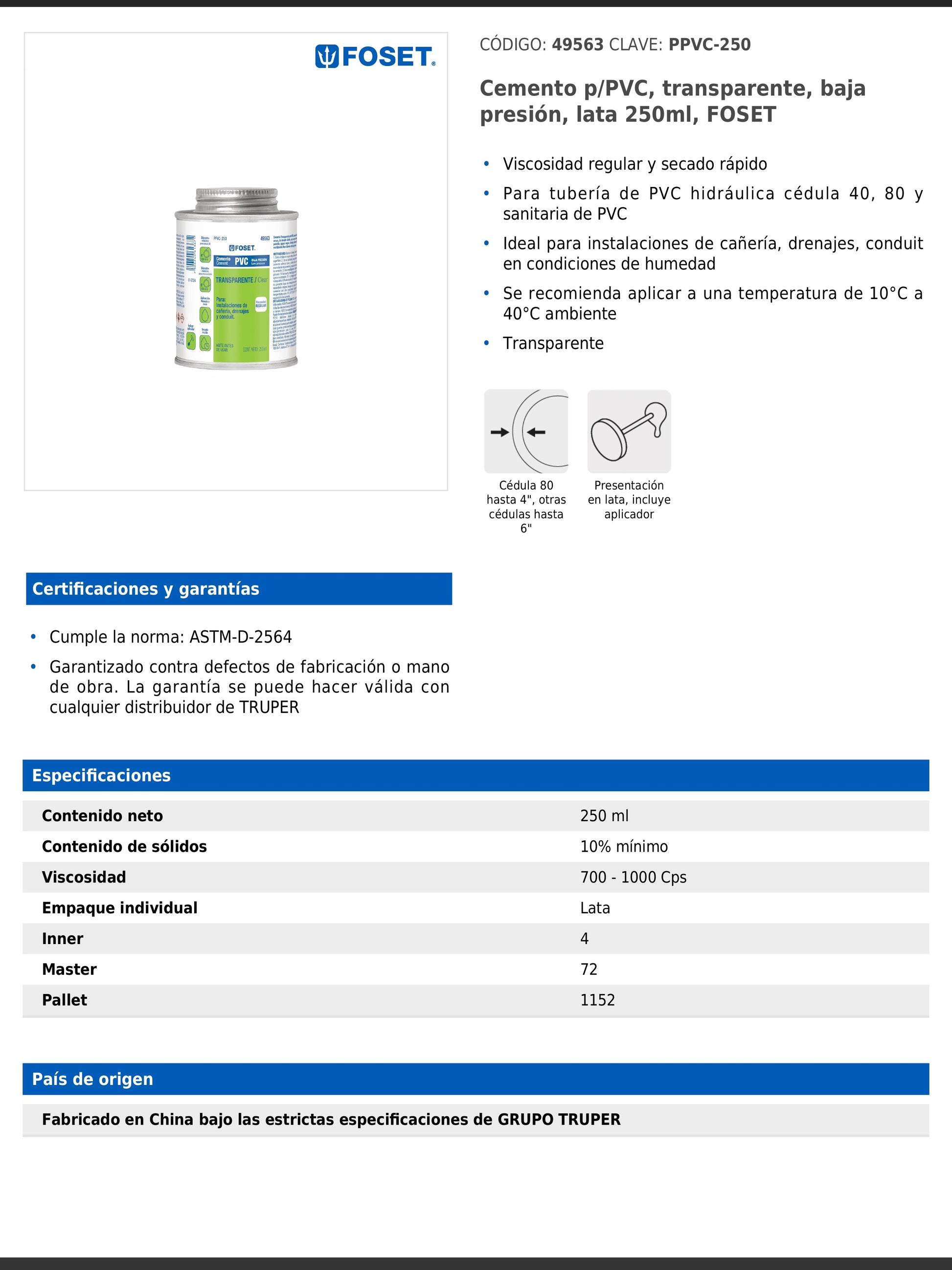 Adhesivo con viscosidad regular y secado rápido, diseñado para unir tuberías de PVC hidráulica cédula 40, 80 y sanitaria. Es ideal para instalaciones de cañería, drenajes y conduit en condiciones de humedad. Se recomienda su aplicación en un rango de temperatura ambiente de 10 °C a 40 °C. Presentación en lata transparente con aplicador incluido.