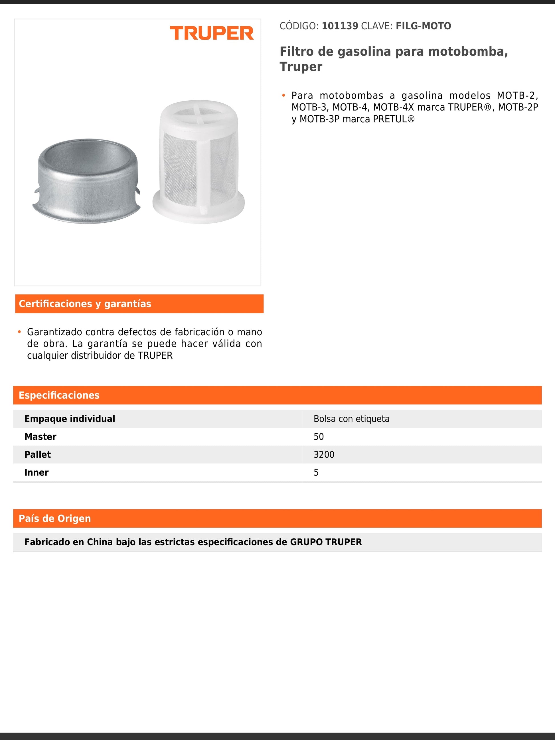 Filtro diseñado para motobombas a gasolina modelos MOTB-2, MOTB-3, MOTB-4, MOTB-4X de la línea Truper, y MOTB-2P y MOTB-3P de la línea Pretul. Fabricado bajo altos estándares que garantizan su compatibilidad y durabilidad.