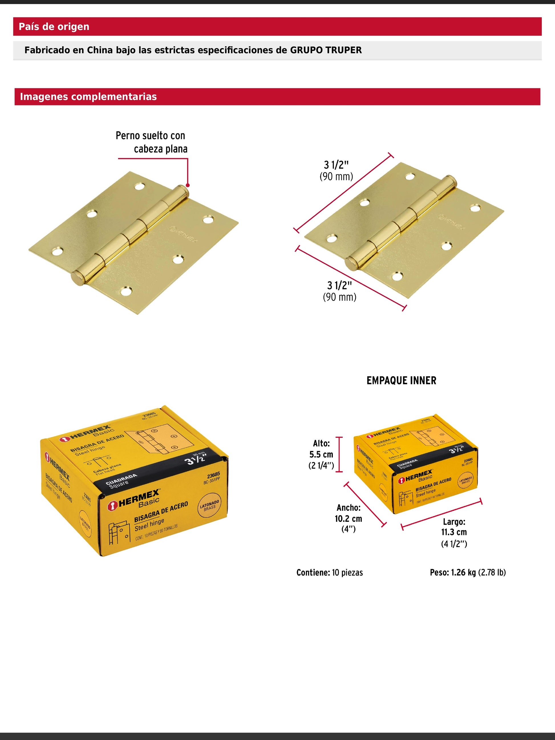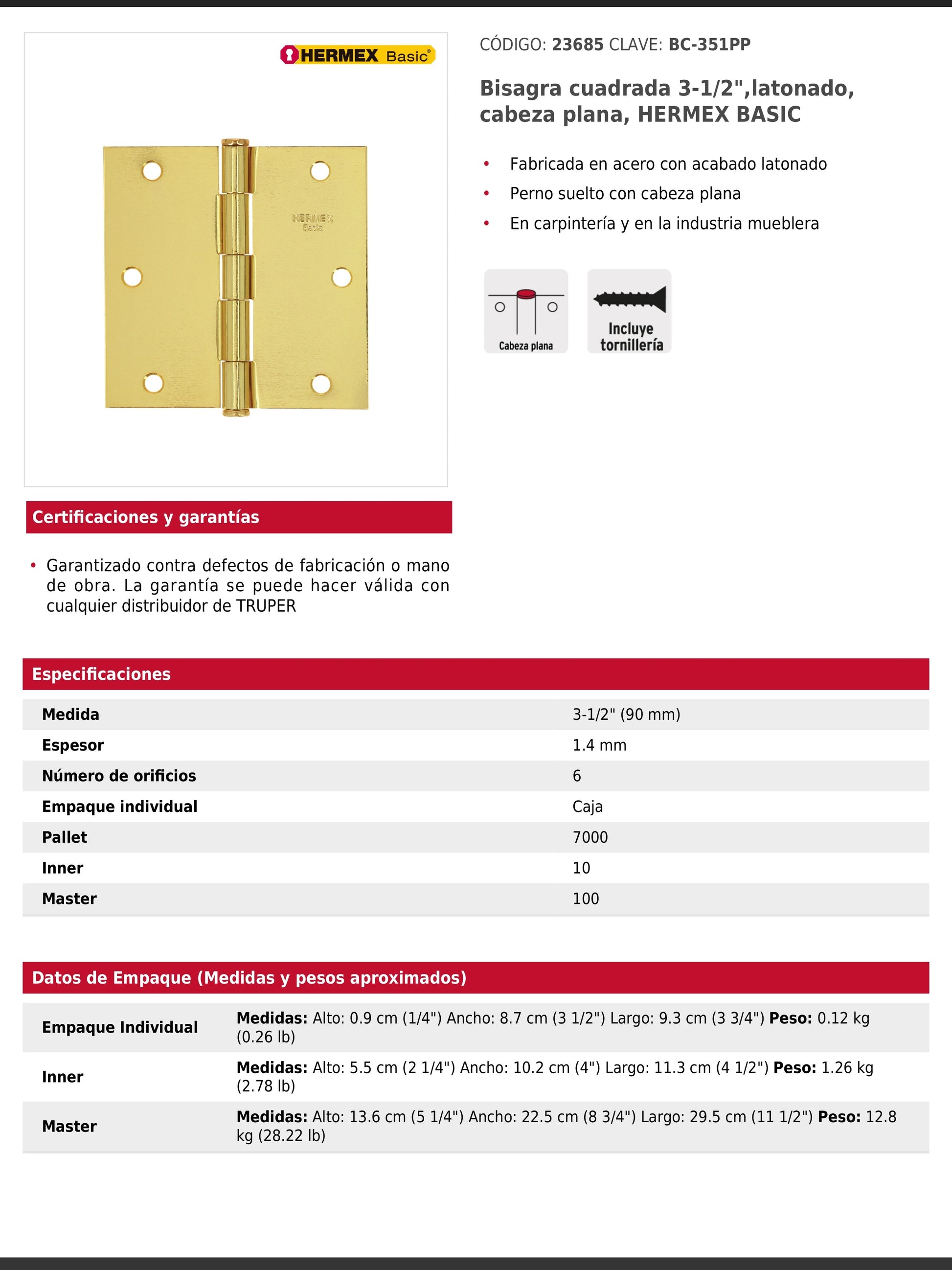 Fabricada en acero con acabado latonado, equipada con perno suelto con cabeza plana. Diseñada para trabajos de carpintería y en la industria mueblera. Incluye garantía contra defectos de fabricación o mano de obra.