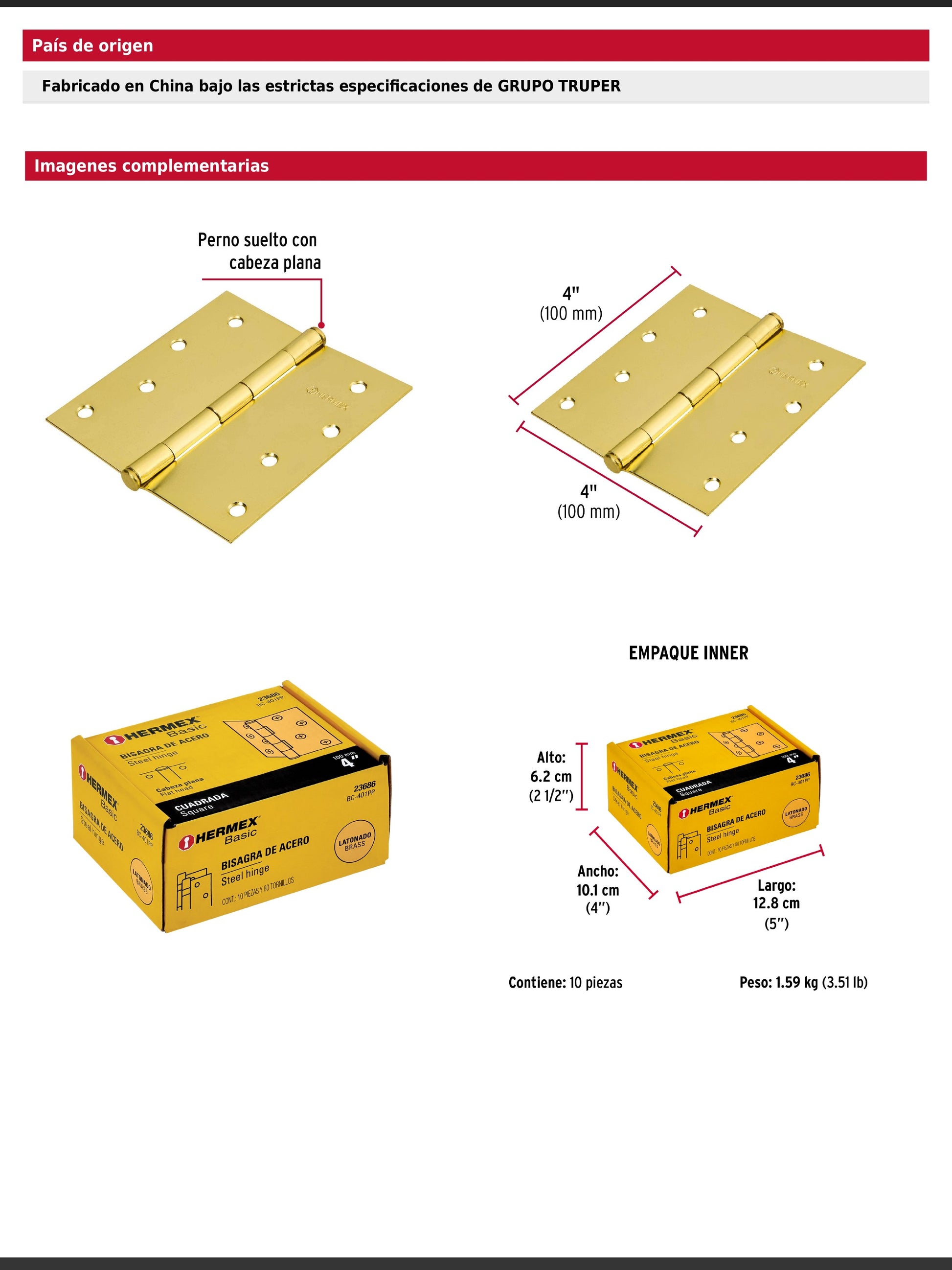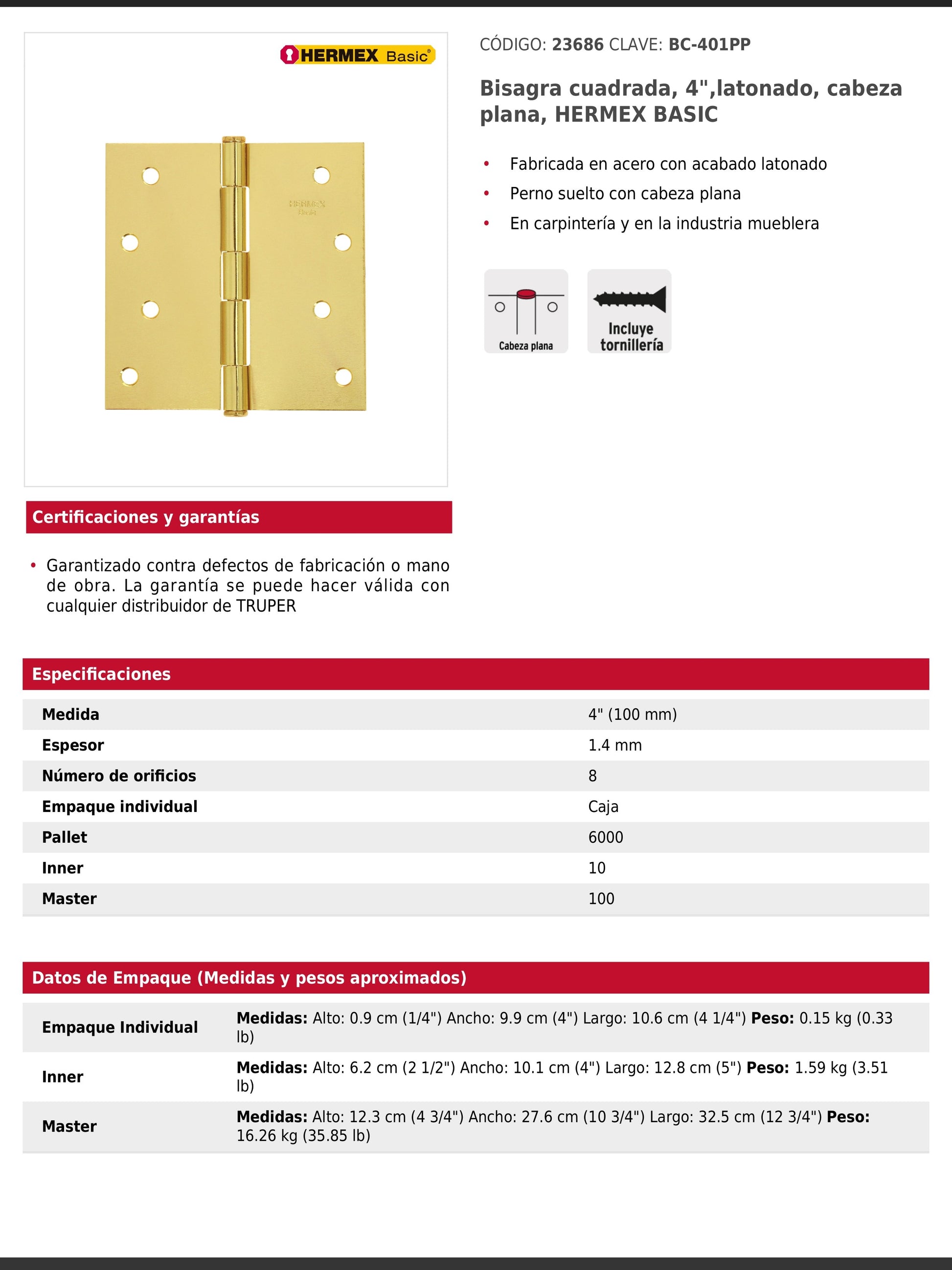 Fabricada en acero con acabado latonado, integra perno suelto con cabeza plana. Indicada para carpintería y para la industria mueblera. Incluye garantía contra defectos de fabricación o mano de obra.