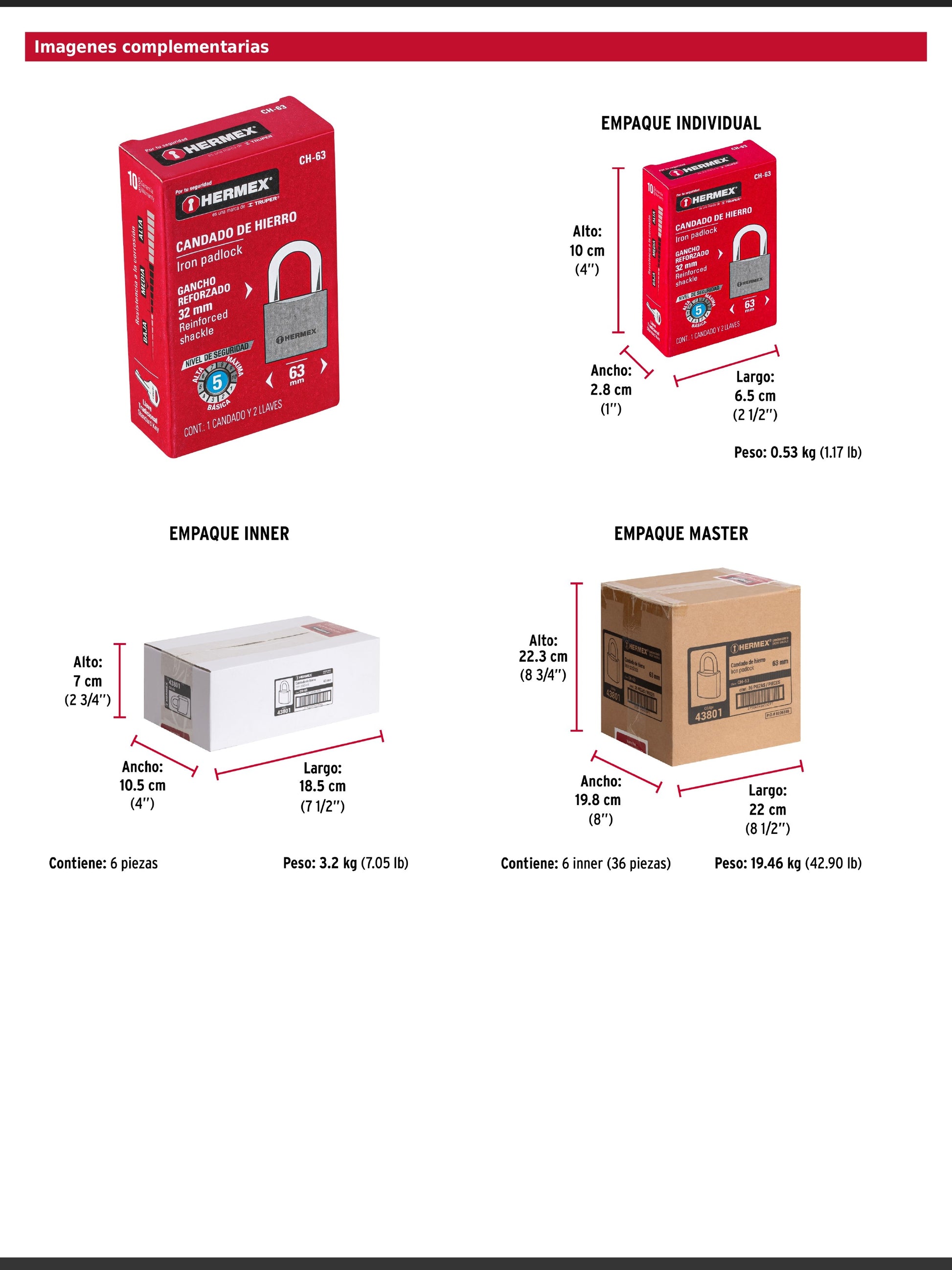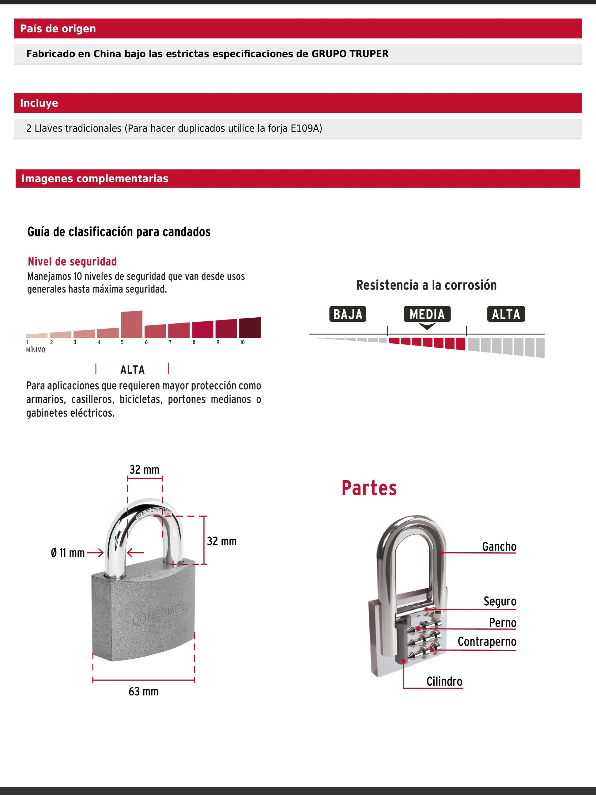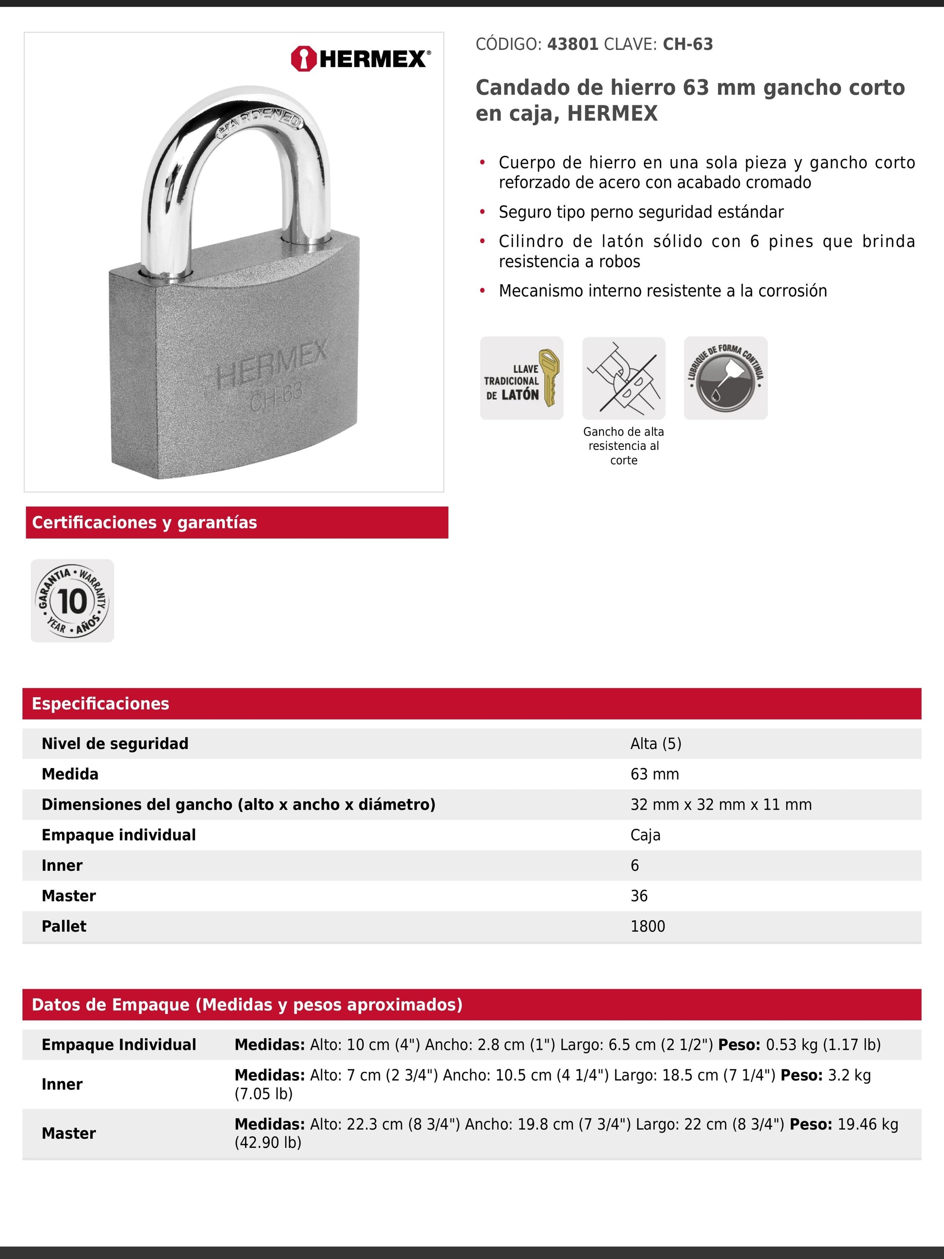 Candado de hierro en una sola pieza con gancho corto reforzado de acero cromado. Incorpora seguro tipo perno estándar y cilindro de latón sólido con 6 pines que brindan resistencia a robos. Su mecanismo interno es resistente a la corrosión para mayor durabilidad.