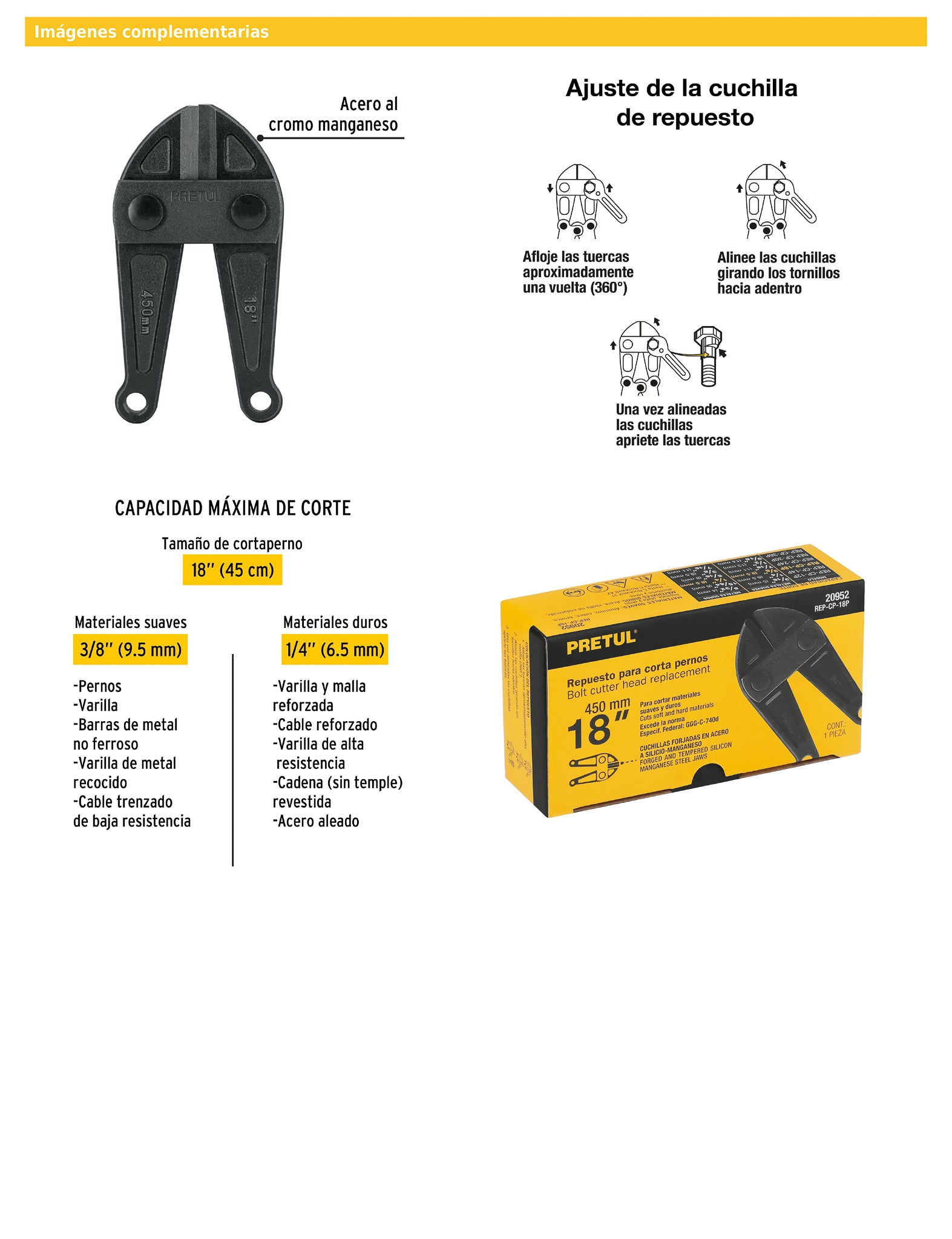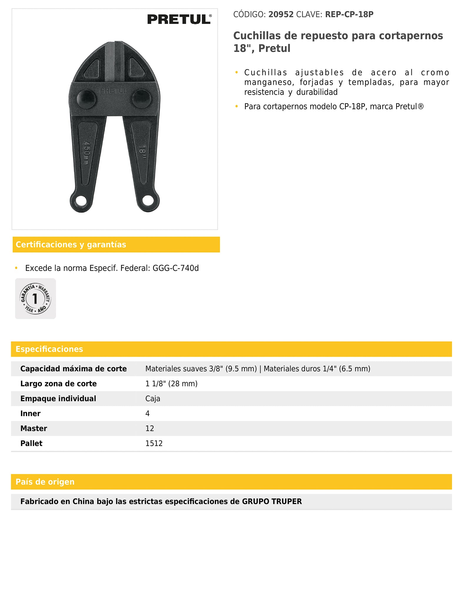 Cuchillas ajustables forjadas y templadas en acero al cromo manganeso para mayor resistencia y durabilidad, compatibles con el cortapernos modelo CP-18P. Exceden la Especificación Federal GGG-C-740d y se entregan en empaque individual tipo caja; fabricadas en China bajo las estrictas especificaciones de Grupo Truper.