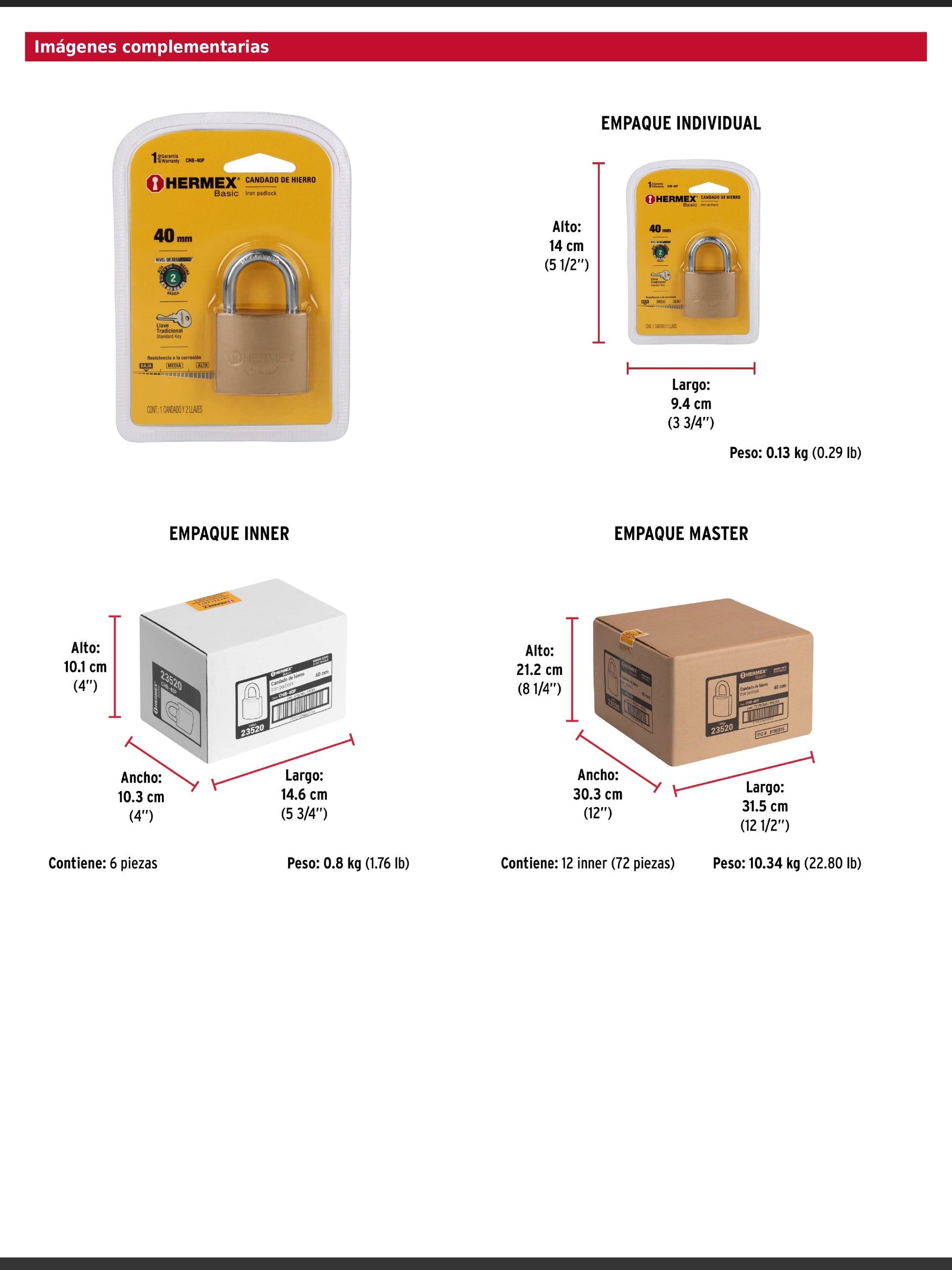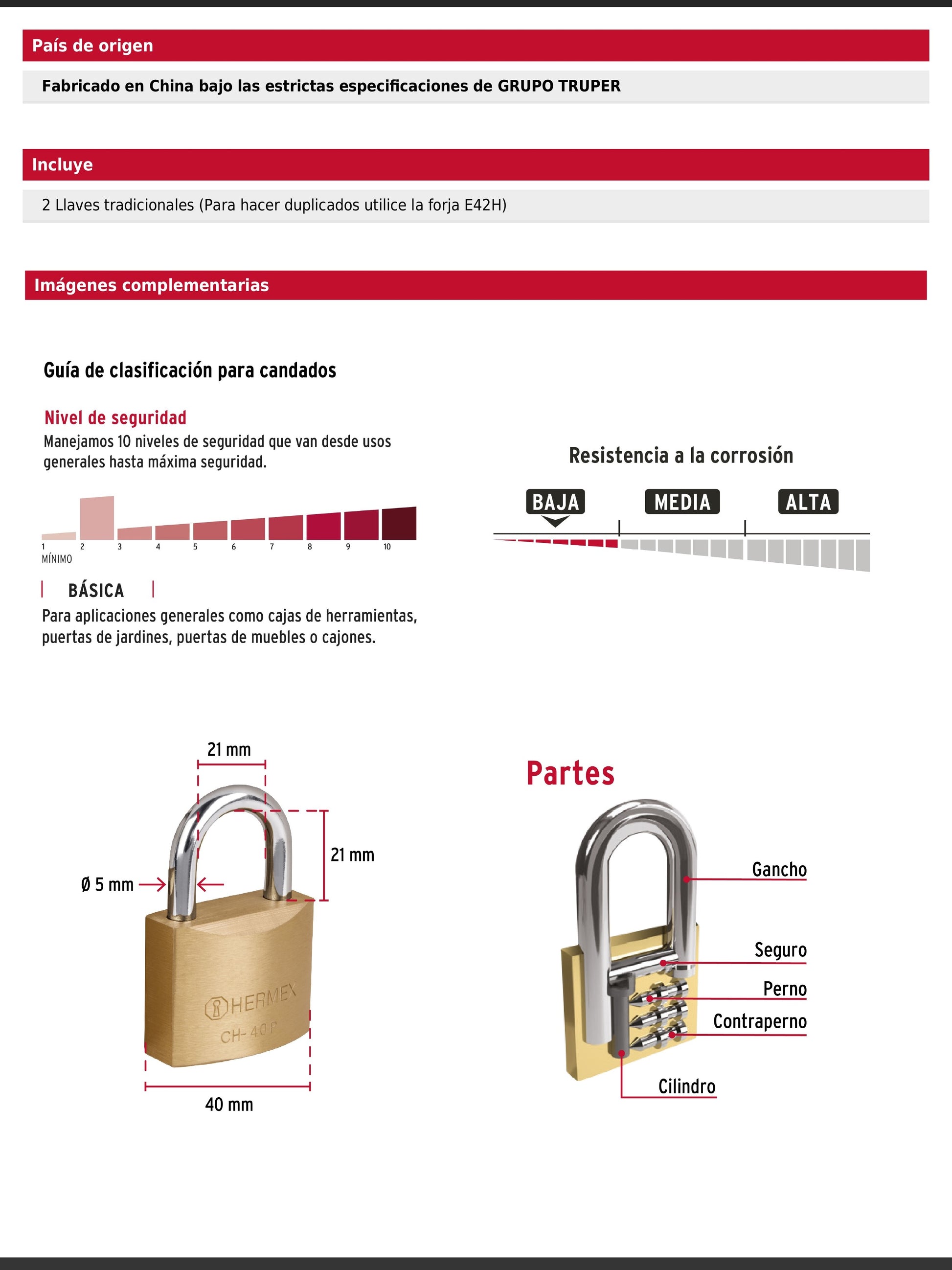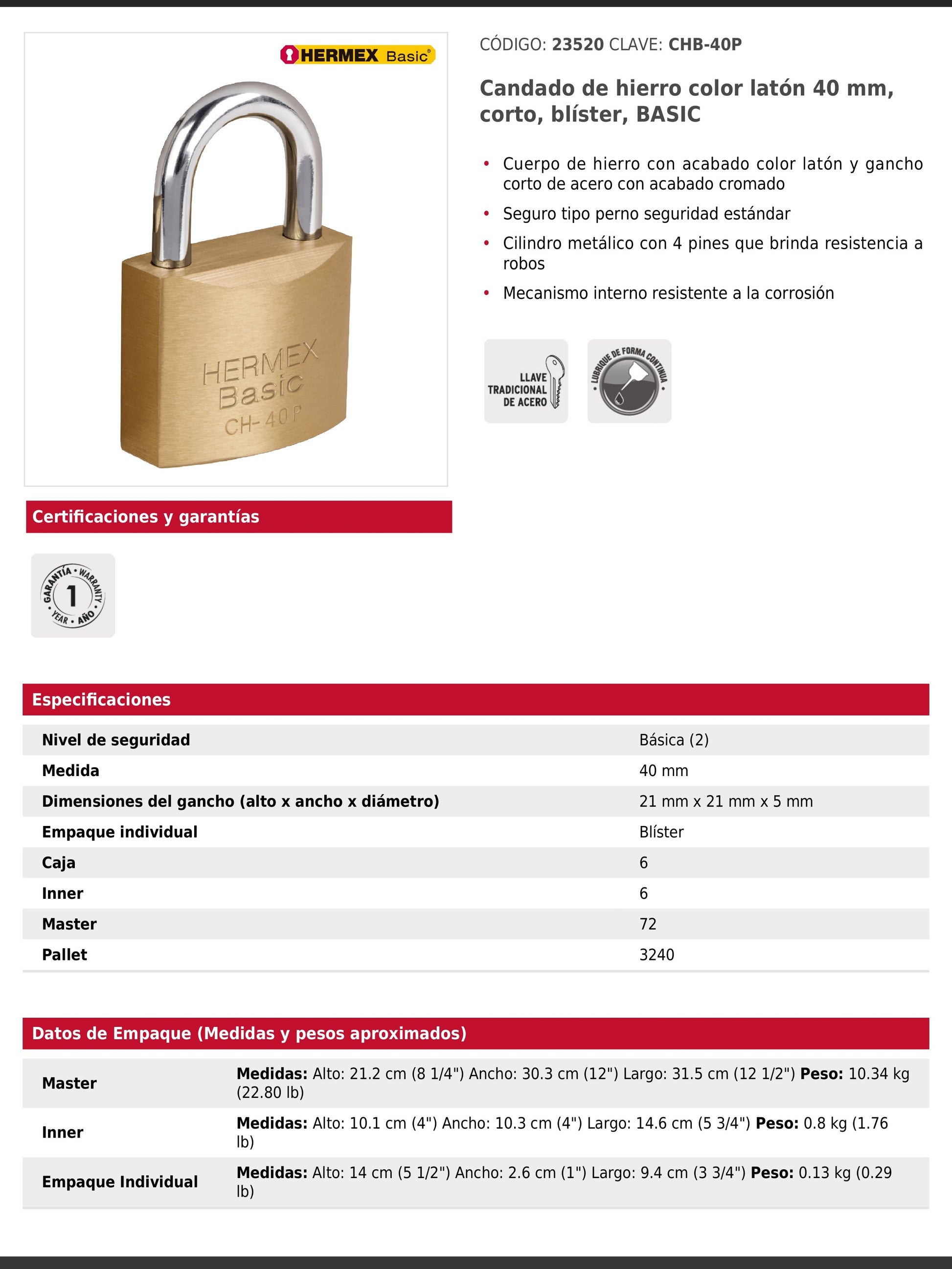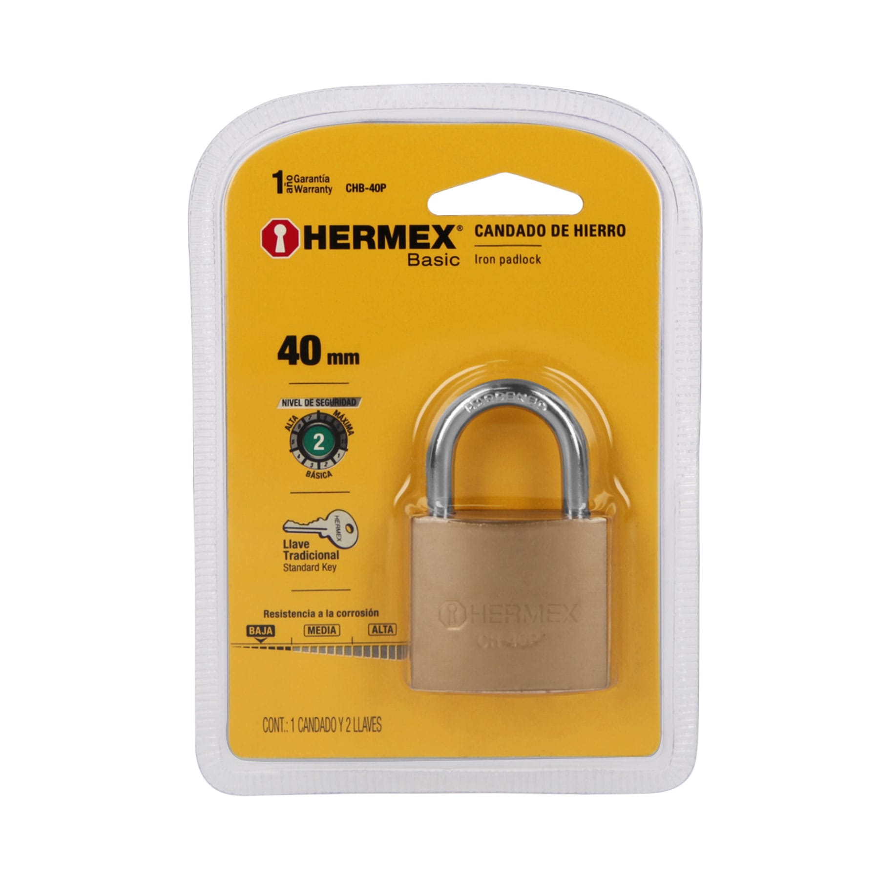 Candado fabricado en hierro con acabado latón y gancho corto de acero cromado, diseñado para un nivel de seguridad básica. Incorpora un cilindro metálico con 4 pines y seguro tipo perno estándar que brindan resistencia a robos. Su mecanismo interno es resistente a la corrosión e incluye 2 llaves tradicionales. Se presenta en empaque individual tipo blíster.