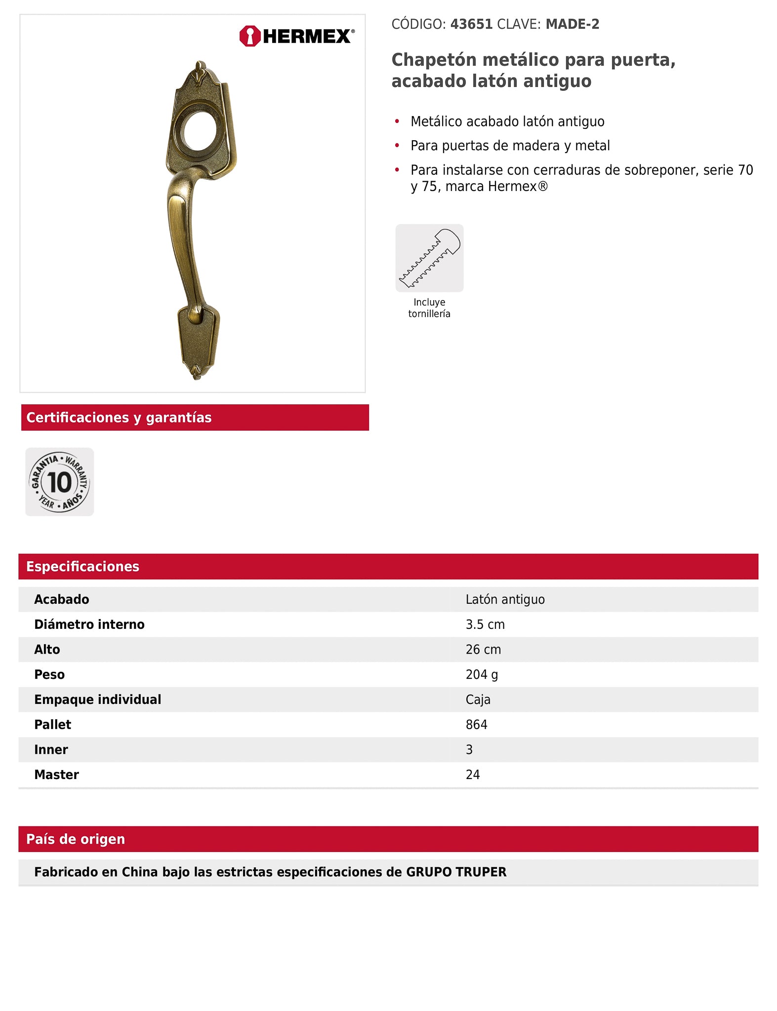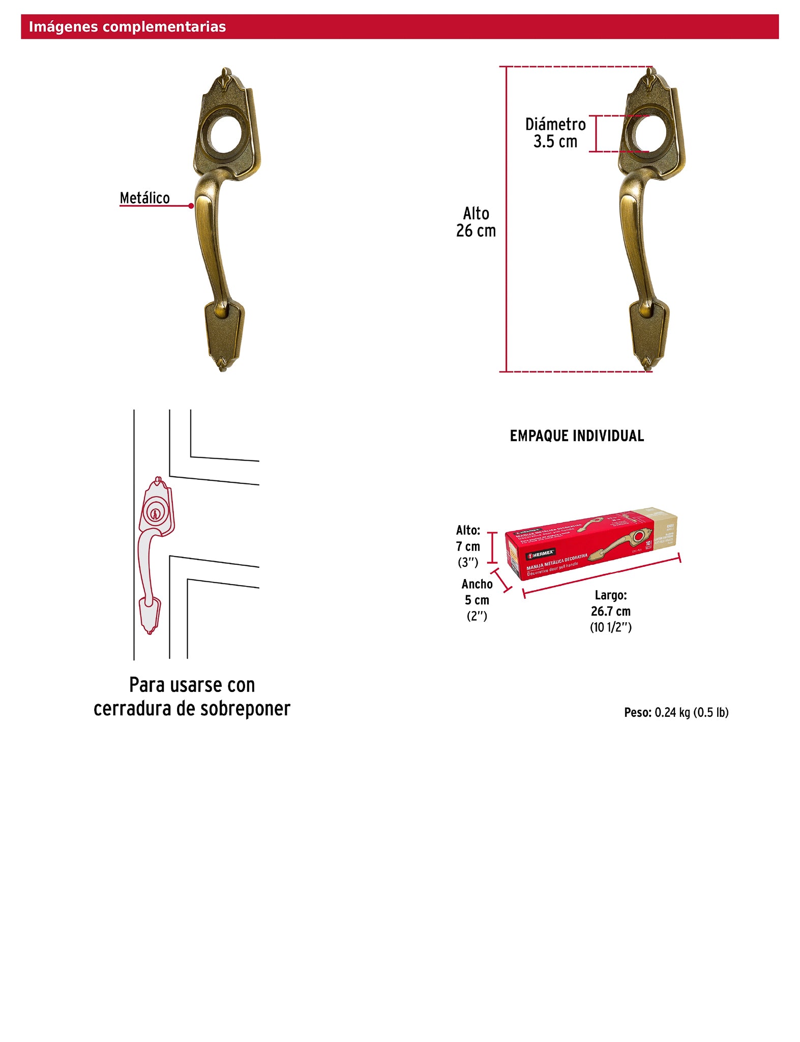 Chapetón metálico ideal para puertas de madera o metal, con acabado en latón antiguo que aporta un toque elegante y duradero. Diseñado para instalarse junto a cerraduras de sobreponer serie 70 y 75, incluye tornillería para una instalación rápida y segura. Perfecto para mantener un estilo tradicional con excelente resistencia al desgaste.