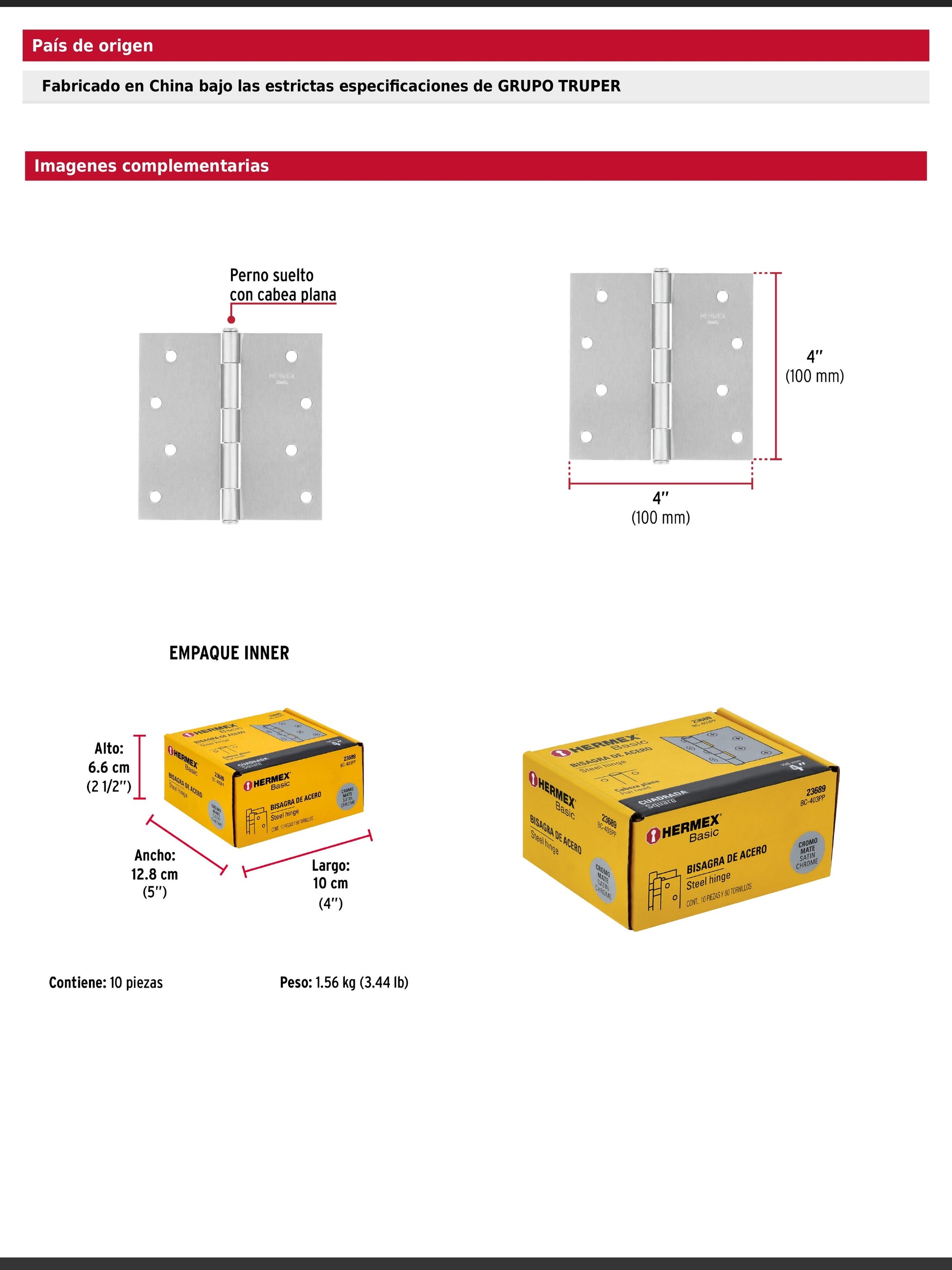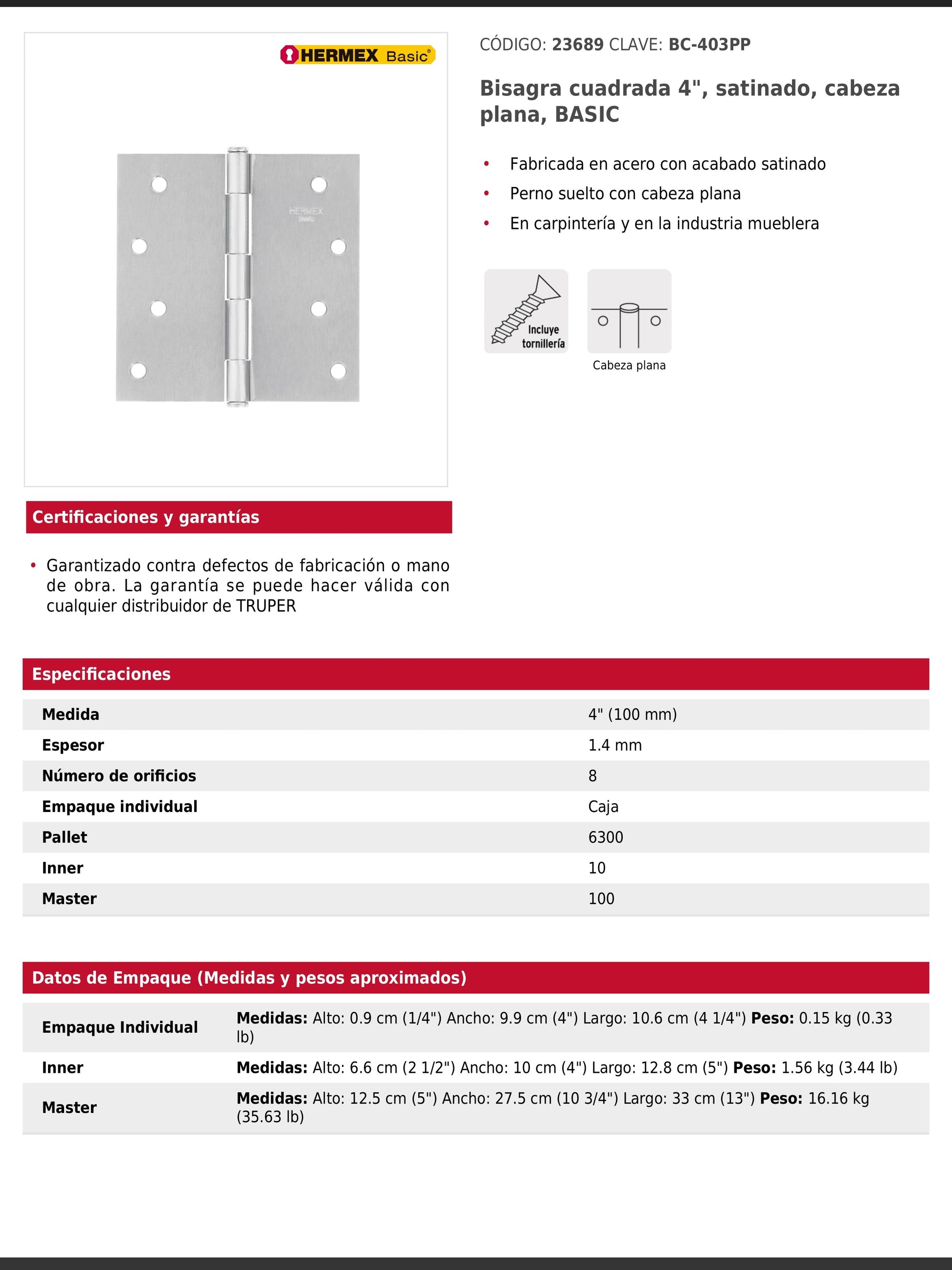 Fabricada en acero con acabado satinado, cuenta con perno suelto con cabeza plana. Es ideal para aplicaciones en carpintería y en la industria mueblera. Incluye garantía contra defectos de fabricación o mano de obra.