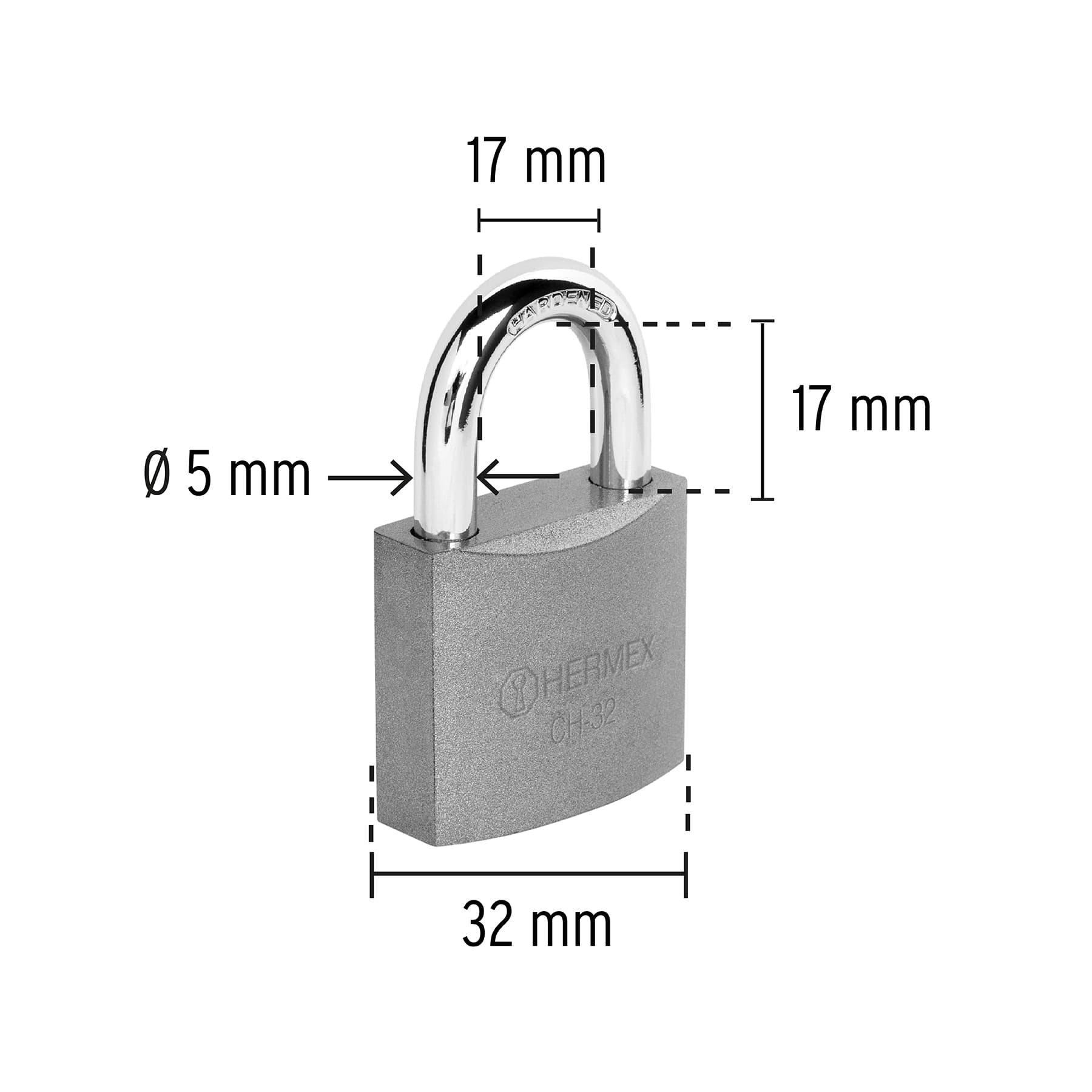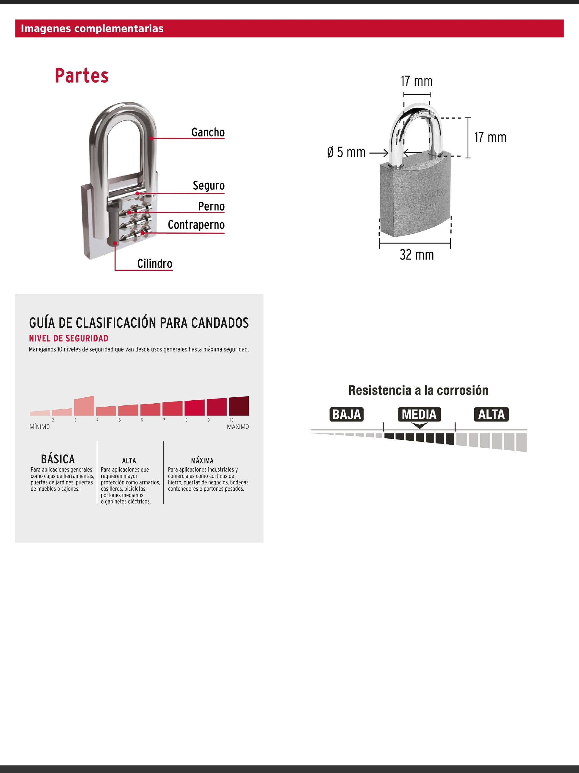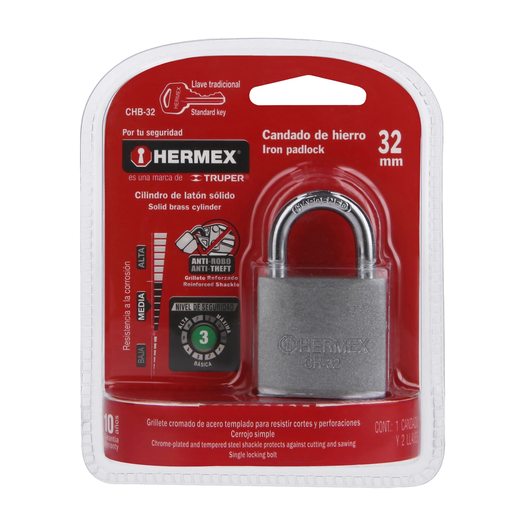 Candado de hierro en una sola pieza con gancho corto reforzado de acero cromado. Incluye seguro tipo perno estándar y cilindro de latón sólido con 5 pines que brindan resistencia a robos. Su mecanismo interno es resistente a la corrosión para mayor durabilidad.