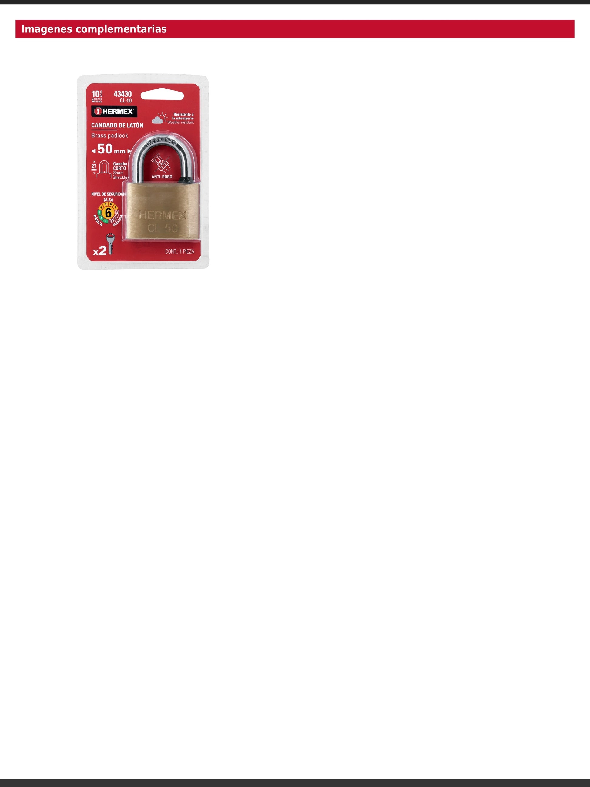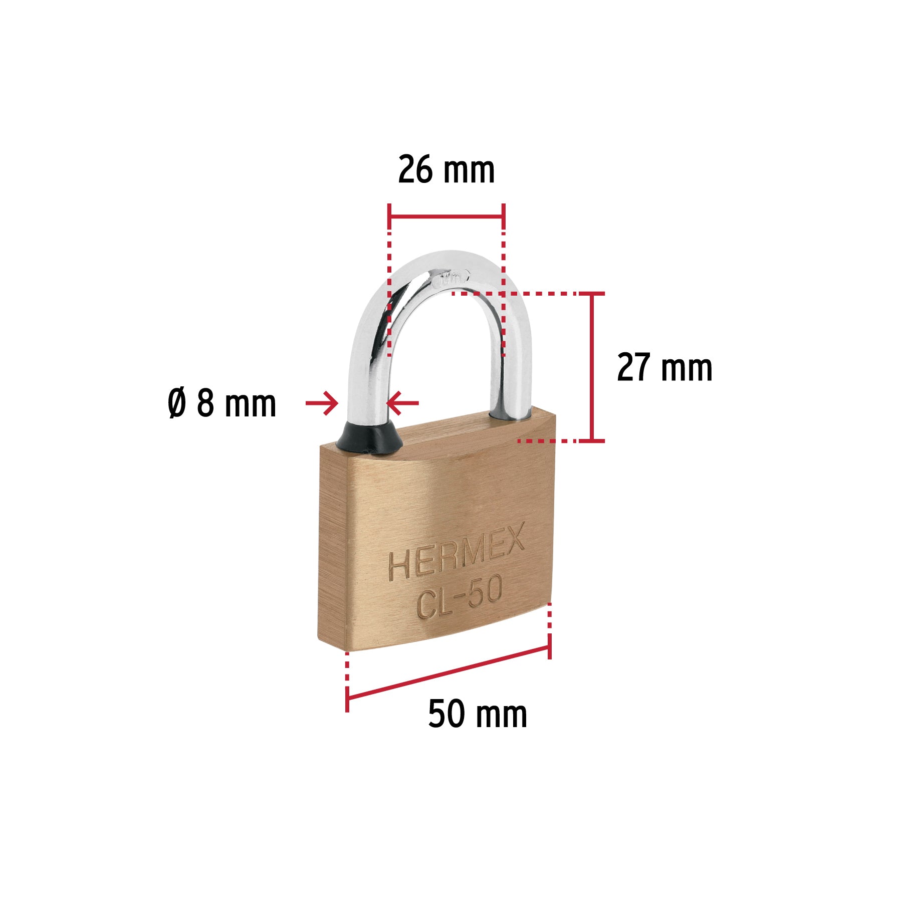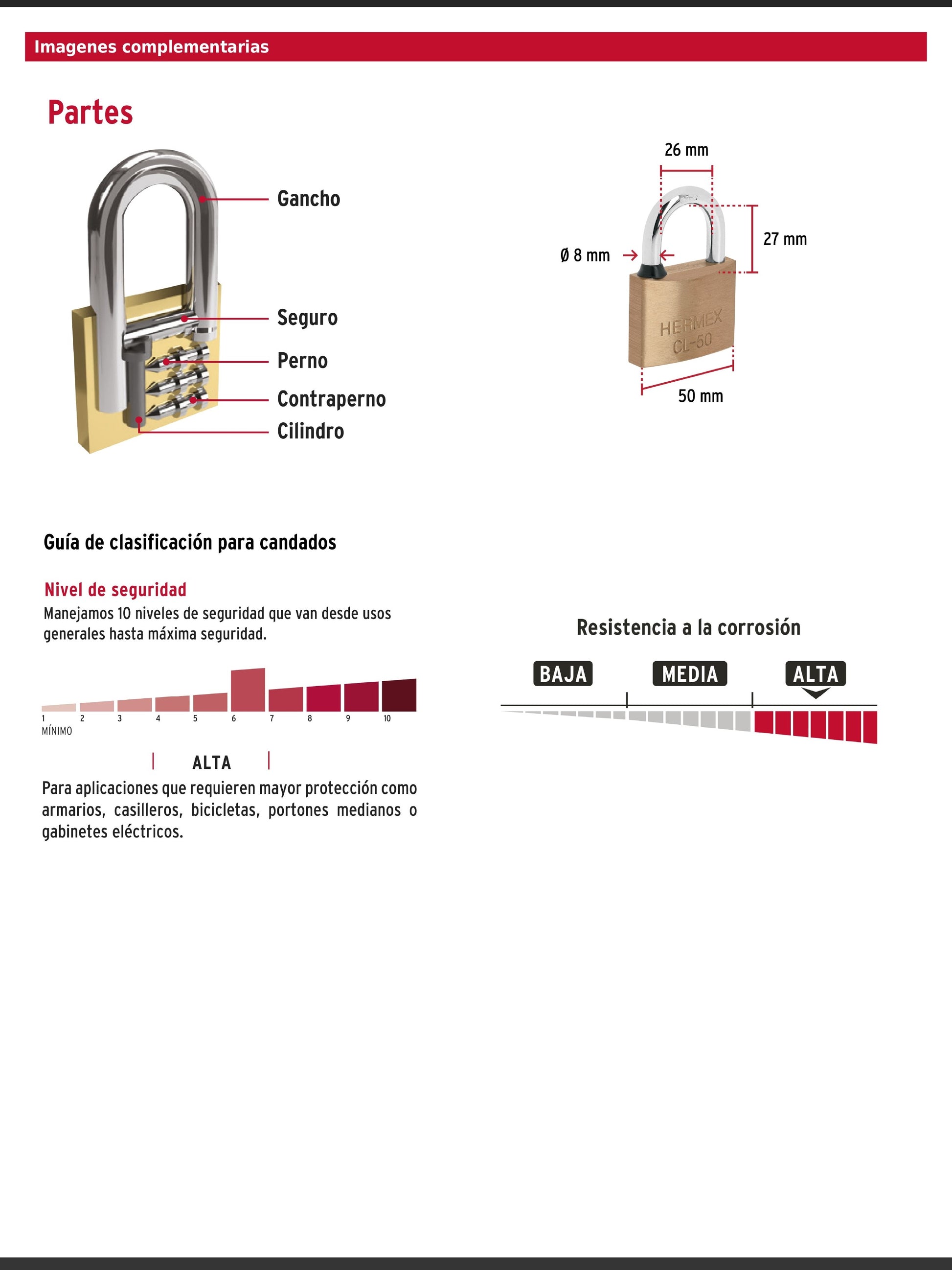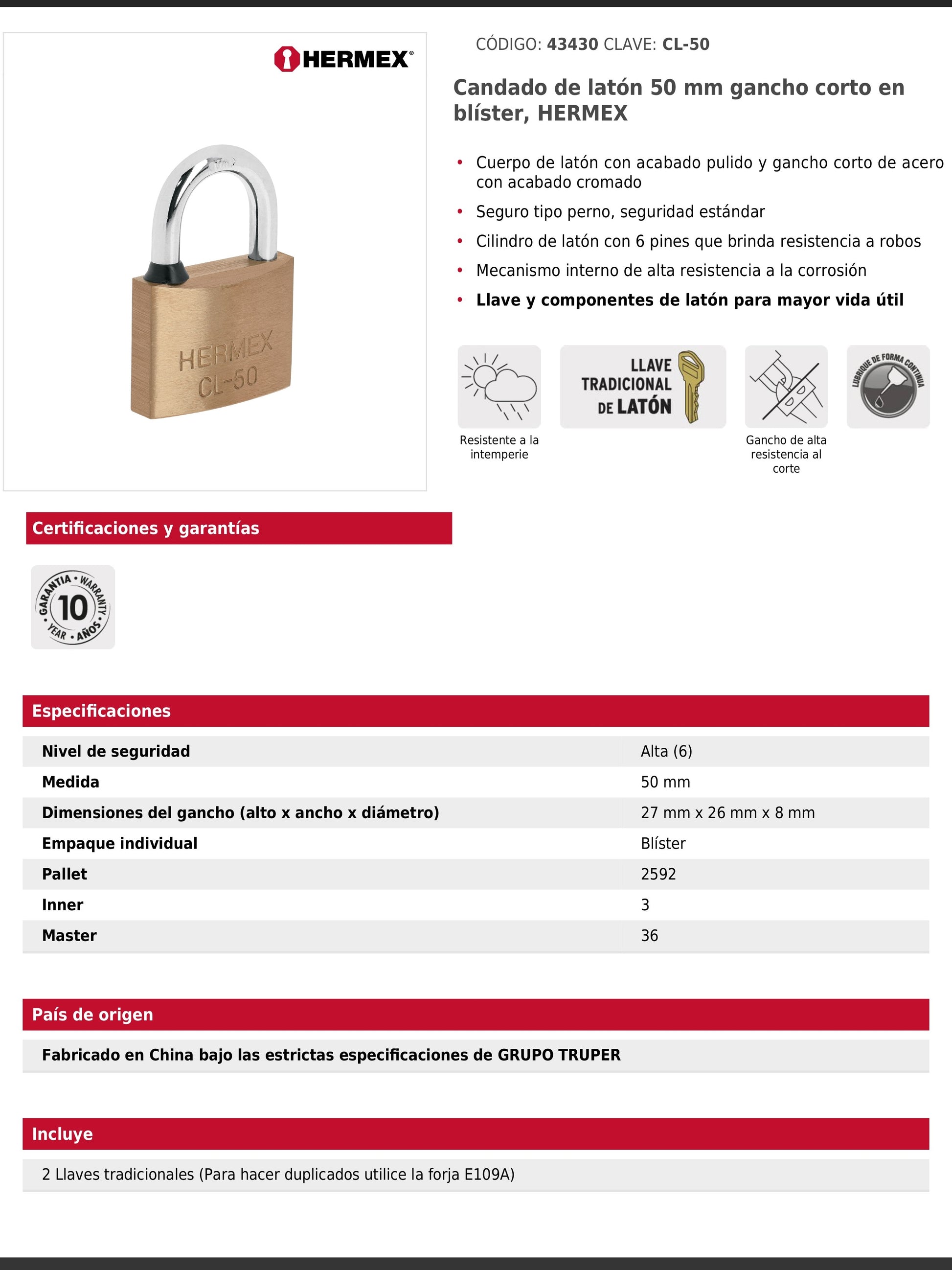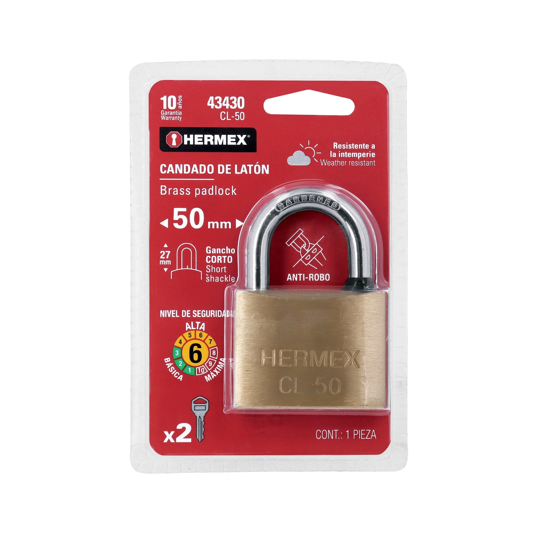 Candado con cuerpo de latón acabado pulido y gancho corto de acero cromado. Incluye seguro tipo perno de seguridad estándar y cilindro de latón con 6 pines que incrementa la resistencia a robos. Su mecanismo interno es altamente resistente a la corrosión, mientras que la llave y los componentes de latón proporcionan mayor vida útil. Es resistente a la intemperie y cuenta con gancho de alta resistencia al corte.