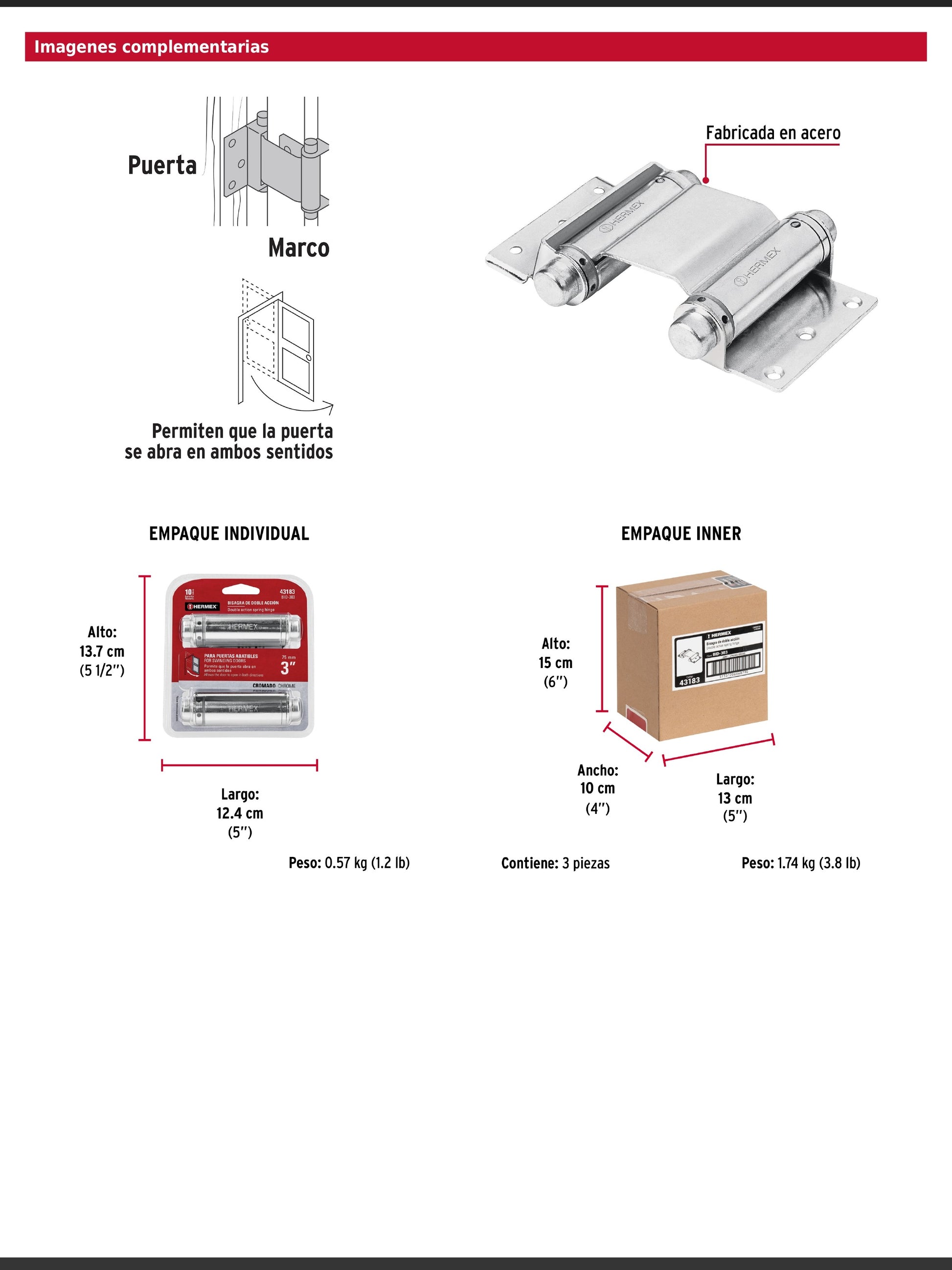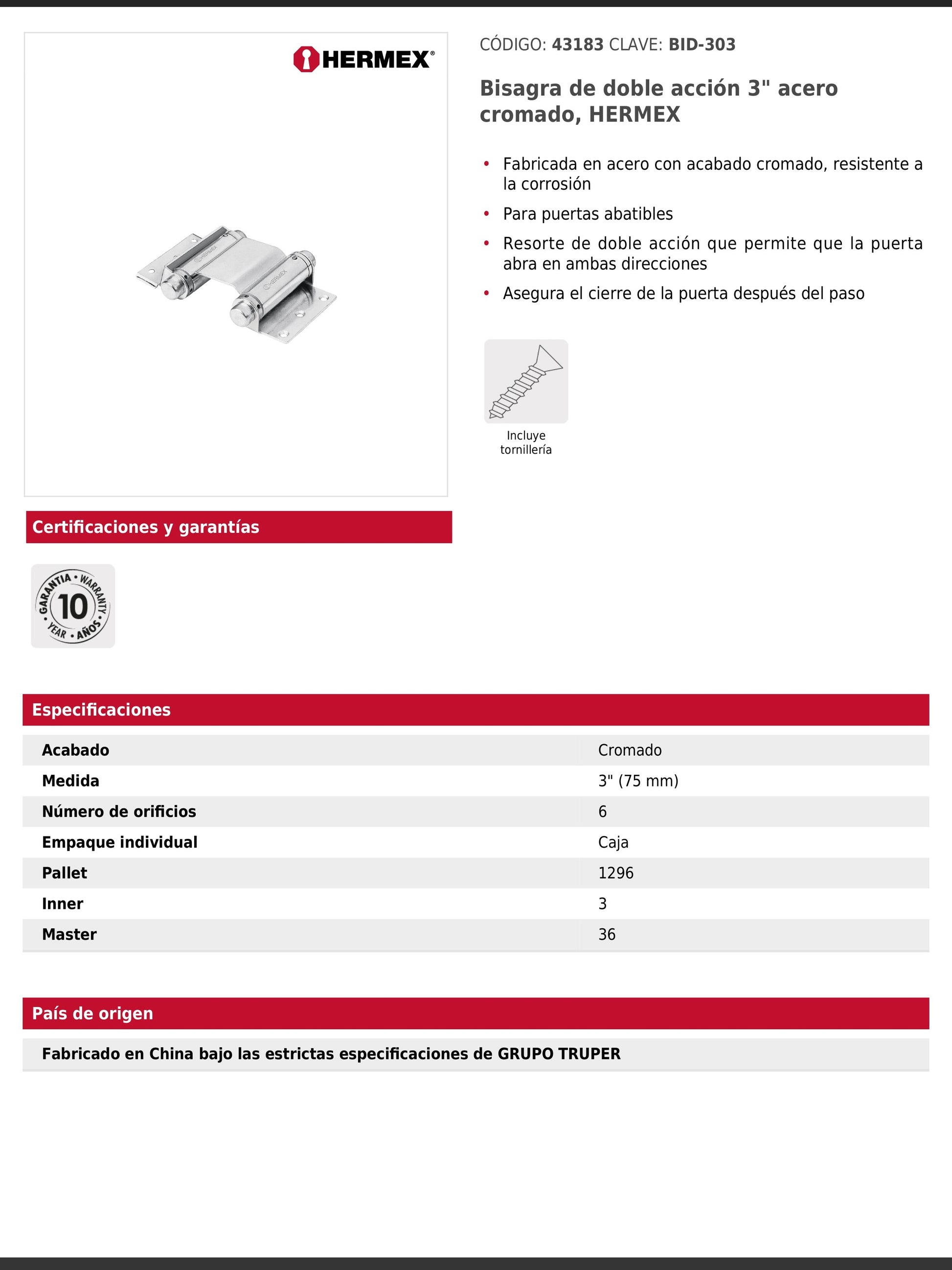 Bisagra fabricada en acero con acabado cromado resistente a la corrosión, diseñada especialmente para puertas abatibles. Cuenta con resorte de doble acción que permite abrir en ambas direcciones y garantiza el cierre automático después del paso. Incluye tornillería para su instalación.