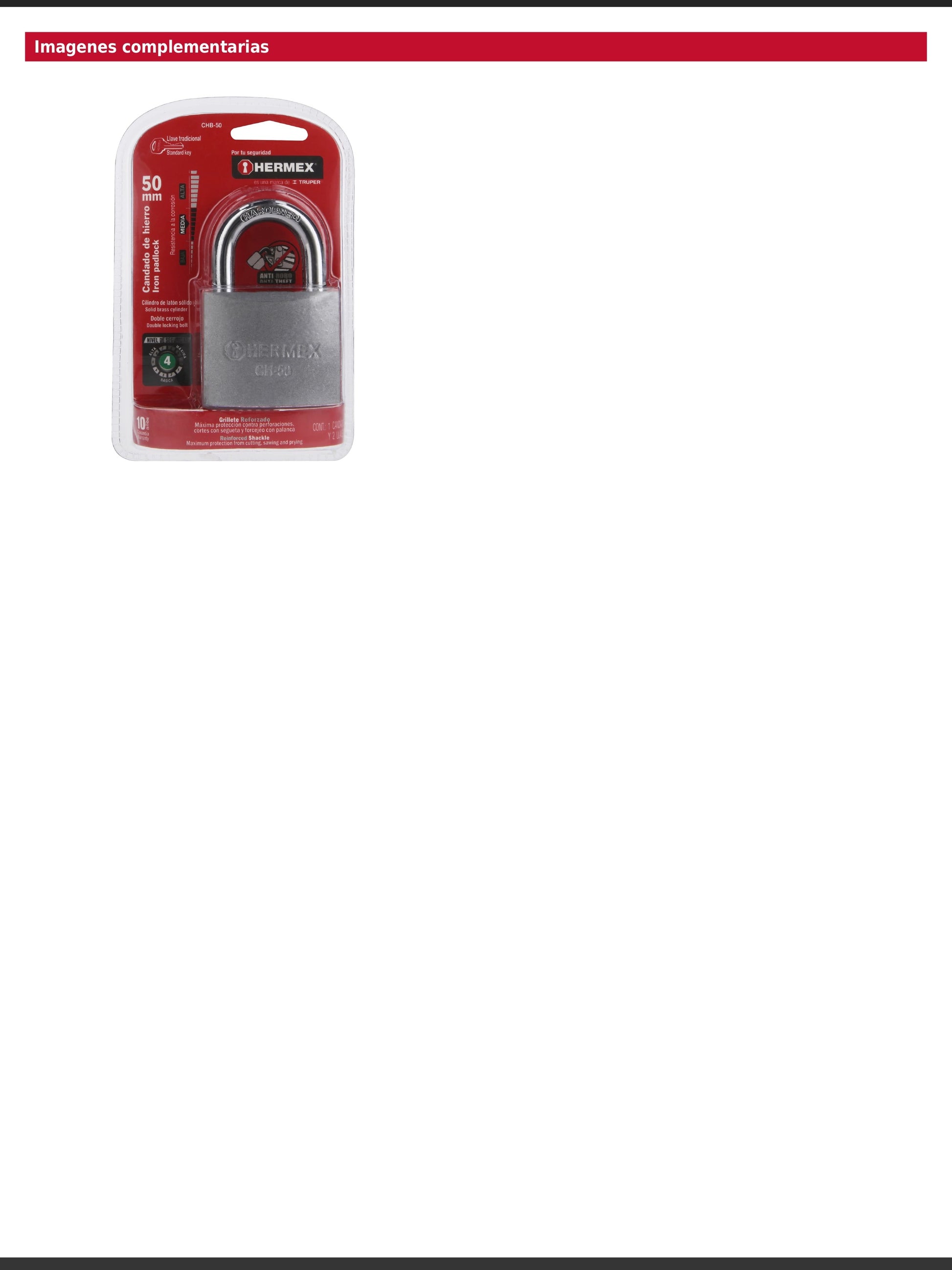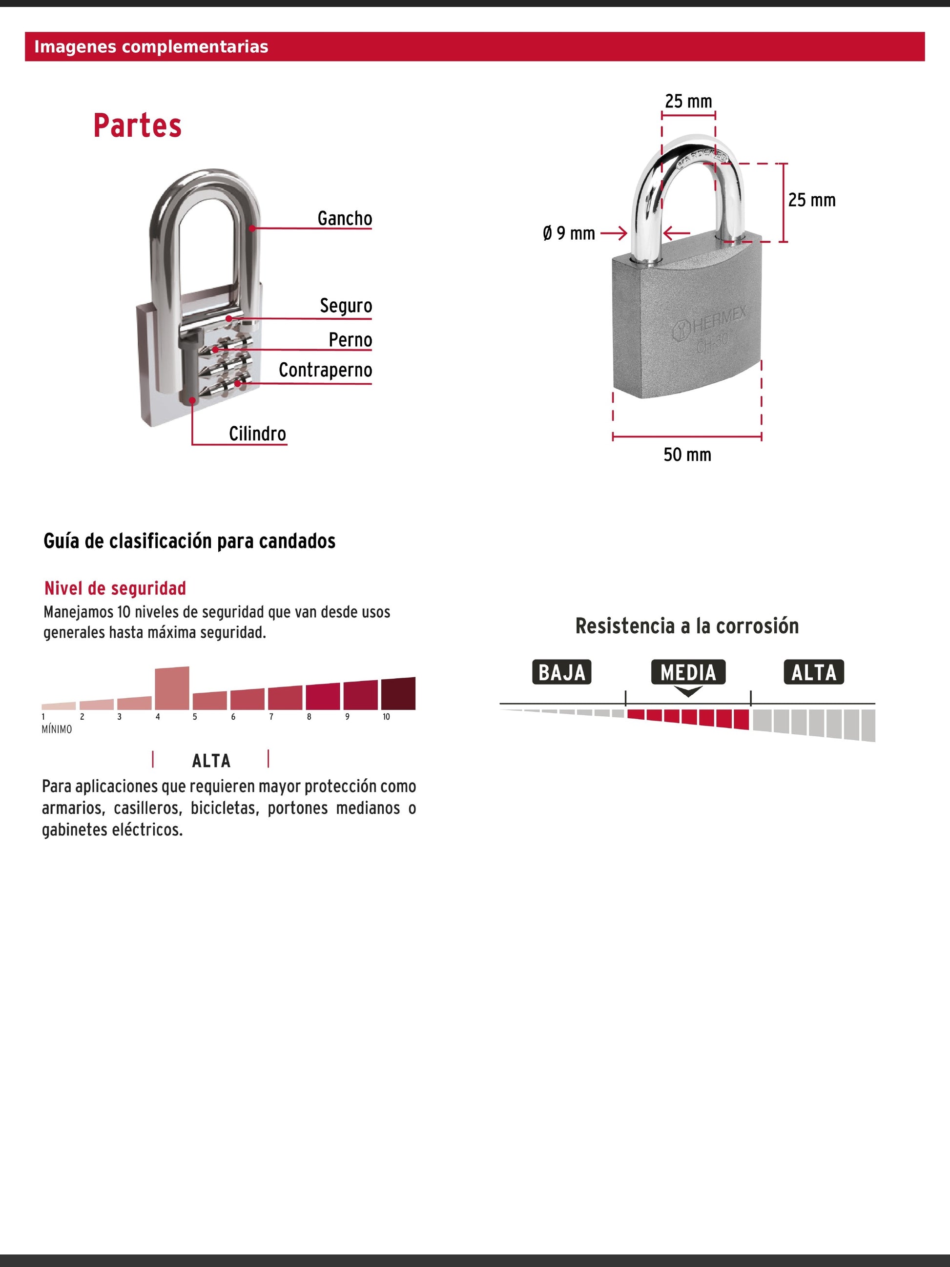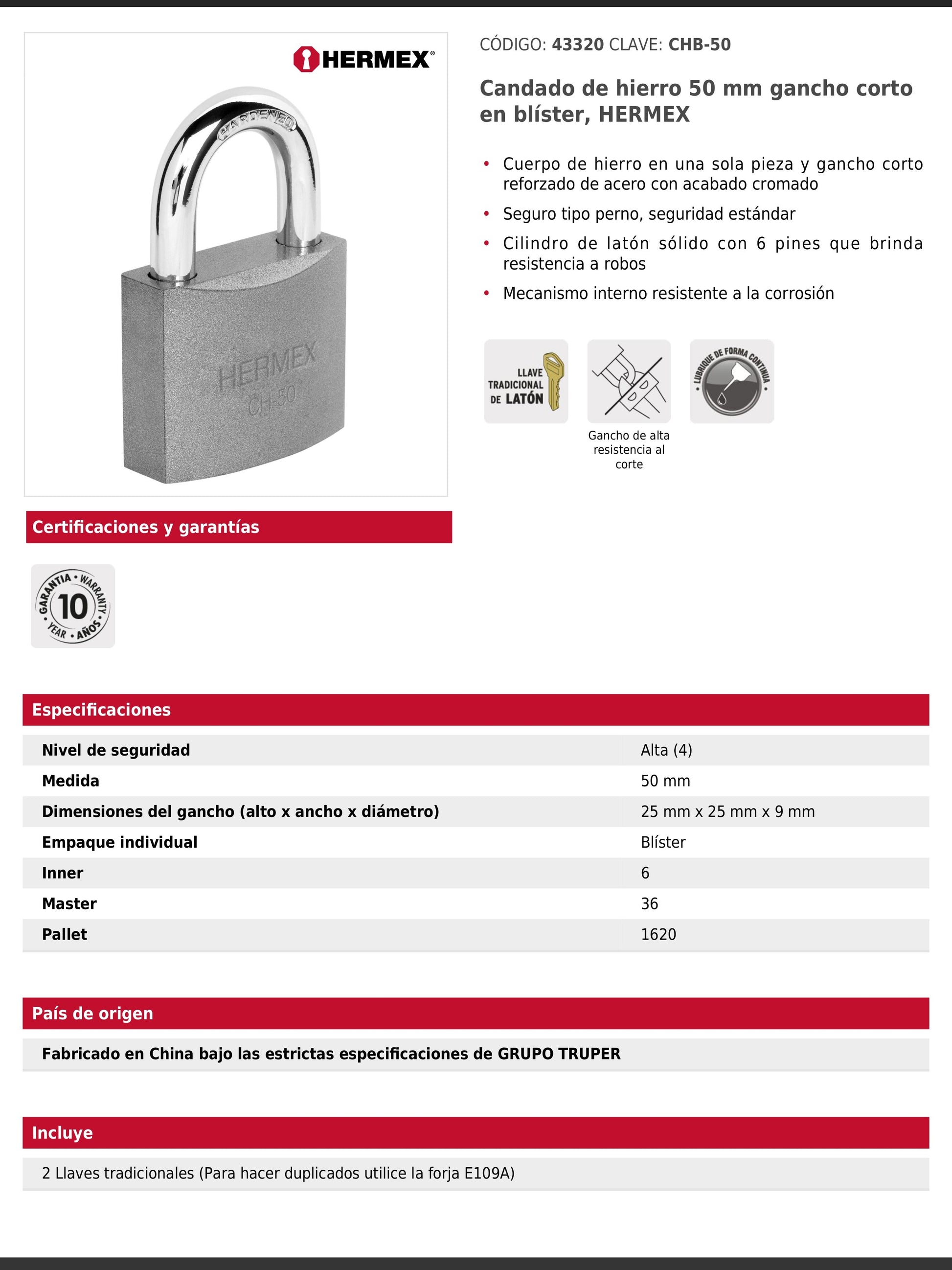 Candado de hierro en una sola pieza con gancho corto reforzado de acero cromado. Incorpora seguro tipo perno estándar y cilindro de latón sólido con 6 pines que brindan resistencia a robos. Su mecanismo interno es resistente a la corrosión para mayor durabilidad.