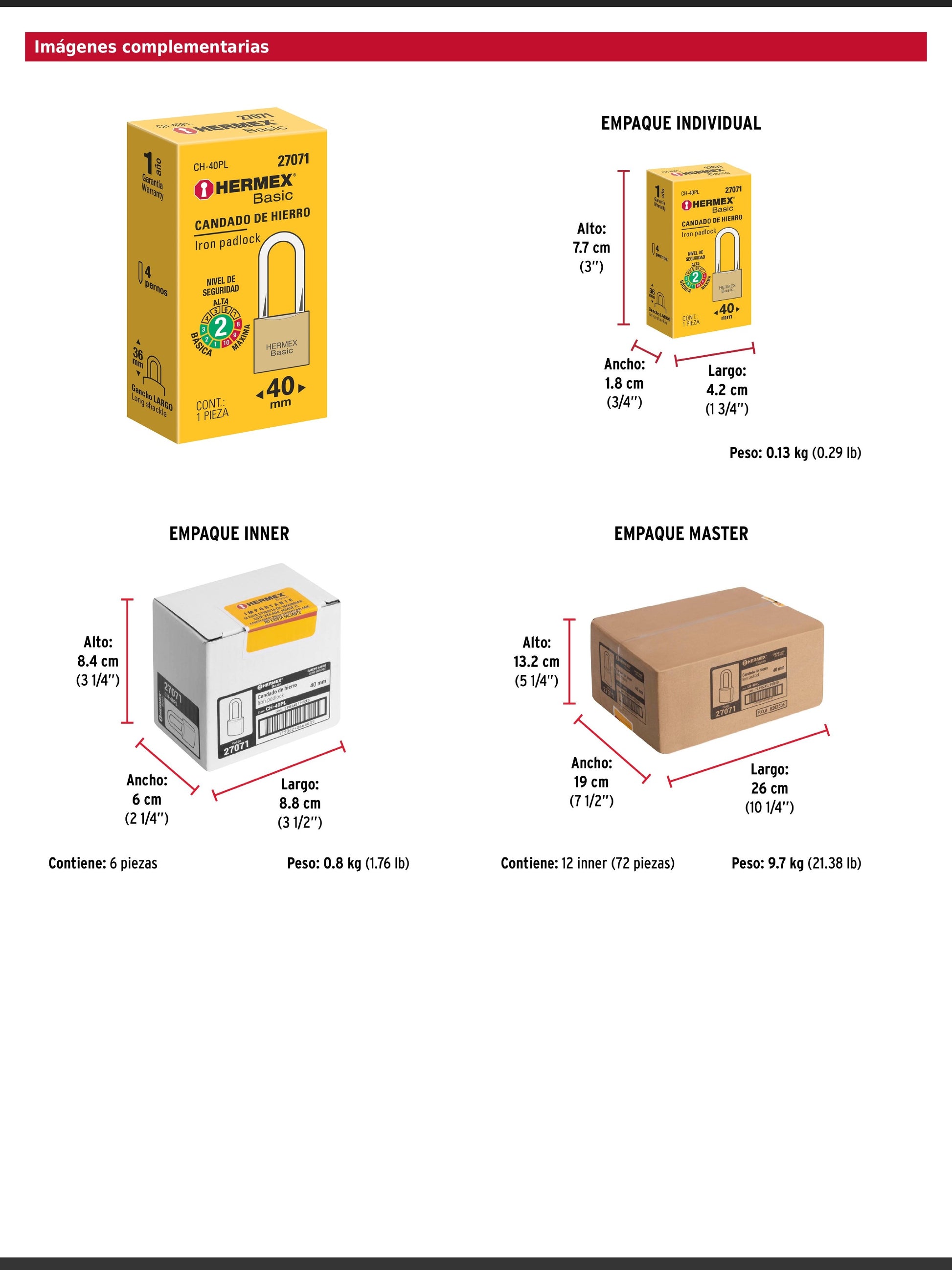 Candado de hierro con acabado latón y gancho largo de acero cromado, diseñado para brindar un nivel de seguridad básica. Cuenta con un cilindro metálico de 4 pines y seguro tipo perno estándar que ofrecen mayor resistencia a robos. Su mecanismo interno es resistente a la corrosión e incluye 2 llaves tradicionales. Se presenta en empaque individual tipo caja.