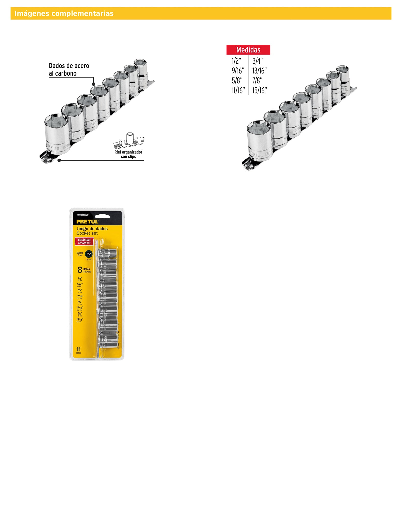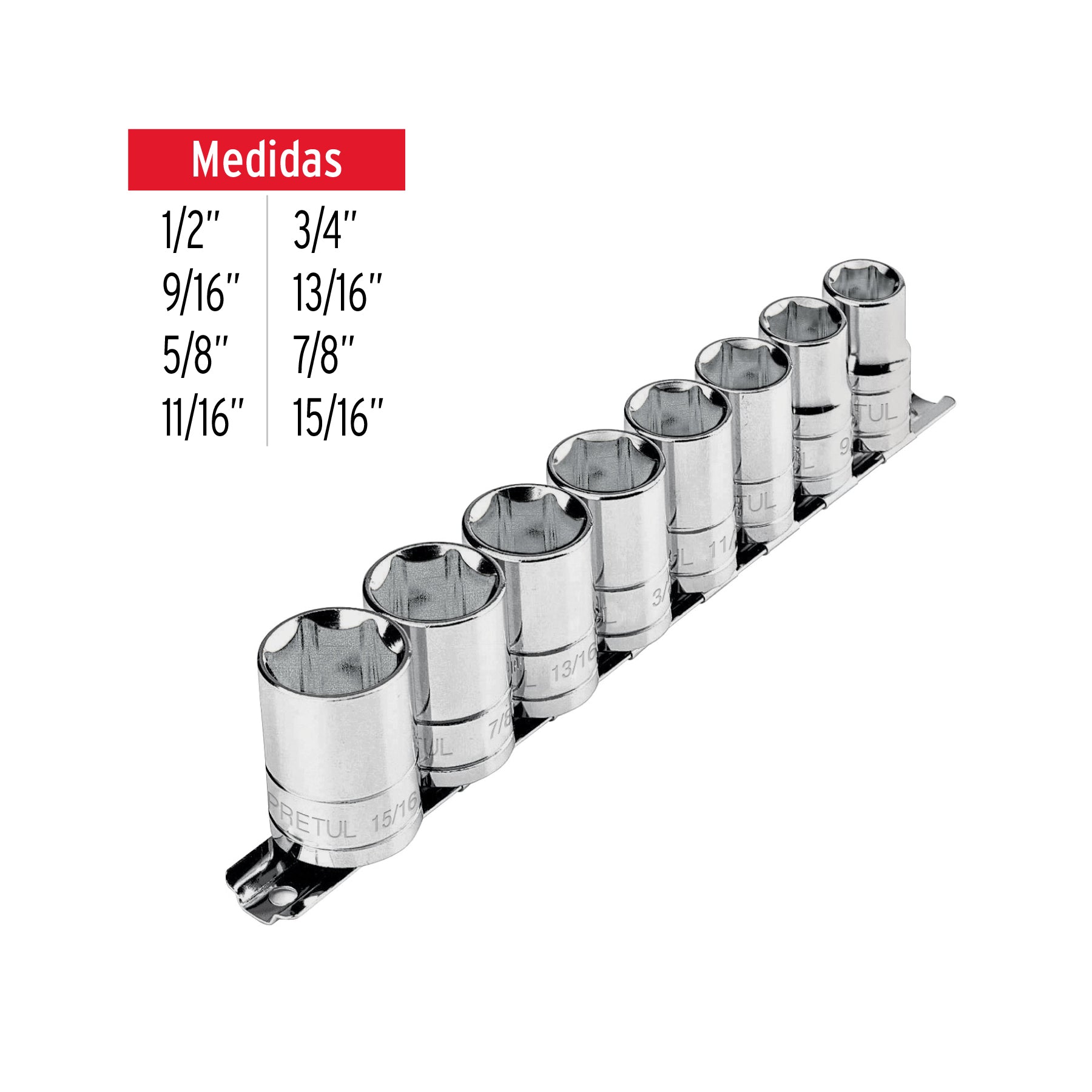 - Incluye 8 dados: 1/2", 9/16", 5/8", 11/16", 3/4", 13/16", 7/8" y 15/16".