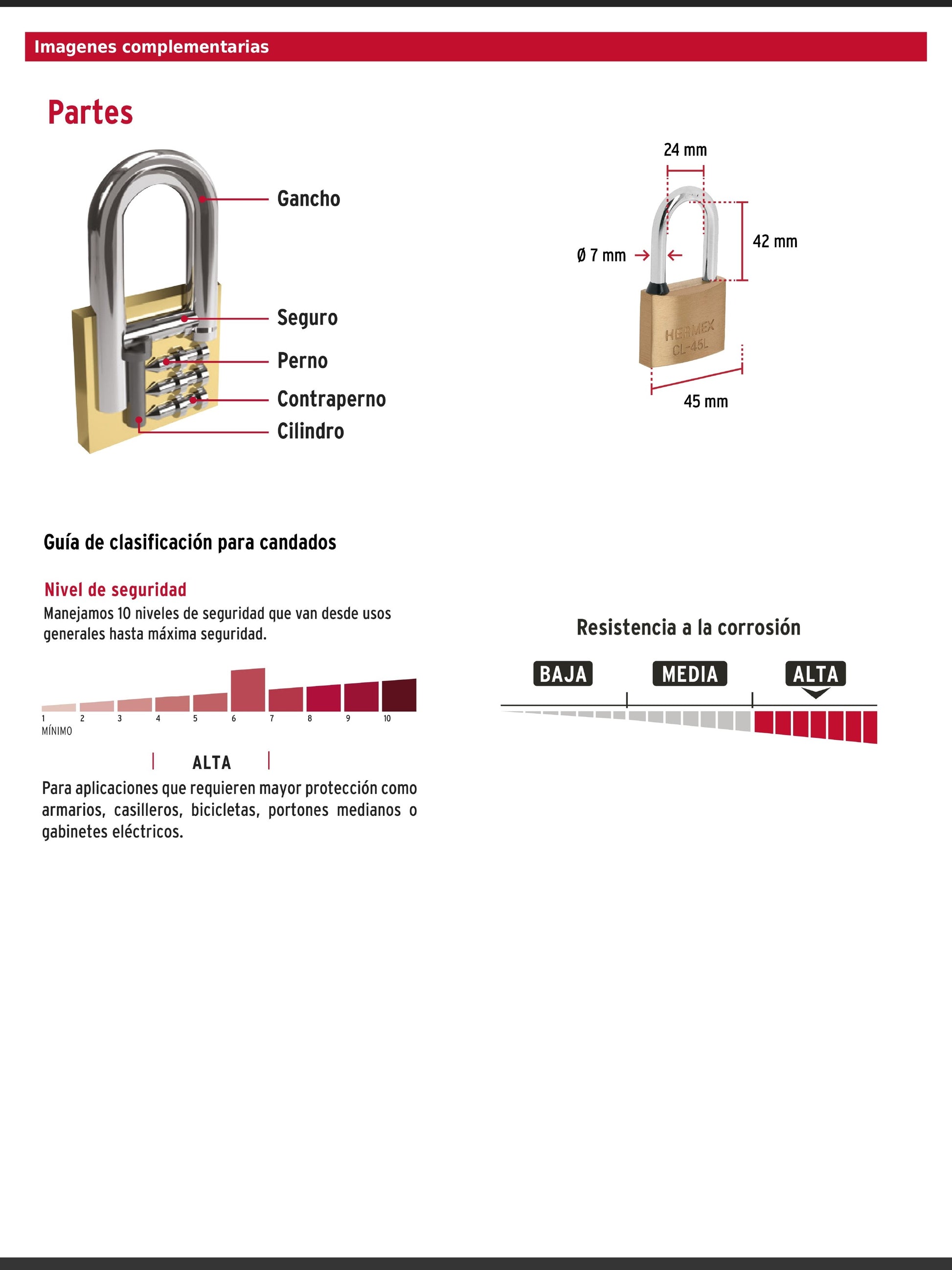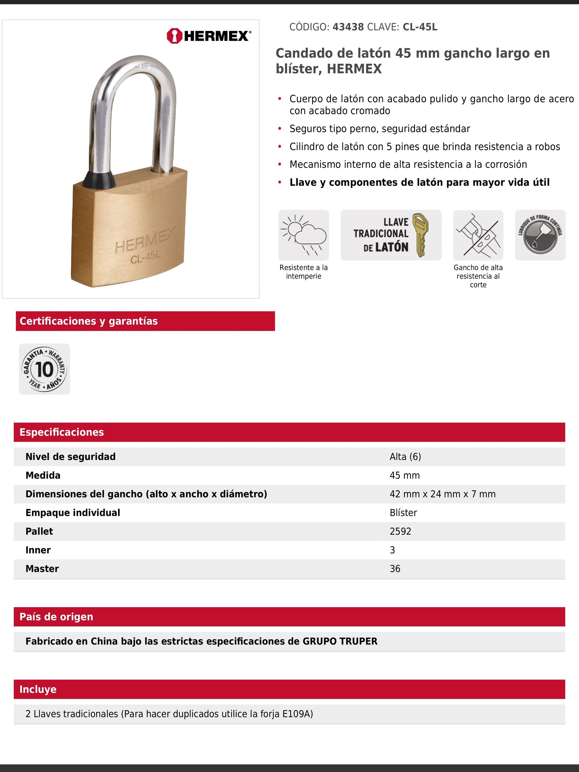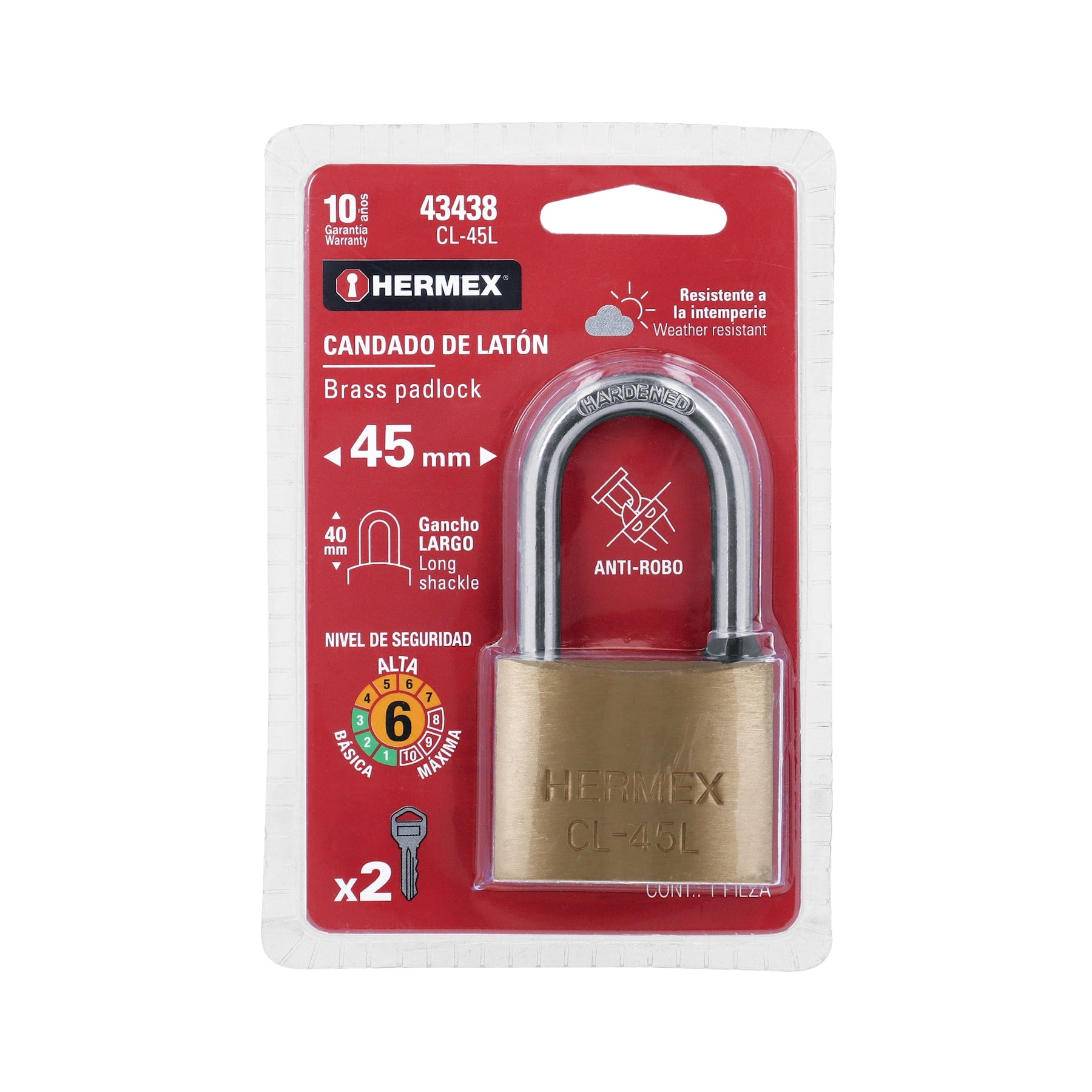 Candado con cuerpo de latón acabado pulido y gancho largo de acero cromado. Cuenta con seguros tipo perno de seguridad estándar y un cilindro de latón con 5 pines que brinda resistencia a robos. Su mecanismo interno ofrece alta resistencia a la corrosión y los componentes de latón, junto a la llave tradicional, proporcionan mayor vida útil. Es resistente a la intemperie y dispone de gancho de alta resistencia al corte.