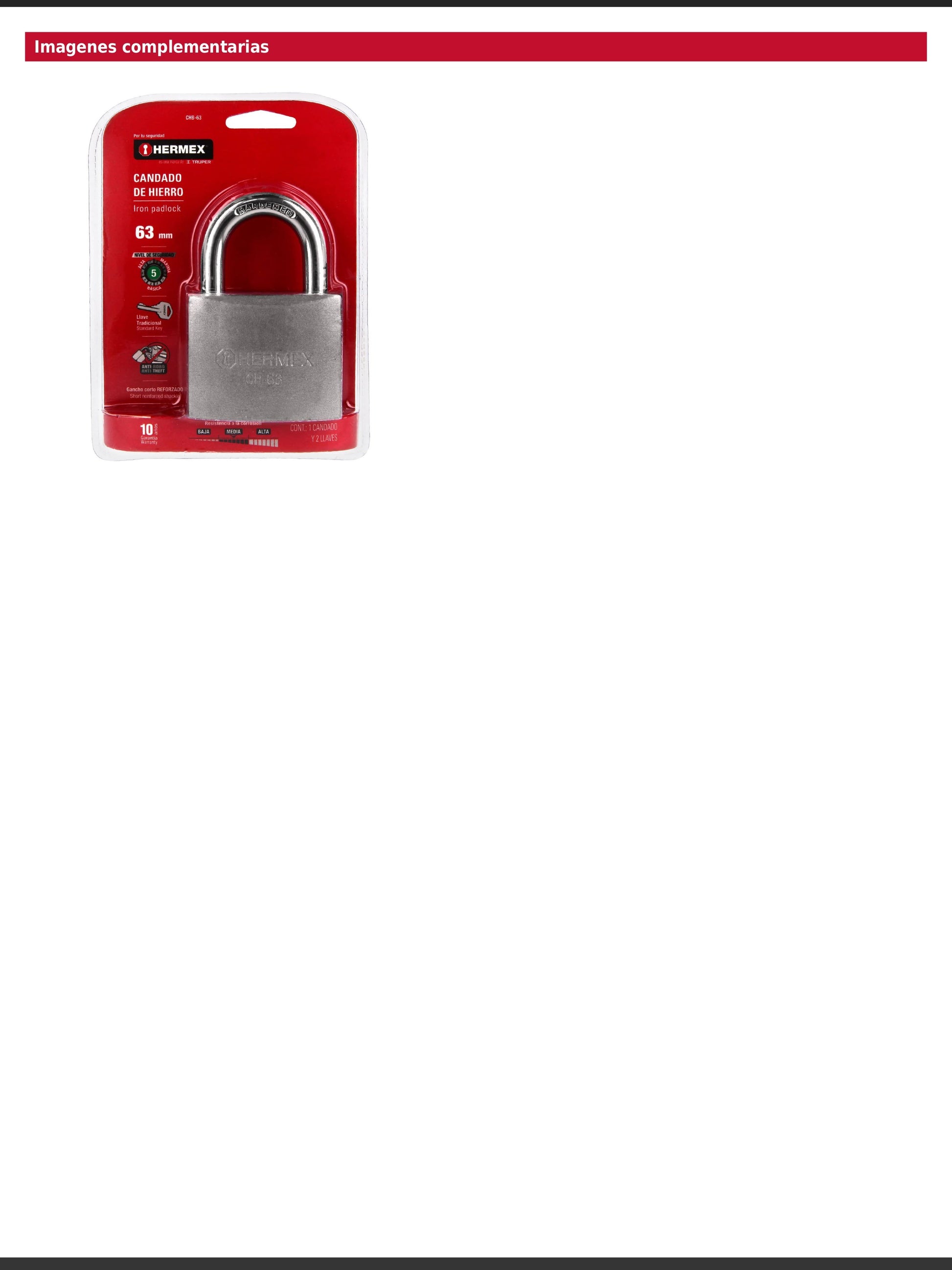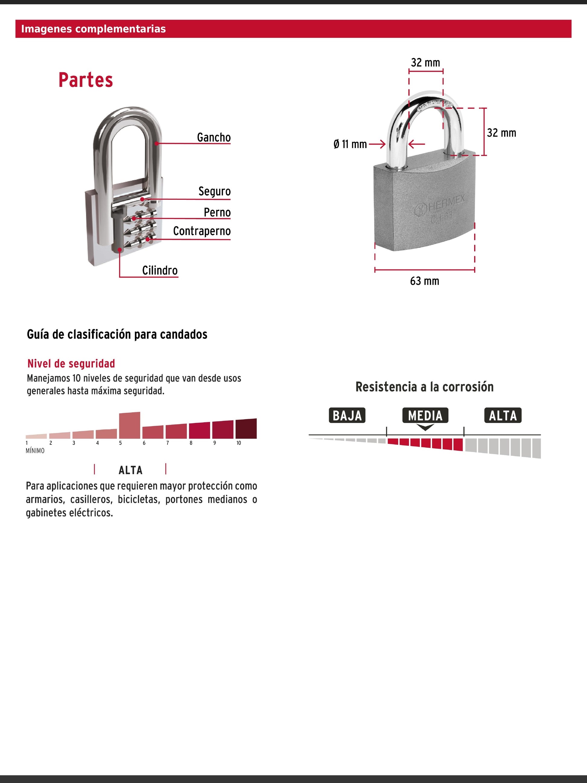 Candado de hierro en una sola pieza con gancho corto reforzado de acero cromado. Cuenta con seguro tipo perno estándar y cilindro de latón sólido con 6 pines que brindan resistencia a robos. Su mecanismo interno es resistente a la corrosión para mayor durabilidad.