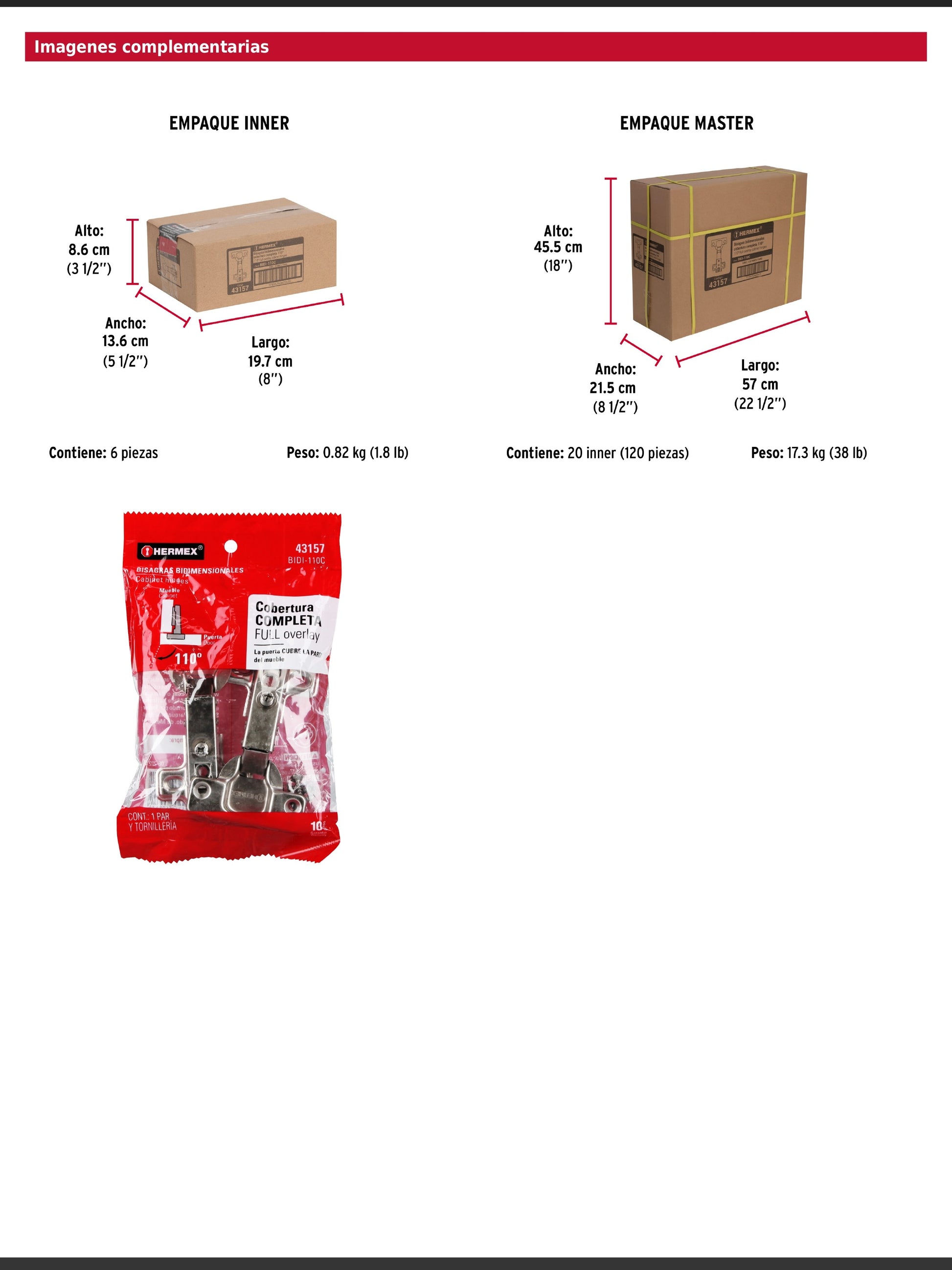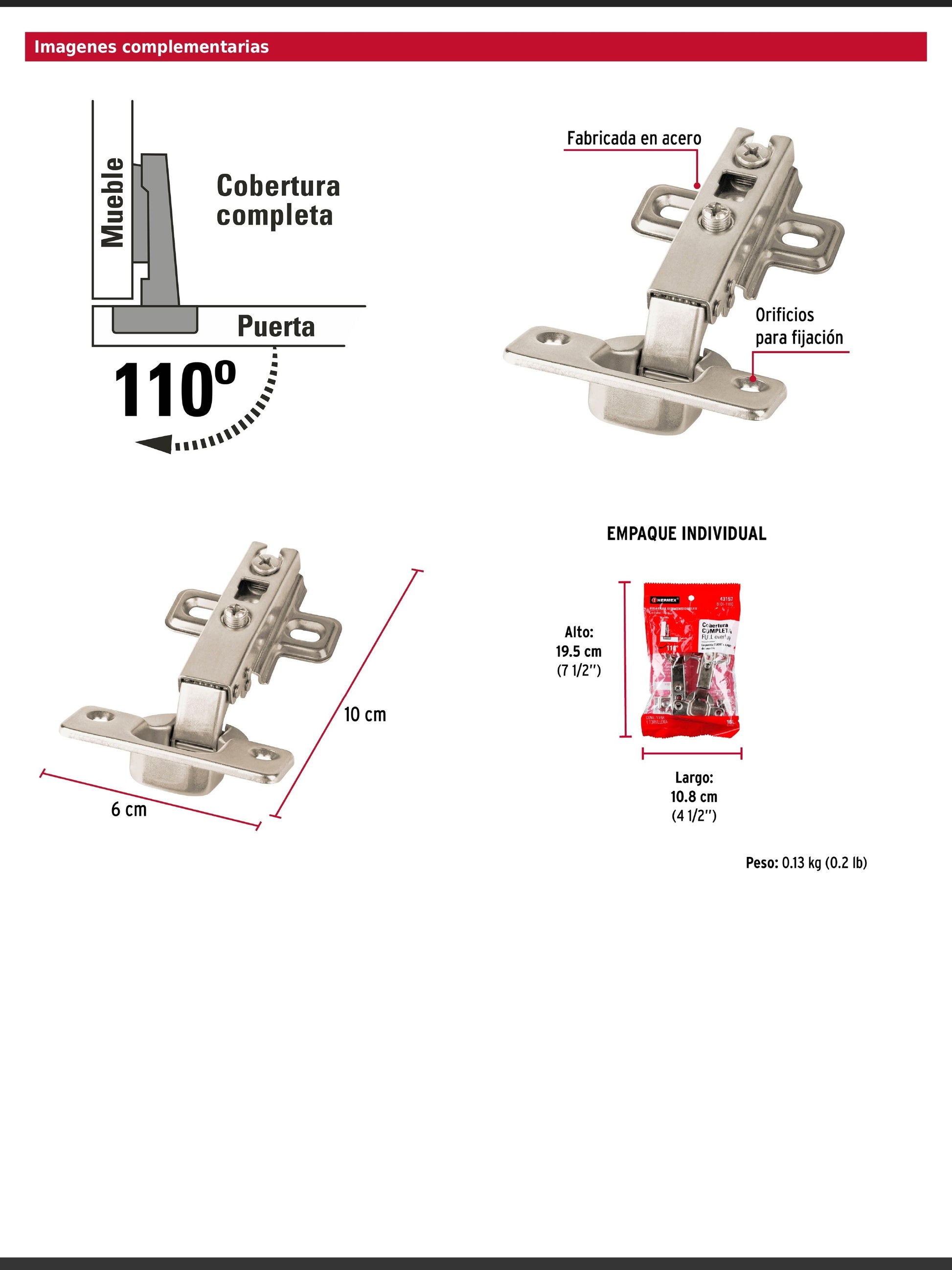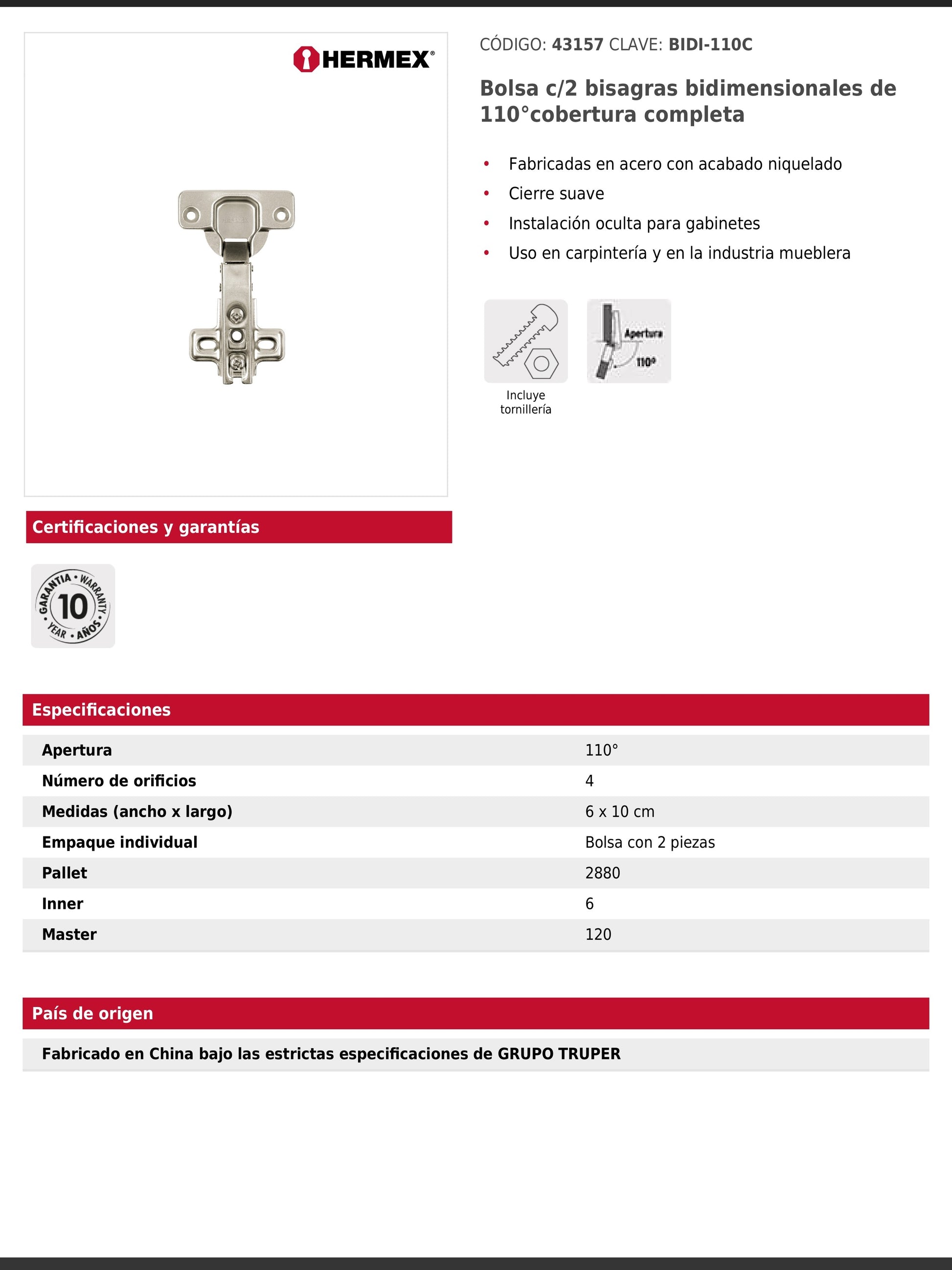 Bisagras fabricadas en acero con acabado niquelado, diseñadas con cierre suave y sistema de instalación oculta para gabinetes. Son ideales para carpintería y la industria mueblera, además incluyen tornillería para su colocación.