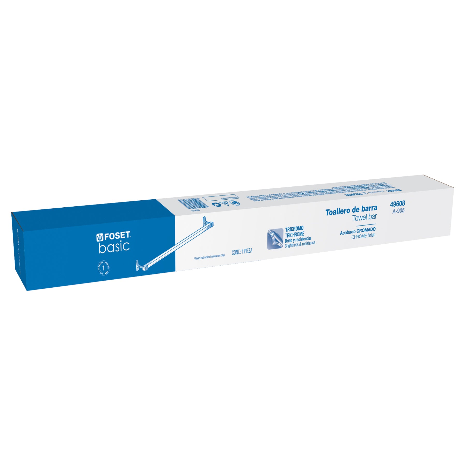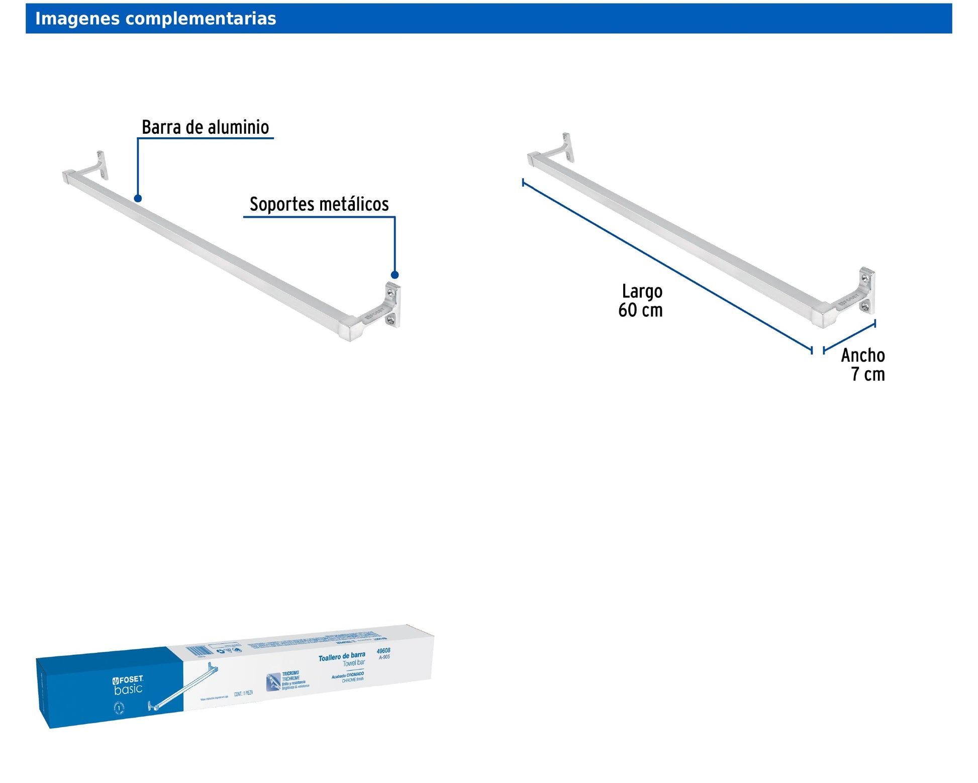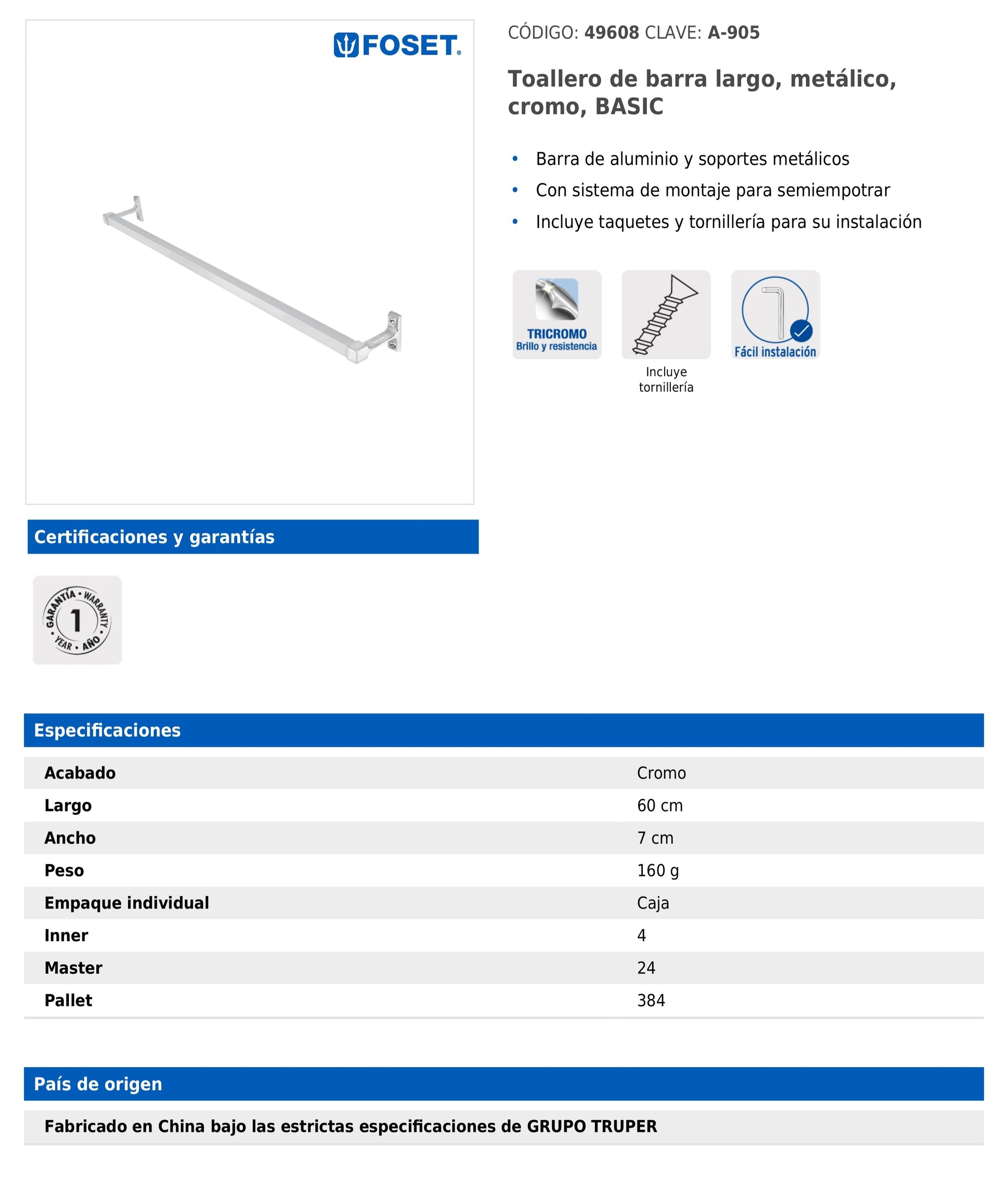 Este toallero de barra está fabricado con una combinación de aluminio y soportes metálicos, con acabado cromado brillante. Su sistema de montaje semiempotrar incluye taquetes y tornillería, lo que facilita su instalación en cualquier tipo de baño. Ideal para mantener el orden con un diseño funcional y elegante.