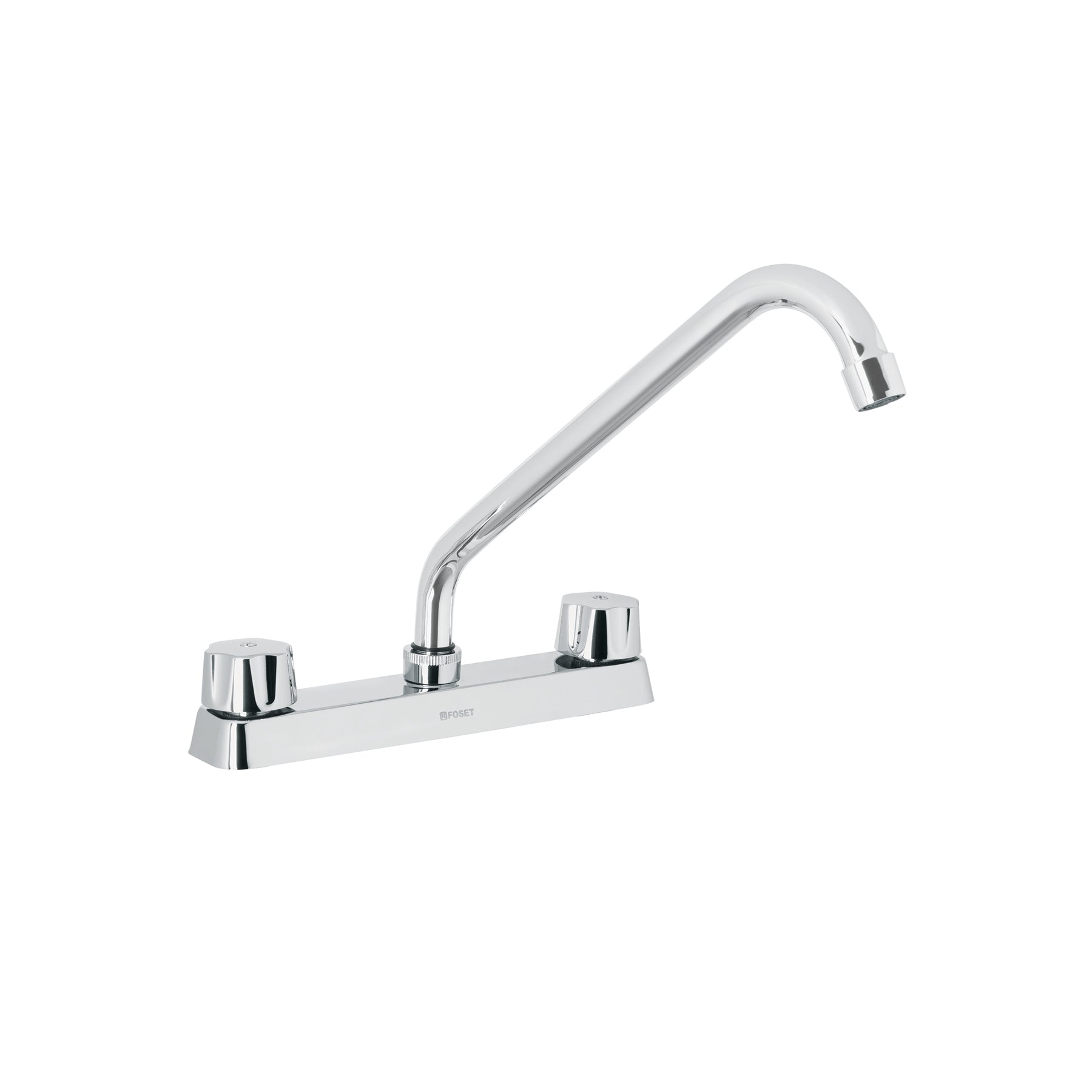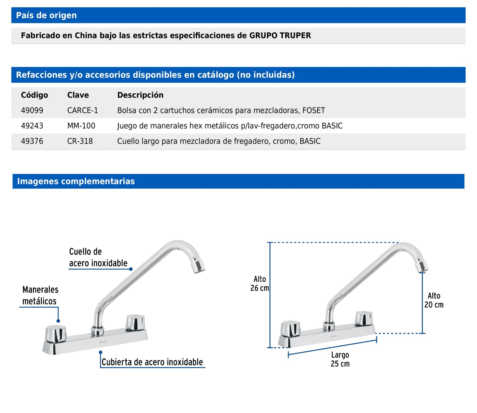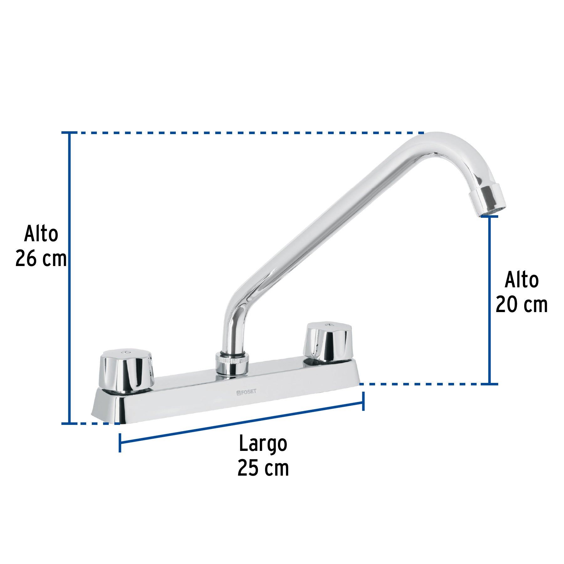 Mezcladora Foset Basic para fregadero con distancia de 8" entre taladros. Fabricada con cuerpo de latón y cuello de acero inoxidable para máxima duración. Incorpora manerales metálicos hexagonales y cartucho cerámico de 1/4 de vuelta para apertura suave y precisa. Ideal para uso doméstico en zonas húmedas.