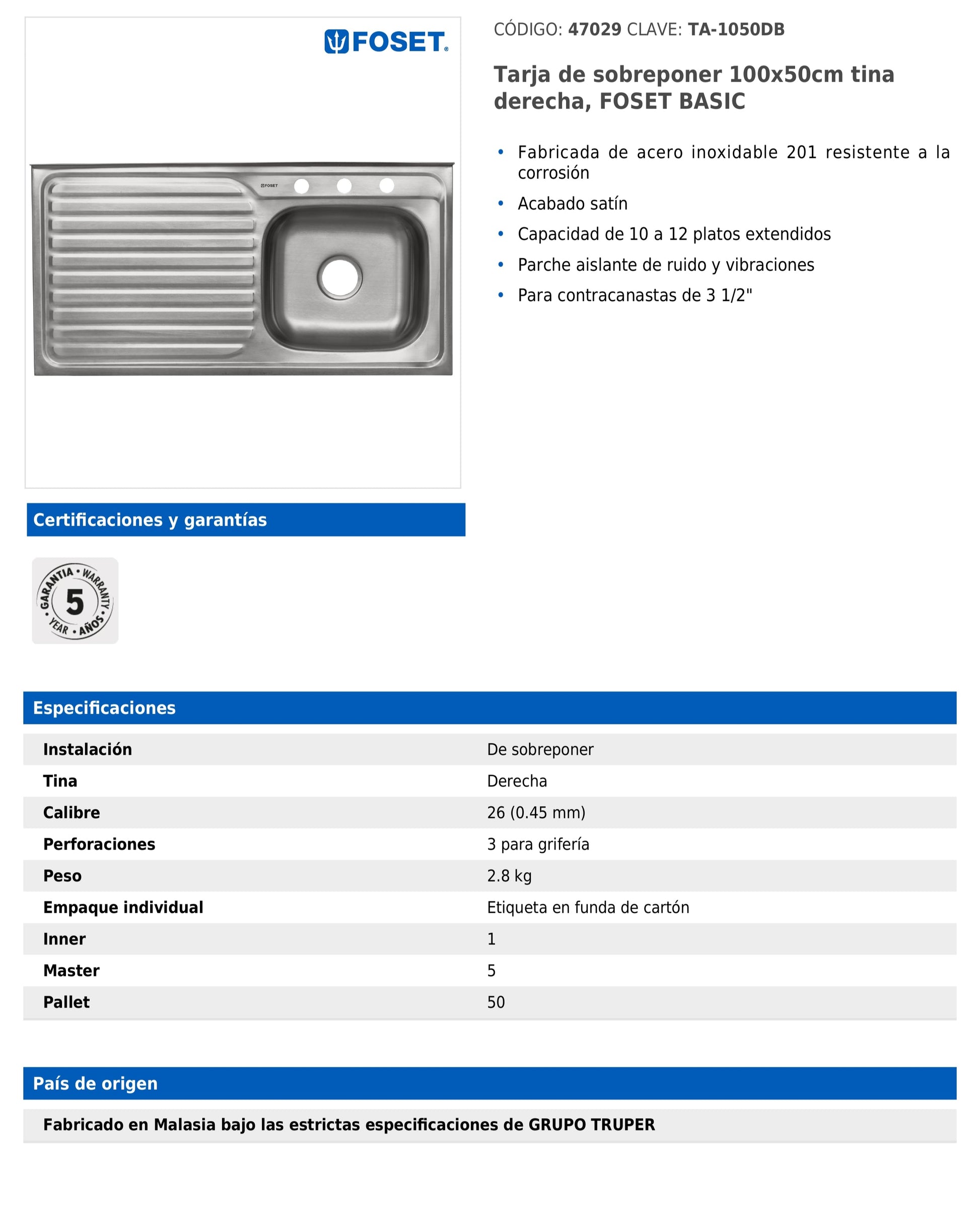 Fabricada en acero inoxidable 201, resistente a la corrosión. Cuenta con acabado satín, capacidad para 10 a 12 platos extendidos, parche aislante que reduce ruido y vibraciones, y es compatible con contracanastas de 3 1/2".