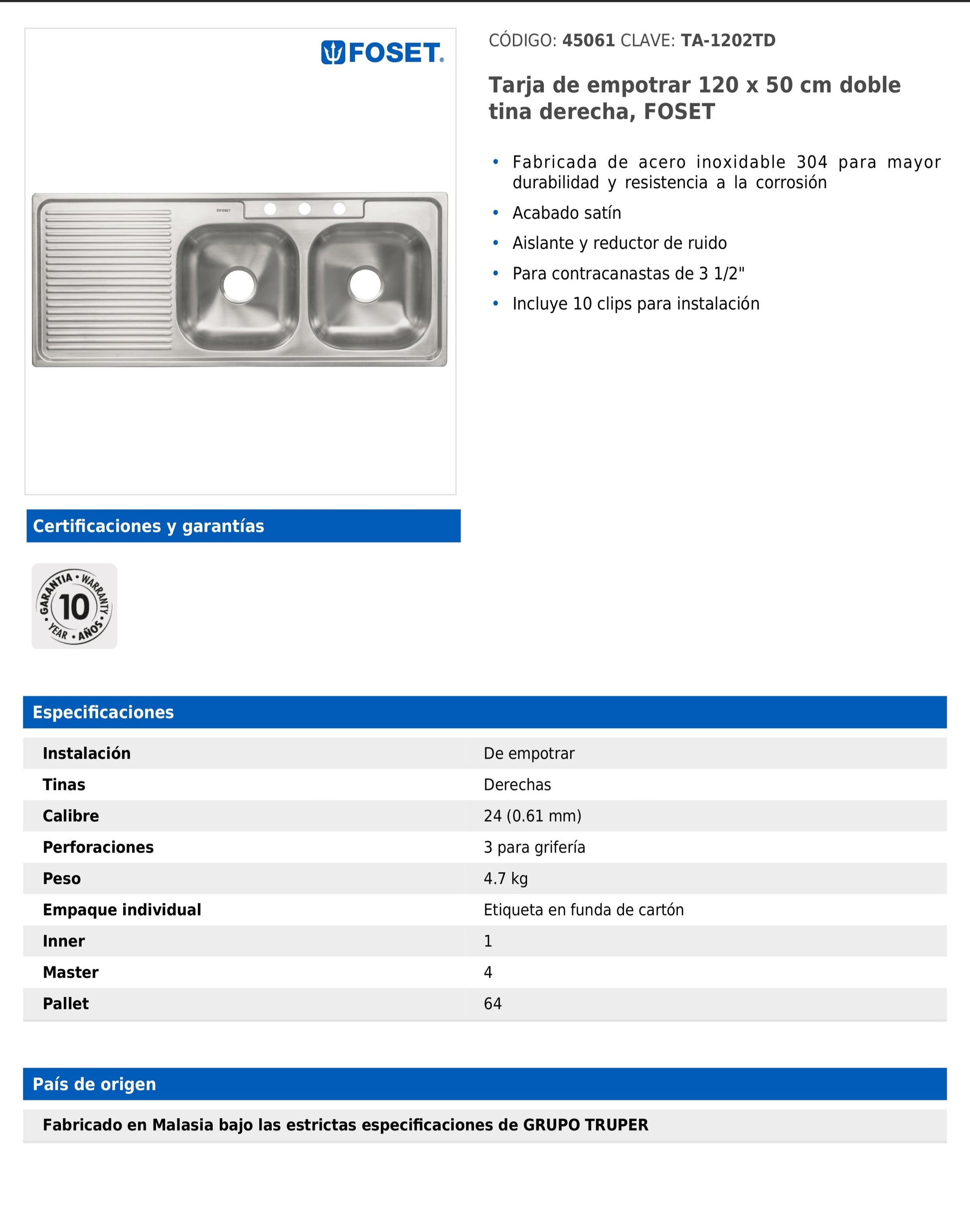 Fabricada en acero inoxidable 304 para mayor durabilidad y resistencia a la corrosión. Cuenta con acabado satín, aislante reductor de ruido y diseño con tinas derechas. Es compatible con contracanastas de 3 1/2" e incluye 10 clips para instalación.