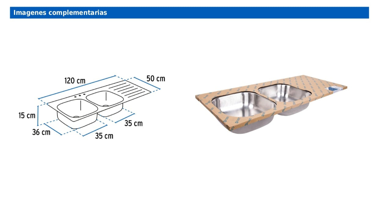 Fabricada en acero inoxidable 201, resistente a la corrosión. Cuenta con acabado satín, aislante reductor de ruido y diseño con tinas izquierdas. Es compatible con contracanastas de 3 1/2" e incluye 10 clips para instalación.